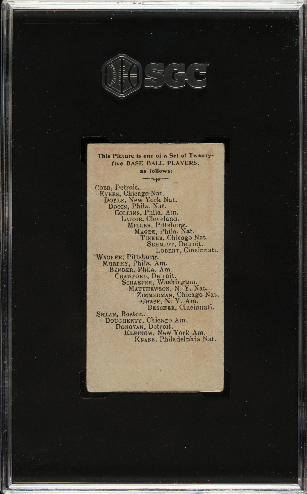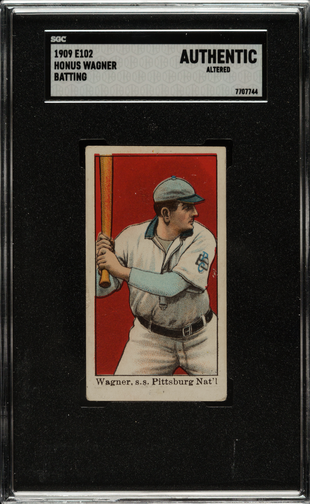 This rare E102 "Set of 25" candy card features the legendary Honus Wagner in a classic batting pose. The manufacturer of E102 is unknown. The batting pose of Wagner on this card is identical to that found in several rare sets of the era including T216 Kotton Tobacco and E101 "Set of 50." This example offers outstanding centering with bold colors, excellent registration, and light corner wear. Encapsulated “Authentic - Altered” by SGC due to a couple pinholes that have been filled in. In 1909, Wagner led the league in every major batting category including batting average, on-base percentage, total bases and RBIs. This is a very appealing example of one of Honus Wagner's most classic cards, issued when he was "King of the Diamond."