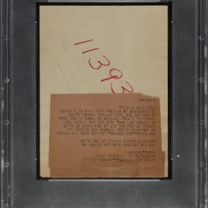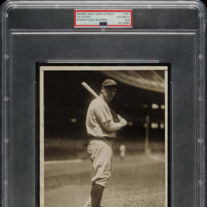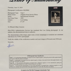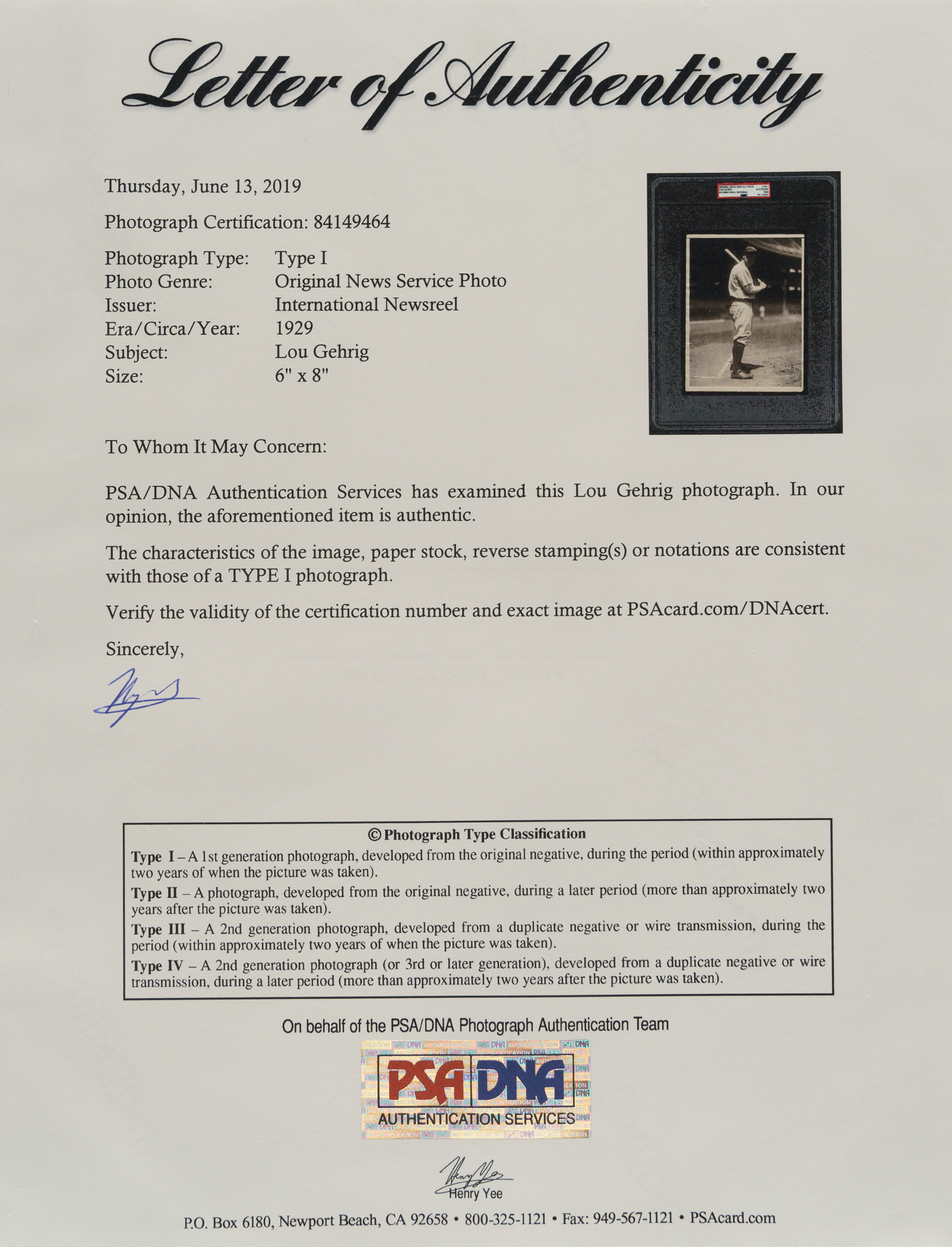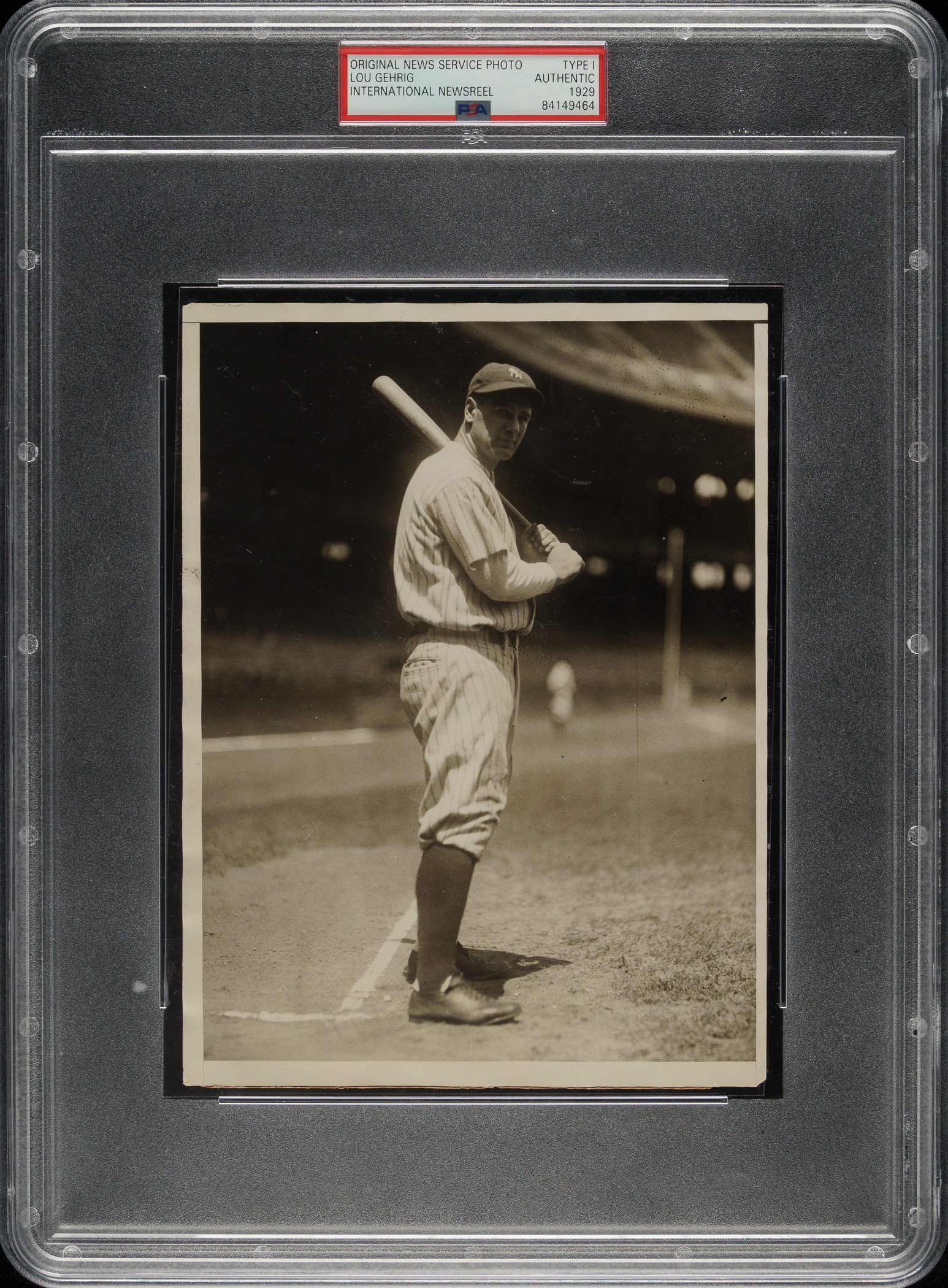Original news photo of New York Yankees Hall of Famer Lou Gehrig. Encapsulated and certified as an original Type I photograph by PSA/DNA. Gehrig is pictured holding a bat as he poses on the field at Yankee Stadium in 1929. An "International News Photos Inc." credit stamp is on the reverse along with the original paper news caption dated "7-2-29." As noted in the caption, Gehrig was the American League leader in home runs with 21 at the time of the photograph, but once again he was overtaken by teammate Babe Ruth, who led the league with 46. The photo (6 x 8 inches) has light rippling throughout, two tiny corner chips (upper left and lower right), and the paper caption on the reverse is reattached with clear tape. In Good to Very Good condition overall. Full LOA from PSA/DNA.