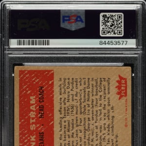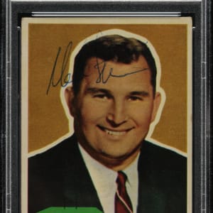 Signed example of Dallas Texans Hall of Famer Hank Stram's rookie card from the 1960 Fleer football series. Stram has signed the card in blue ink on the front. PSA/DNA has encapsulated the card, certifying both the card and signature as "Authentic." This is one of only four signed examples certified by PSA/DNA. Fair condition overall largely due to several tiny spots of paper loss on the reverse. A very attractive signed rookie card of this legendary football coach.