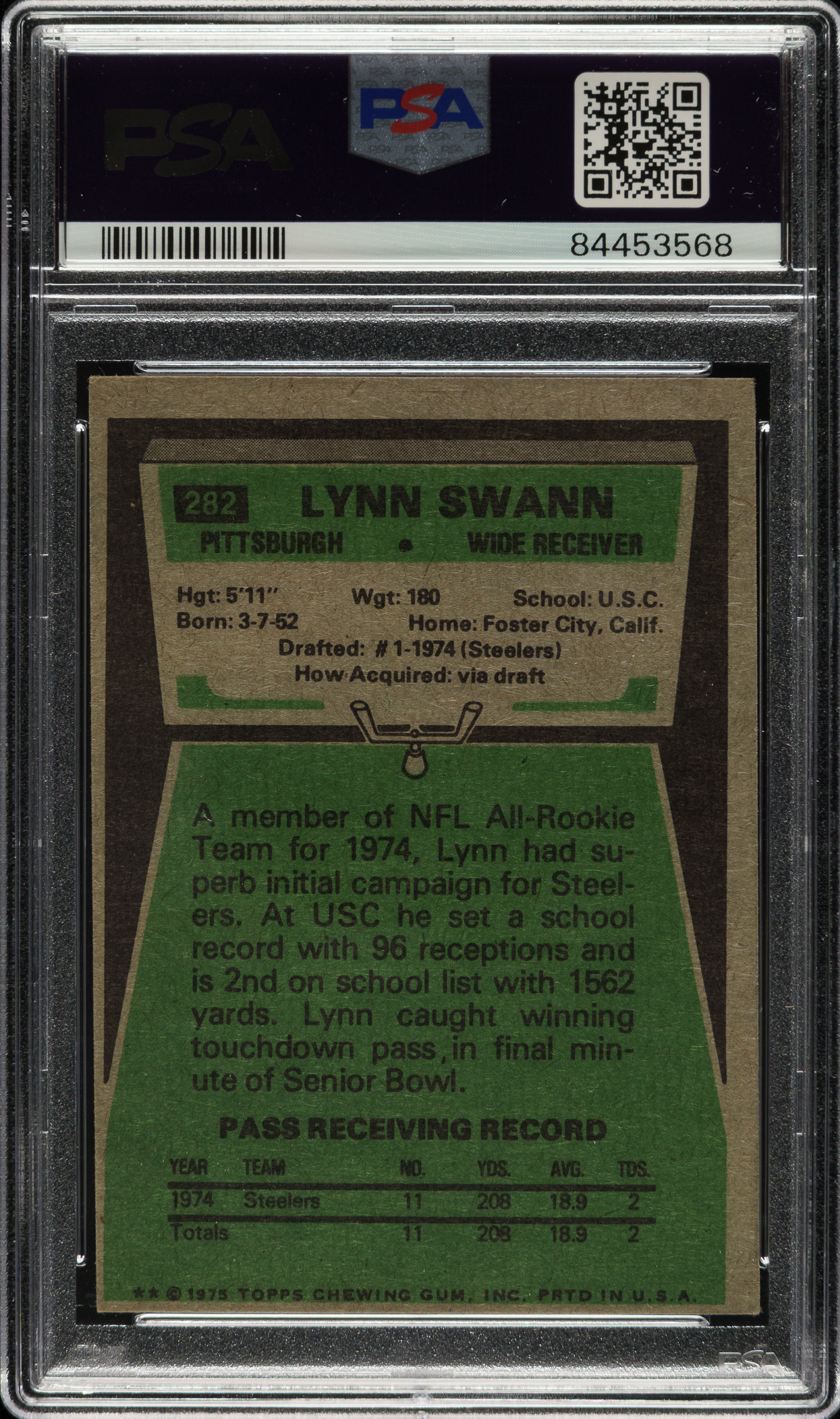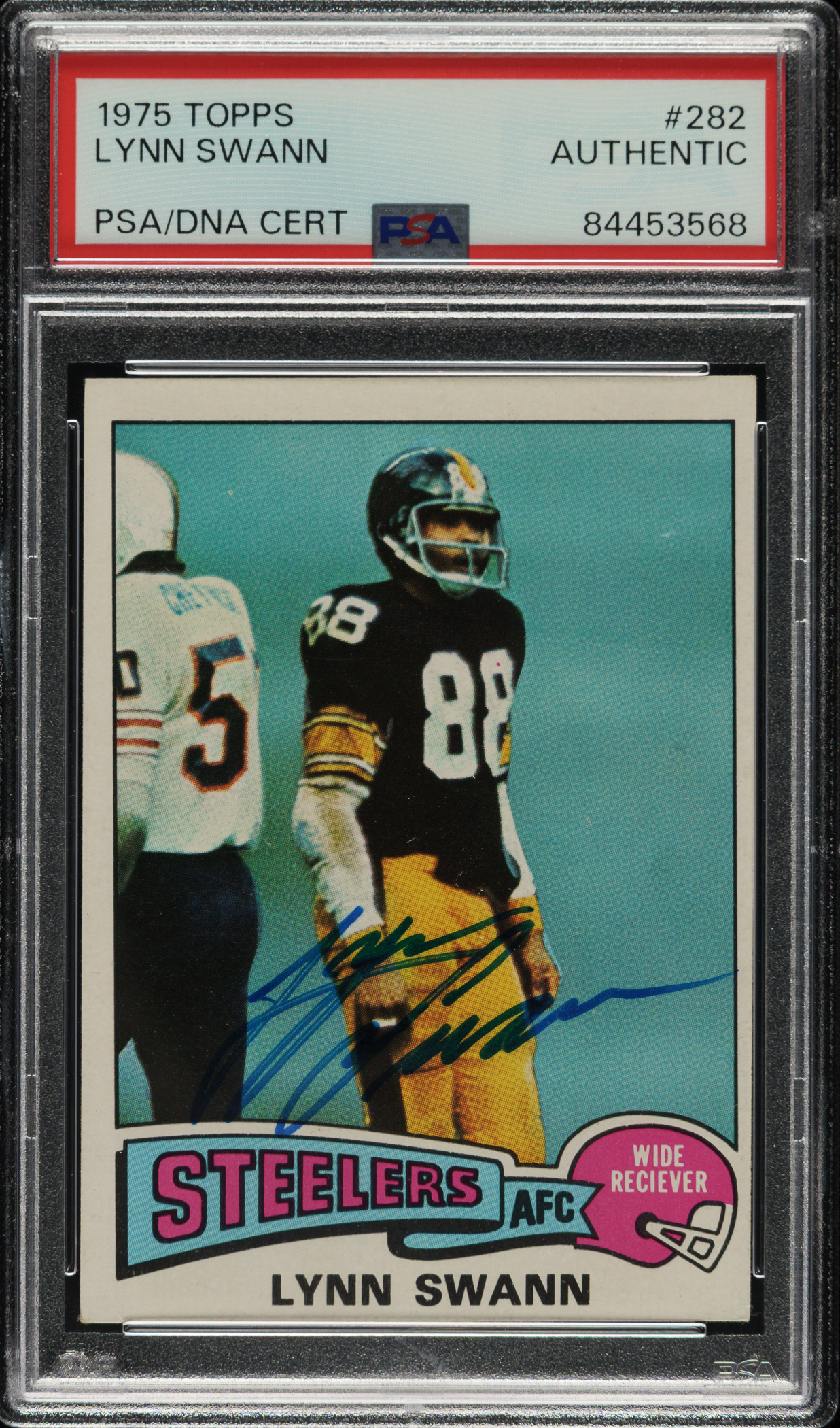 Beautiful signed example of Lynn Swann's rookie card from the 1975 Topps football set. Pittsburgh Steelers Hall of Famer. Swann has signed the card in blue marker along the front. PSA/DNA has encapsulated the card, certifying both the card and signature as "Authentic." The card is in Ex condition.