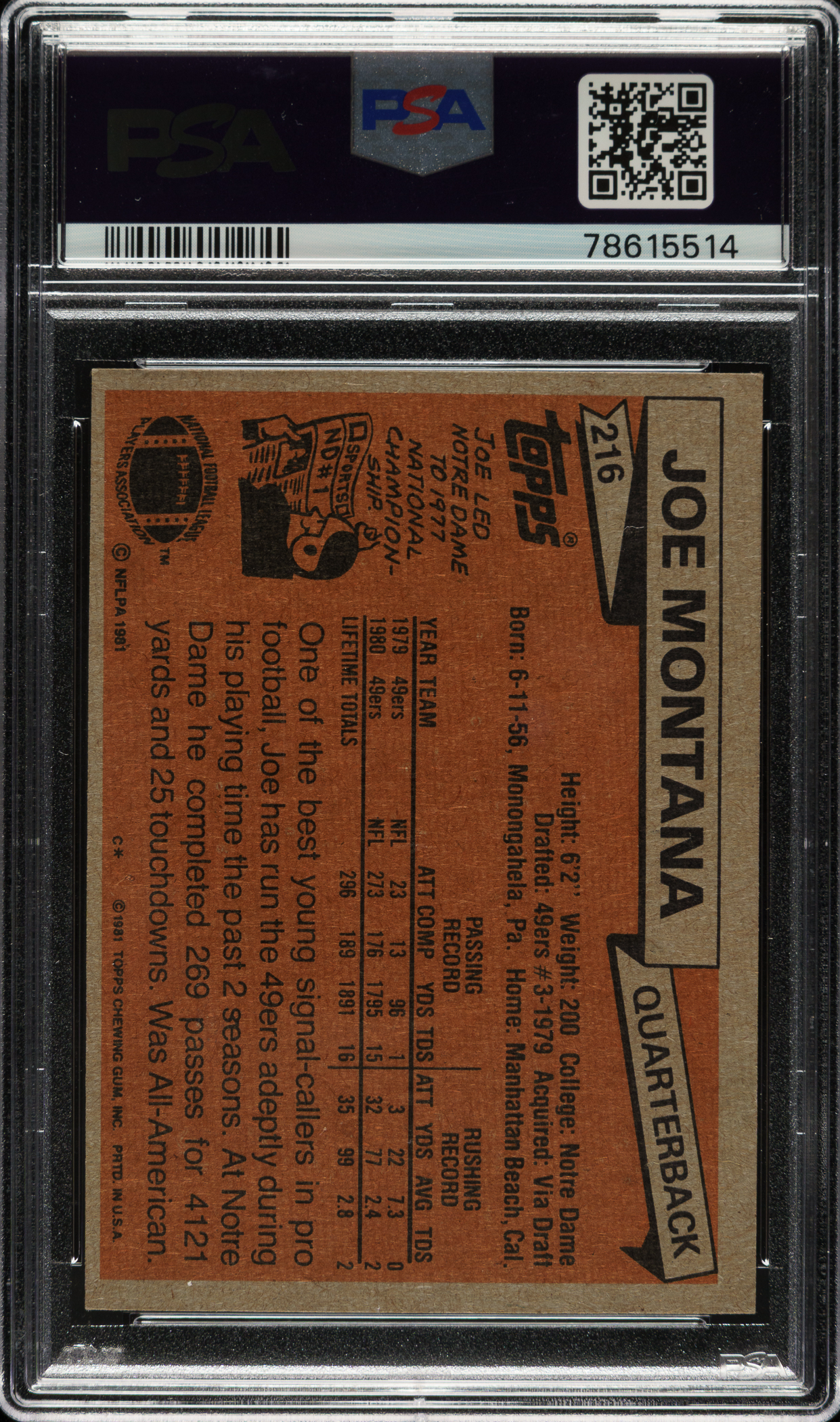 Lot # 2541: Signed 1981 Topps Football #216 Joe Montana Rookie - PSA/DNA