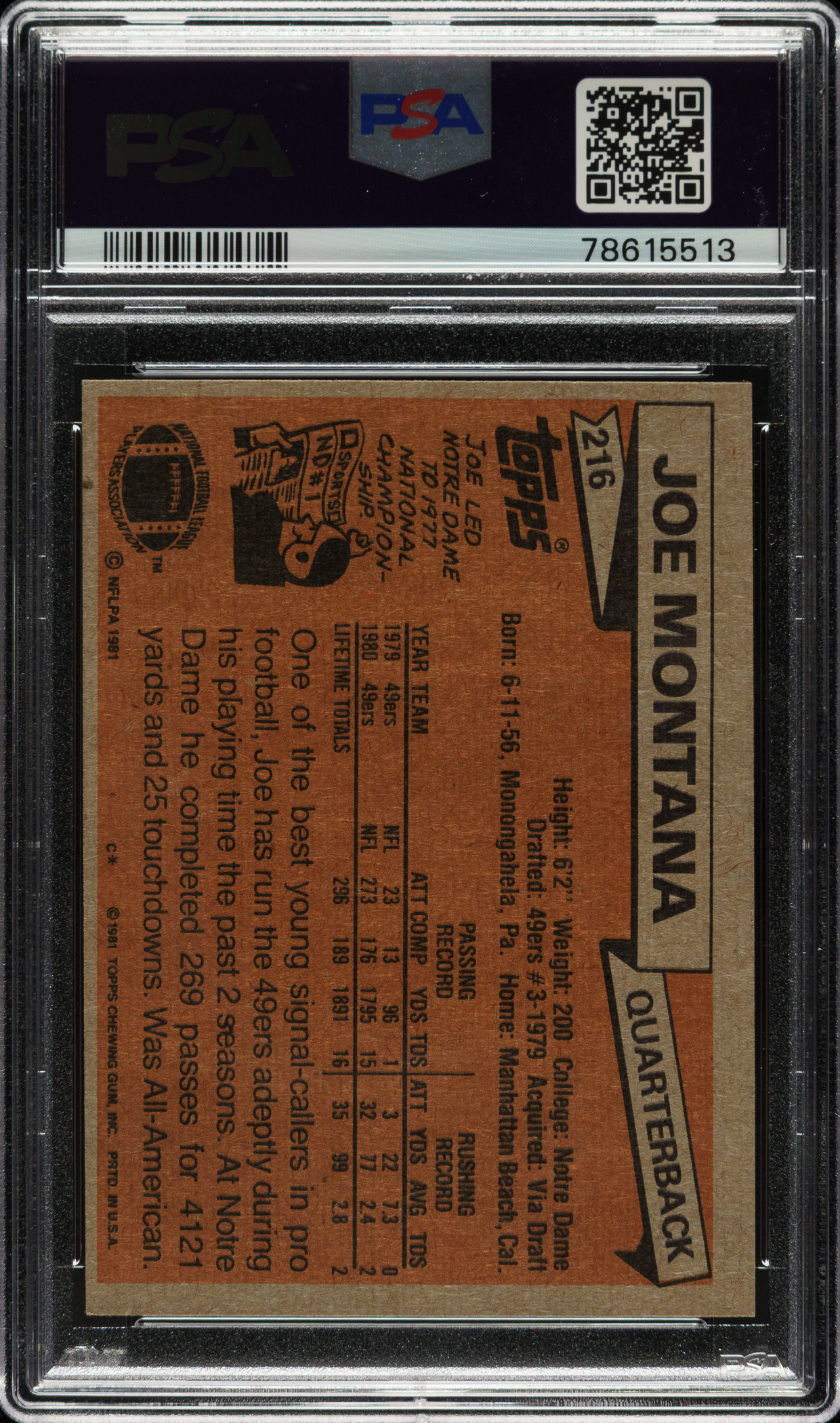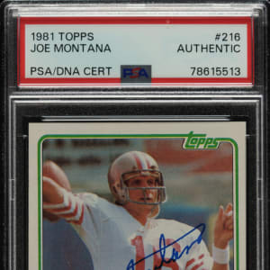 PSA/DNA has encapsulated the card and certified the signature as "Authentic." San Francisco 49ers Hall of Famer Joe Montana.