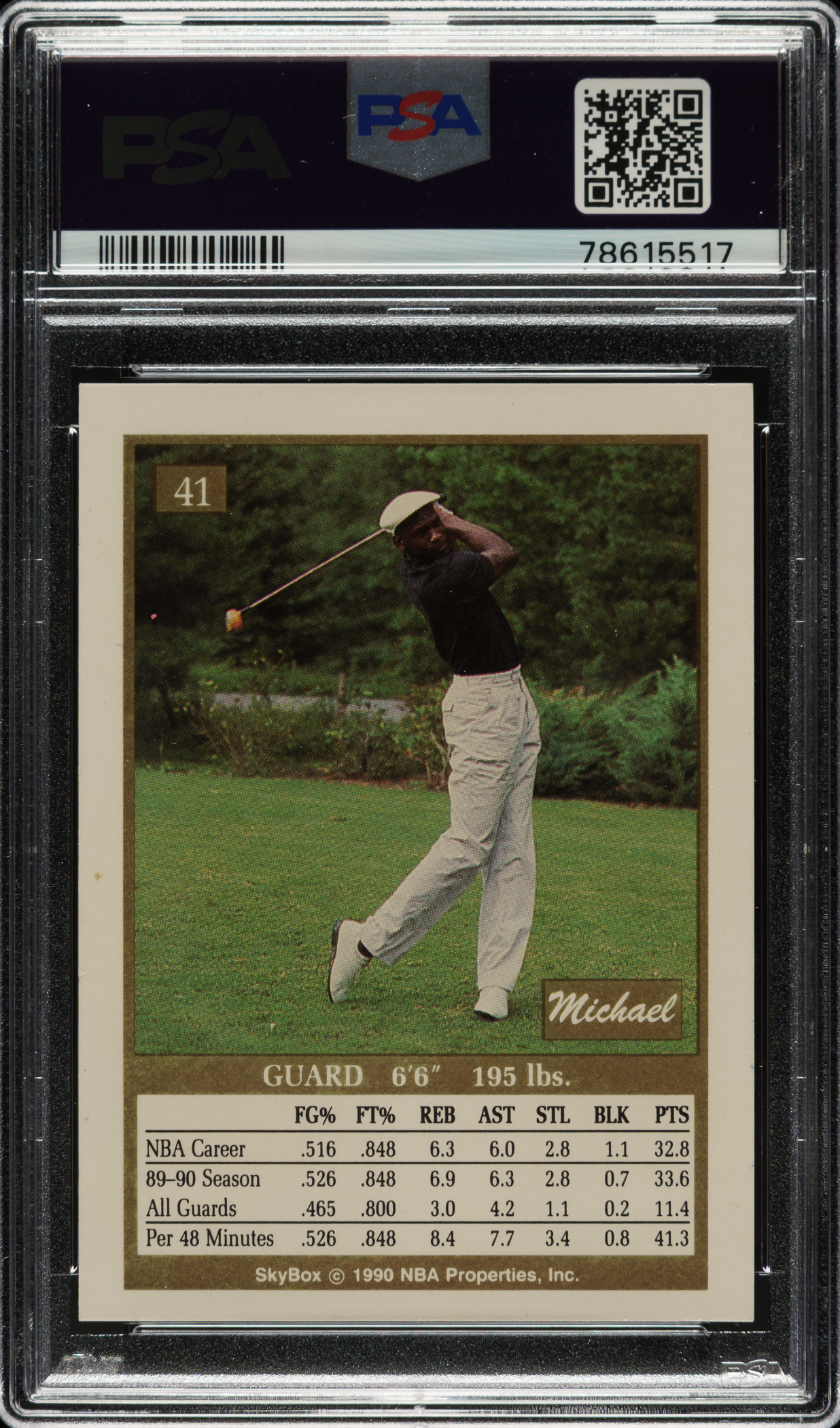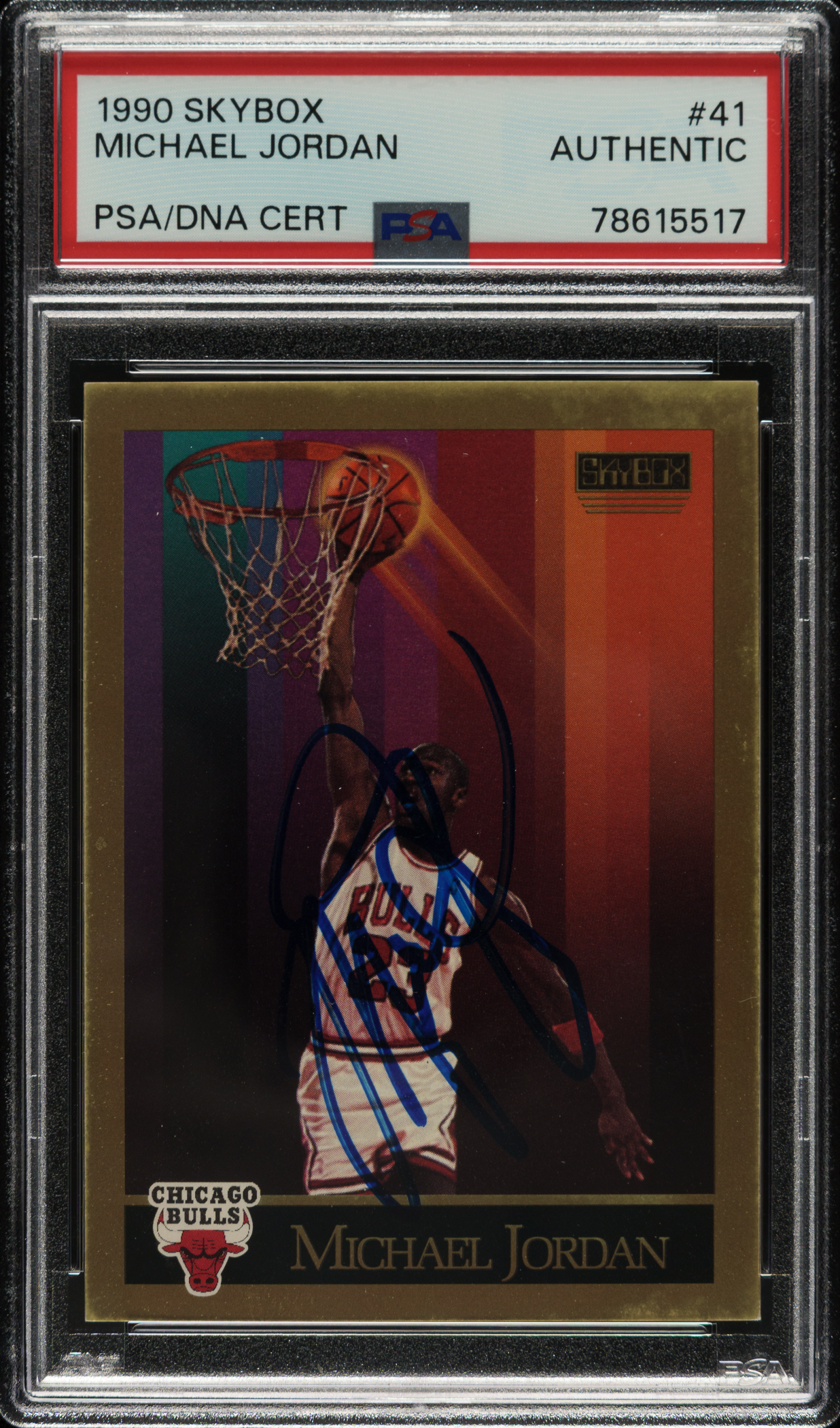 Very attractive signed example of Michael Jordan from the 1990-1991 Skybox Basketball series. Jordan has signed the card in blue marker on the front. PSA/DNA has encapsulated the card, certifying both the card and signature as "Authentic." Jordan signatures are known to be difficult to attain on any medium, especially cards. This is the first signed example of this card we have ever offered.