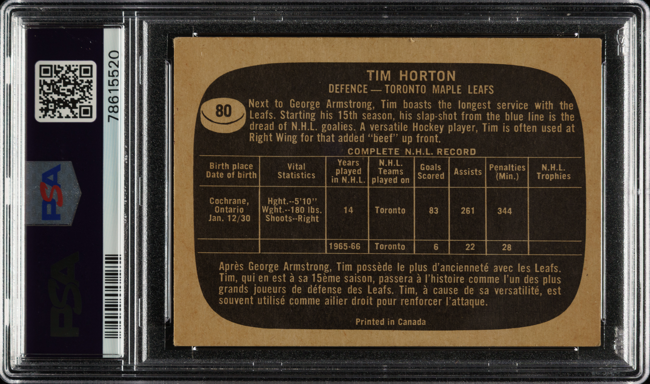 Beautiful signed example of #80 Tim Horton from the 1966-1967 Topps hockey set. Toronto Maple Leafs Hall of Famer. Horton has signed the card in black ink along the front. PSA/DNA has encapsulated the card, certifying both the card and signature as "Authentic." This is the ONLY signed example of this card ever encapsulated by PSA/DNA!