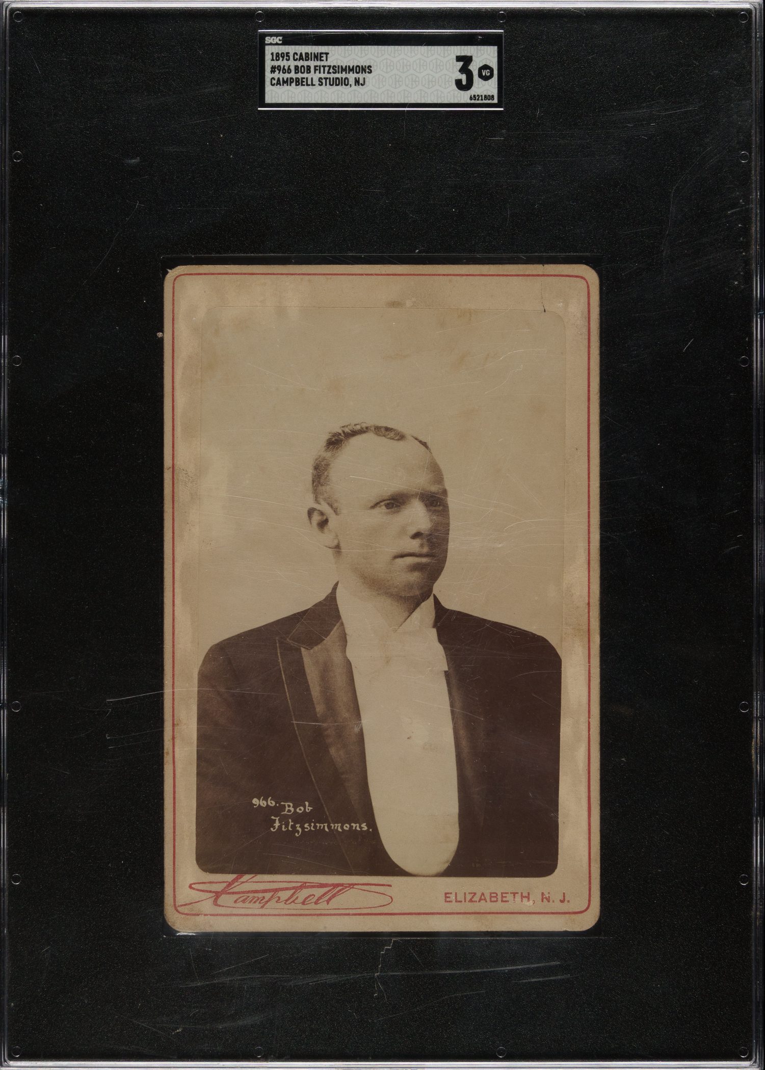 Graded VG 3 by SGC. Early cabinet card depicting boxing Hall of Famer Bob Fitzsimmons. Produced by Campbell Studio in Elizabeth, New Jersey.
