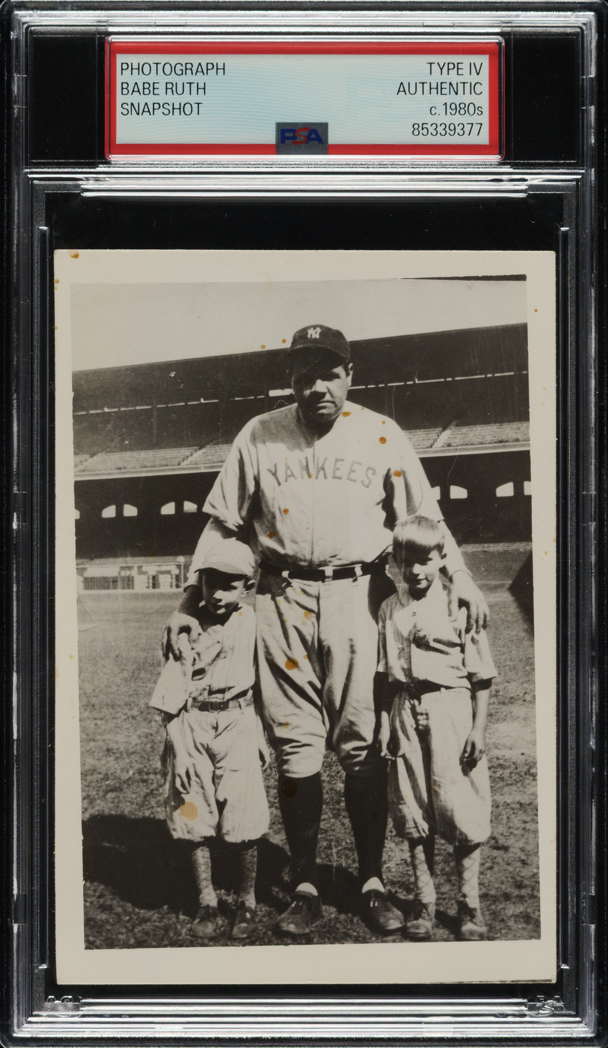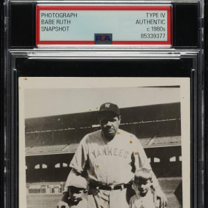 Vintage snapshot-photograph of Babe Ruth, circa 1980s. Ruth is pictured posing with two young boys during his time with the New York Yankees. Measuring 3.5 x 5 inches and in Fair condition overall.