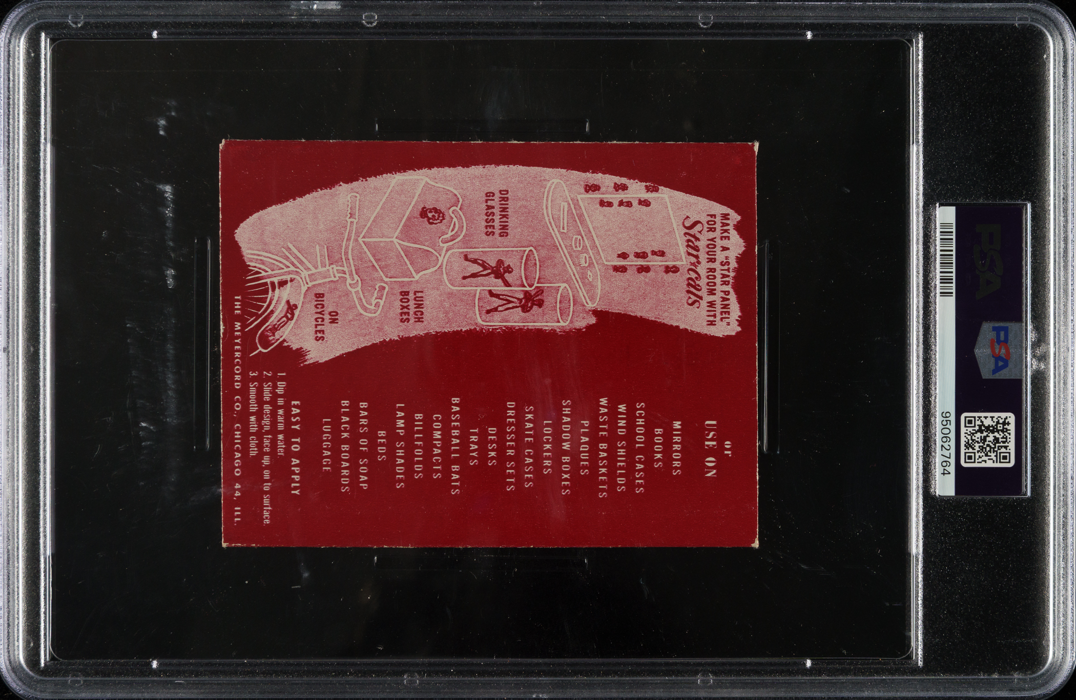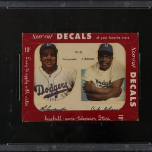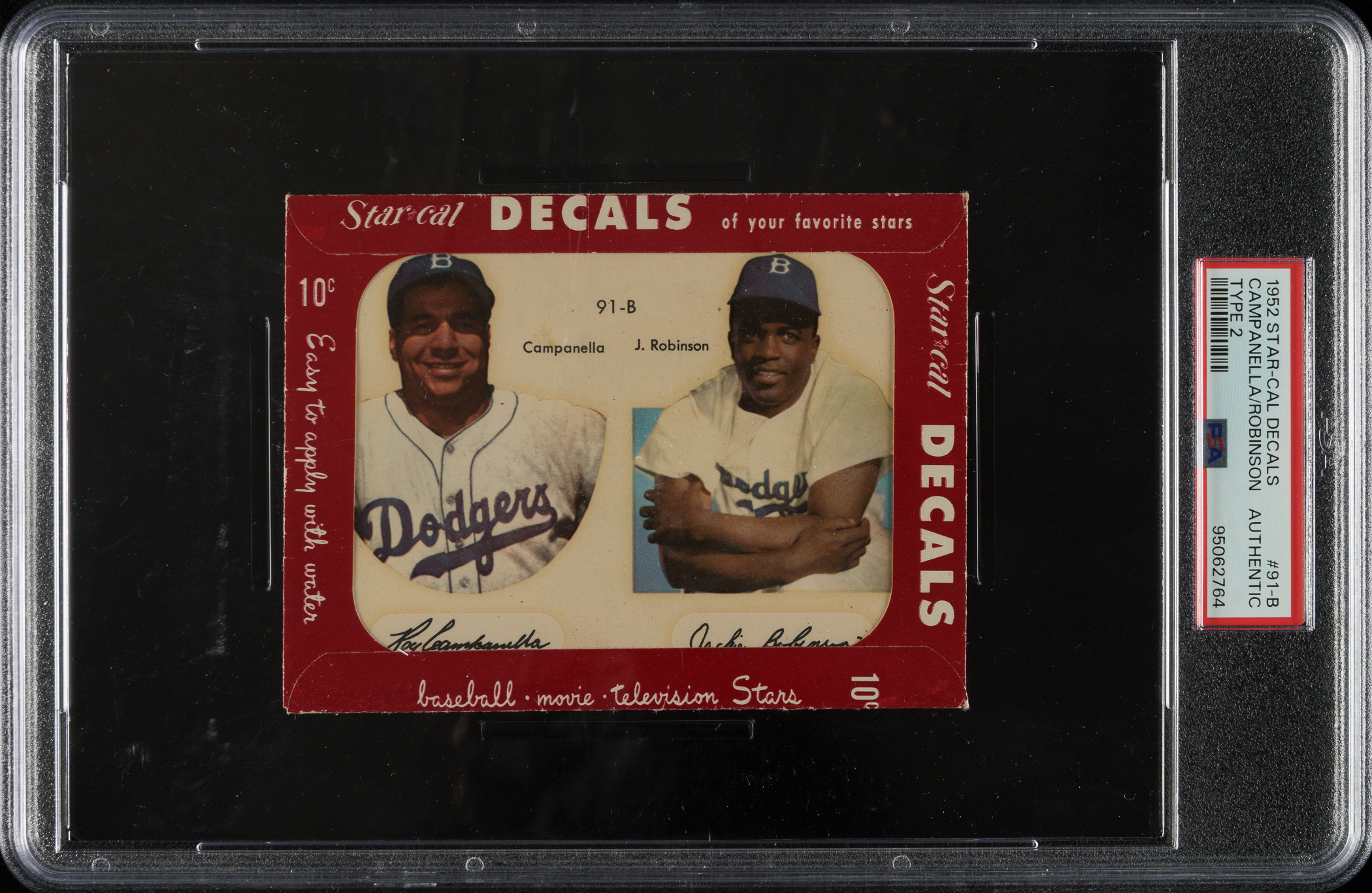 Rarely offered example of Jackie Robinson and Roy Campanella from the 1952 Star-Decals (Type 2) series. Issued by the Meyercord Co. of Chicago in 1952, the Type 2 set is similar in design to the Type 1 but slightly smaller (4-1/8 x 3-1/16 inches), and consists of thirty-two decals, with each sheet featuring two players instead of one. The decal is bright and clean. The original packaging envelope exhibits minimal edge and corner wear with a few small wrinkles visible.
