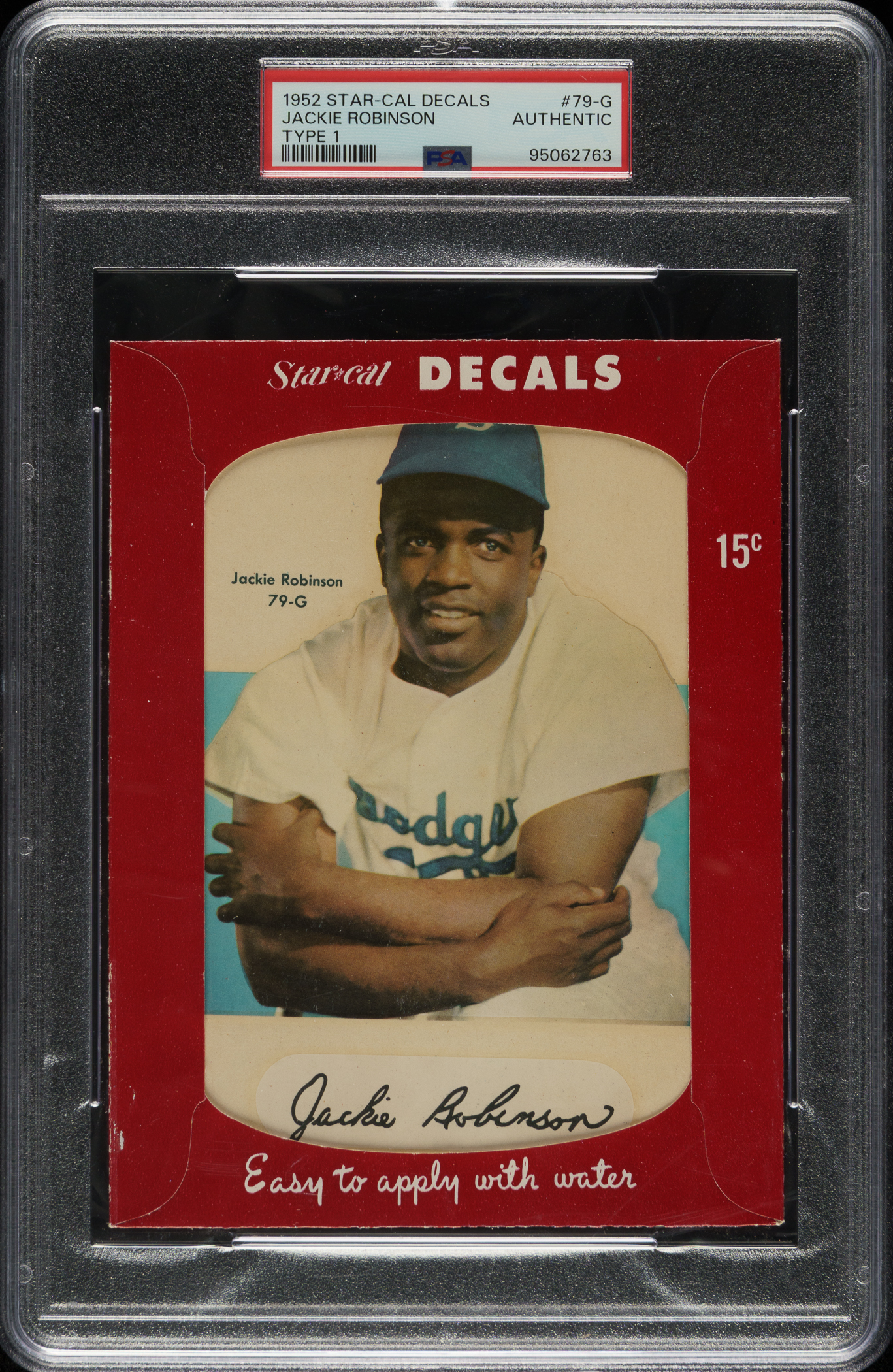 Rarely offered example of Jackie Robinson from the 1952 Star-Decals (Type 1) series. Issued by the Meyercord Co. of Chicago in 1952, the Type 1 Star-Cal set consists of seventy different Major Leaguers, each pictured on a large decal (4-1/8 x 6-1/8 inches) with a facsimile autograph below his image. The decal is bright and clean. The original packaging envelope shows minimal edge and corner wear. Both the decal and envelope display a few wrinkles. Encapsulated as Authentic by PSA.