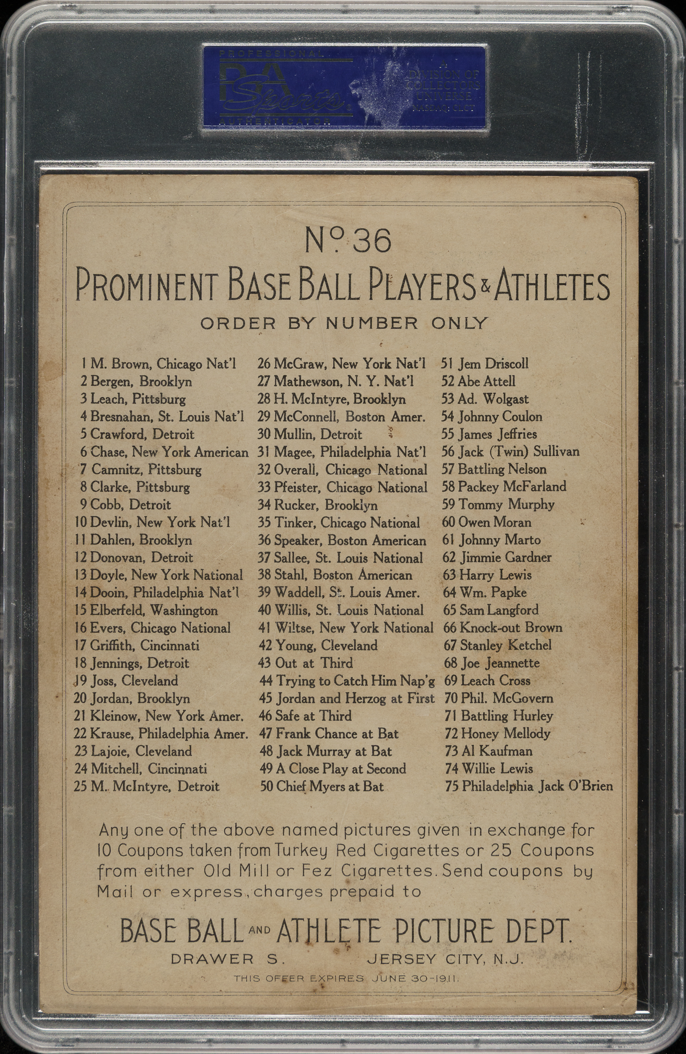 Graded VG 3 by PSA. Mid-grade example of Boston Red Sox Hall of Famer Tris Speaker from the T3 Turkey Red cabinet-card series. Turkey Red cabinets are universally recognized as among the most beautiful baseball-card issues ever produced. This example has extremely bold and vibrant colors, outstanding centering, and honest corner wear. The checklist (with offer) reverse displays light discoloration. A crease above Speaker's cap and multiple wrinkles along the reverse contribute to the assigned grade. This is a very attractive example of one of Tris Speaker's most desirable cards from the classic T3 Turkey Red set.
