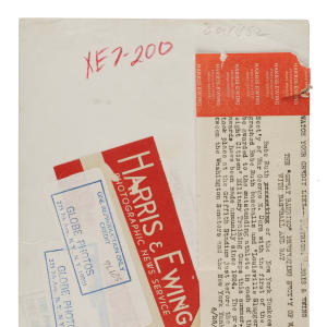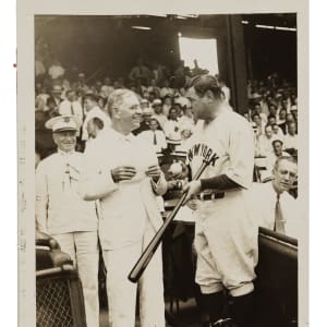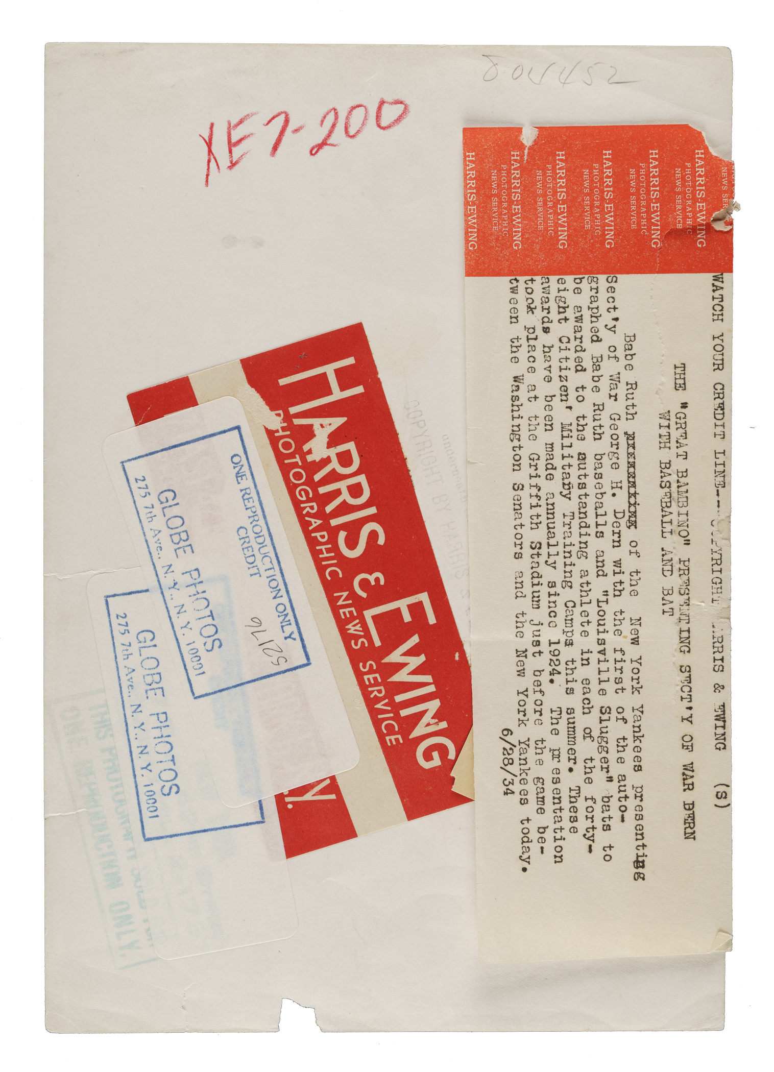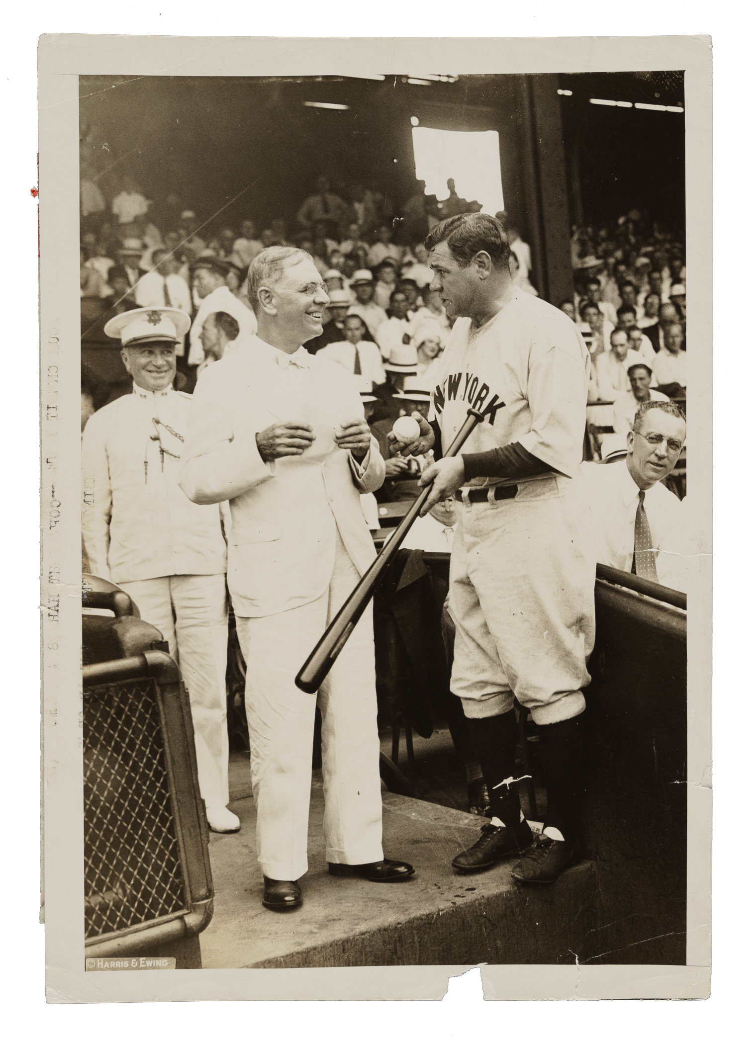 Original news photo of Babe Ruth as a member of the New York Yankees speaking with George Dern, who served as the United States Secretary of War from 1933 to 1936. Certified as an original Type I photograph by PSA/DNA. Per the original "Harris & Ewing" paper news caption on the reverse, Ruth is presenting Dern with autographed balls and bats, which were to be awarded to the outstanding athlete at each of the 48 Citizen's Military Training Camps that summer. The reverse displays the aforementioned paper news caption (which is dated June 28, 1934), multiple stamps (including a "Harris & Ewing" credit stamp), and a few editorial notations. The photo (7 x 10 inches) exhibits scattered creasing, is missing a piece along the bottom border and has a tear along the right edge. Good condition overall.