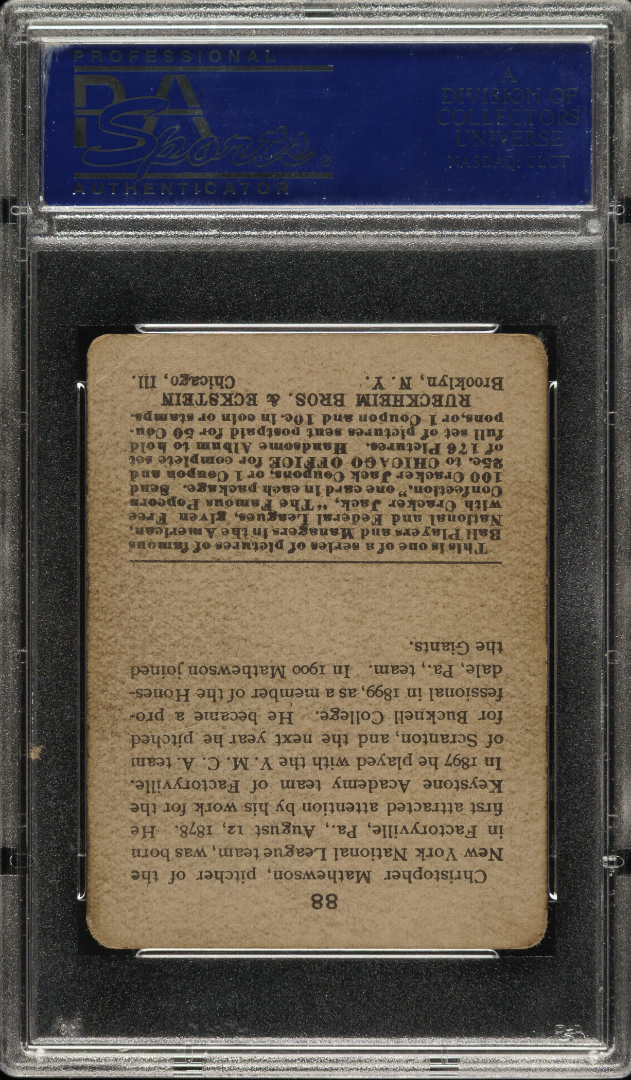 Graded VG 3 by PSA. Very attractive mid-grade example of this classic New York Giants Hall of Famer Christy Mathewson card from the 1915 Cracker Jack series. This is one of Mathewson’s most striking and popular cards. 1915 Cracker Jacks will always be one of the most highly prized and widely collected of all prewar sets. Mathewson is one of the key cards in the set, along with Cobb, Jackson, Johnson, and Wagner. This example has a bold red background, excellent registration, moderate corner wear, and a small crease in the upper right. Lightly soiled front and back. This is a strong mid-grade 1915 Cracker Jack example of Christy Mathewson, one of baseball's greatest legends, in an extremely desirable grade, from one of collecting's most classic and popular sets.