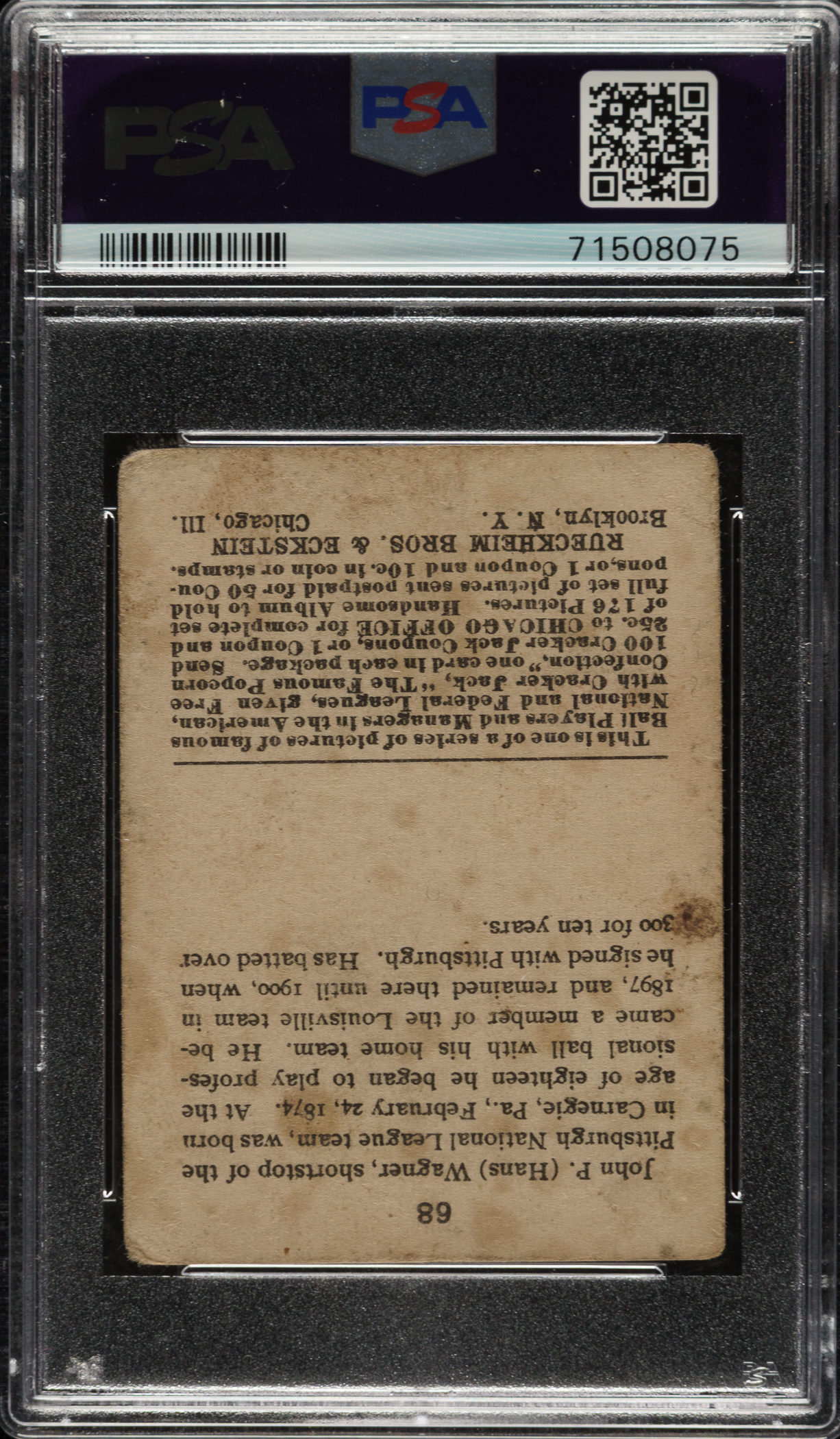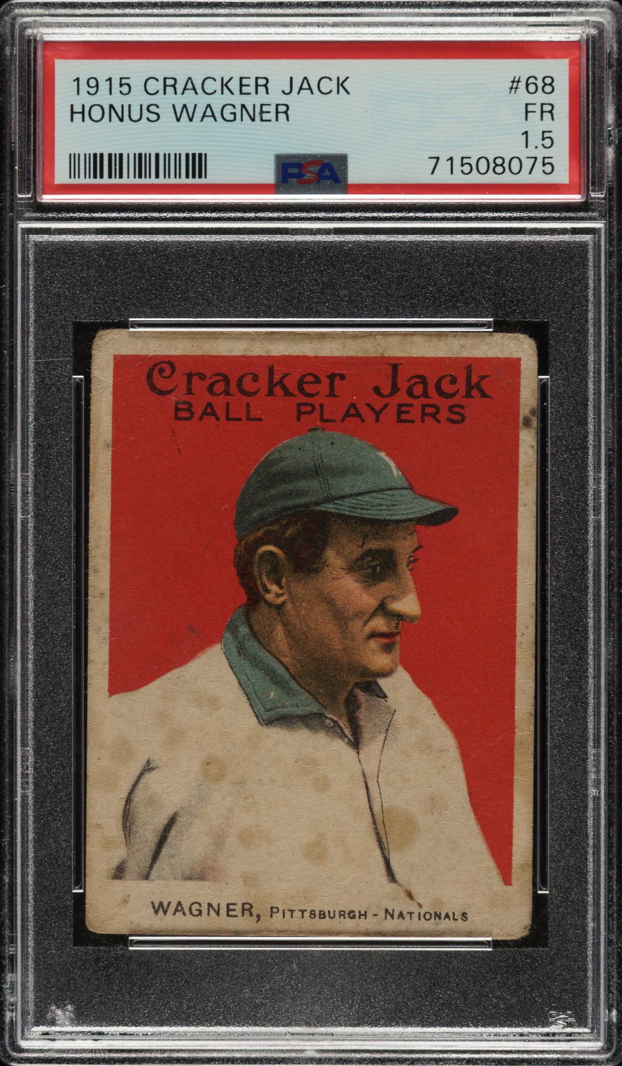Graded FAIR 1.5 by PSA. Classic example of Pittsburgh Pirates Hall of Famer Honus Wagner from the 1915 Cracker Jack set. This is understandably one of Wagner's most striking and popular cards. 1915 Cracker Jacks will always be one of the most desirable prewar sets ever issued, and the "Flying Dutchman" is one of the big three key cards in the set, along with Cobb and Jackson. Well-centered, with an extremely bold red background, even wear to the corners, and a few small creases. Spots of caramel staining and soiling are visible front and back. The card has a better appearance than its technically accurate PSA grade, and would be a very welcome addition to any high-quality collection of Cracker Jack, Honus Wagner, or Hall of Fame cards.