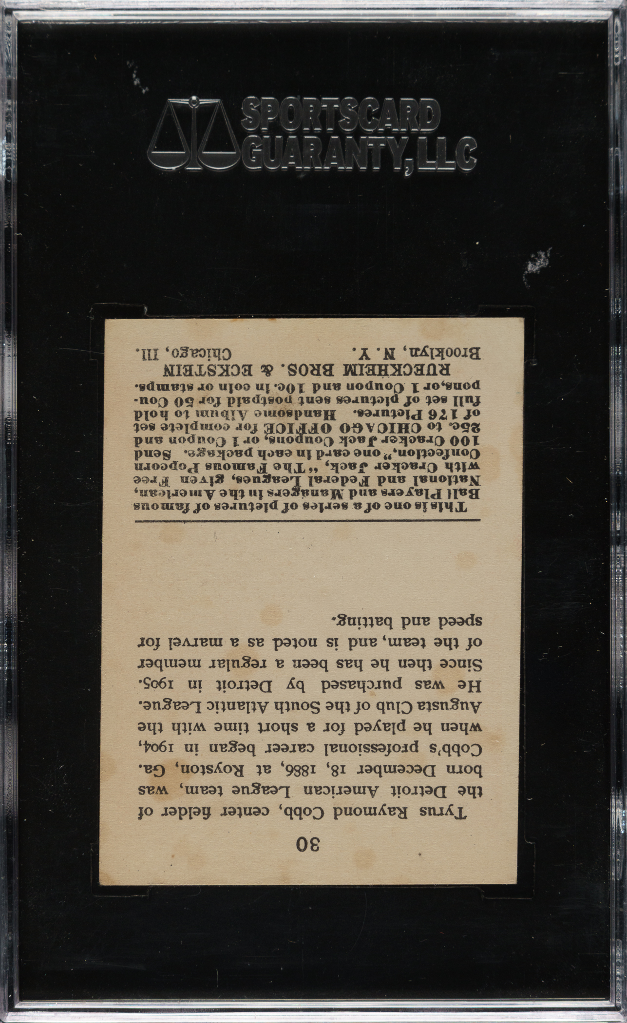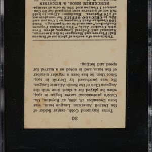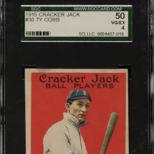 Graded VG/EX 50 by SGC. Presented is one of vintage-card collecting's most recognizable icons and one of the key cards of the 1915 E145 Cracker Jack series: #30 Ty Cobb. Besides being the second most valuable card in the set (behind Joe Jackson), it is also one of the most desirable and striking of all Ty Cobb cards. This example is bright and crisp, both front and back, with bold colors, flawless registration, and strong corners. Light caramel staining is visible on the front and back (more advanced). The classic Cracker Jack set is considered by many to be the most beautiful card set ever issued. The E145 Ty Cobb has always and will always be in high demand, especially a desirable mid-grade example such as this. This is one of card collecting's great classics and would be a worthy addition to any high-quality Cracker Jack, Ty Cobb, or Hall of Fame collection.