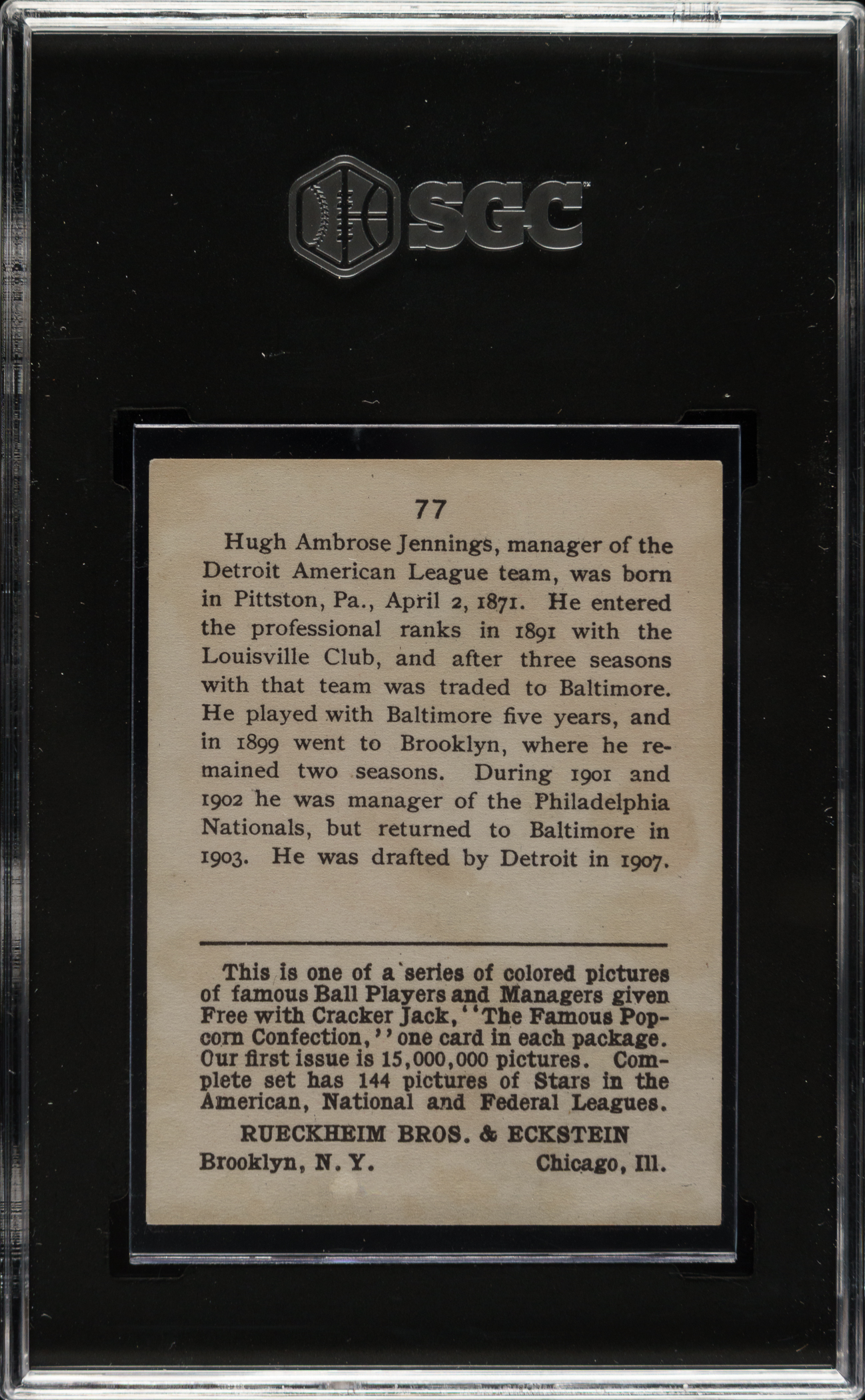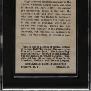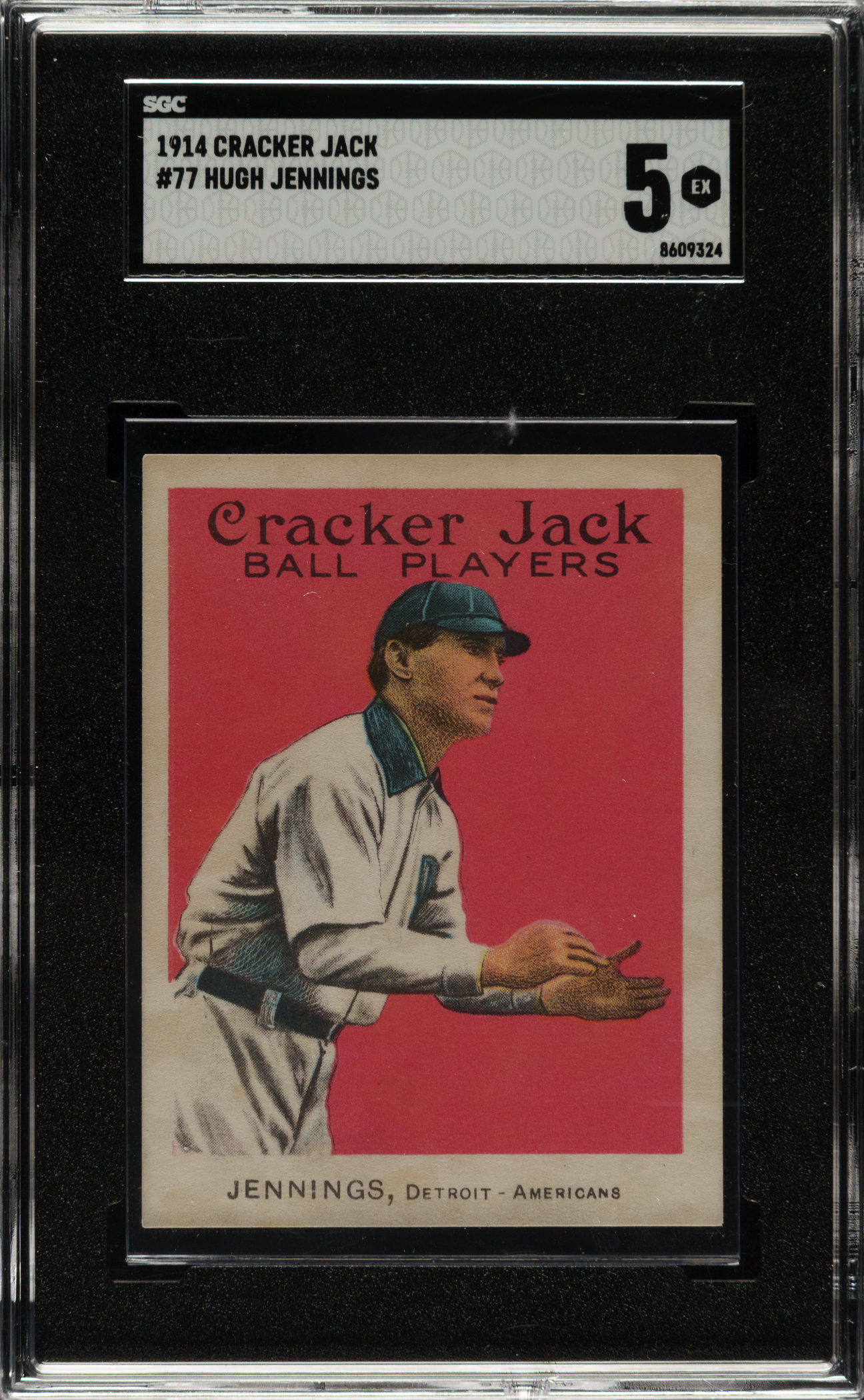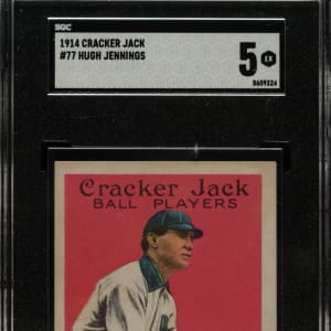 Graded EX 5 by SGC. Fantastic example of Detroit Tigers Hall of Famer Hughie Jennings from the 1914 Cracker Jack #144 series. The offered card has a striking red background, crisp image, and strong corners with light touches of wear. Displaying only a couple light traces of caramel staining, far less than is normally encountered on 1914 #144 series Cracker Jack cards. 1914 Cracker Jacks are far rarer to find in high grade than their 1915 counterparts because the 1914 #144 series cards were only issued in boxes of Cracker Jack. It is rare to find any #144 series Cracker Jack in high grade, let alone such a beautiful example of Hall of Famer Hughie Jennings.