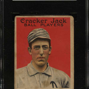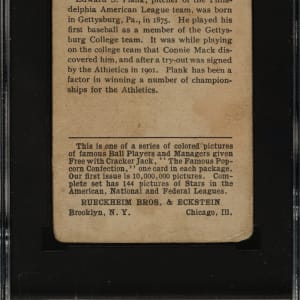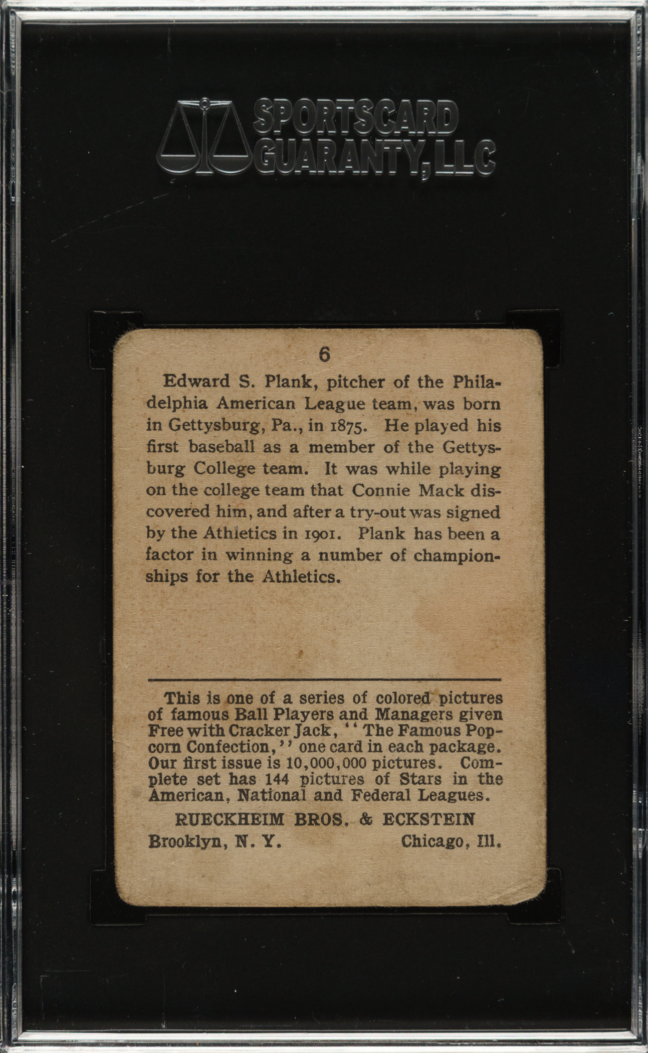 Graded VG 3 by SGC. Mid-grade example of Philadelphia Athletics Hall of Famer Eddie Plank from the 1914 Cracker Jack #144 series. This example has vibrant colors, outstanding registration, slightly rounded corners, and centering toward the top left. Light caramel staining front and back and minor creasing is visible. The 1914 Cracker Jacks are far rarer to find in high grade than their 1915 counterparts, because the 1914 #144 series cards were only issued in boxes of Cracker Jack. This is a strong example from this classic set.