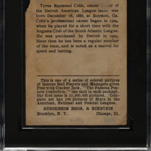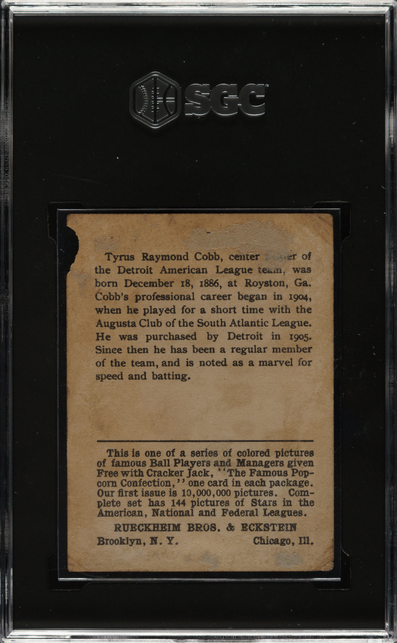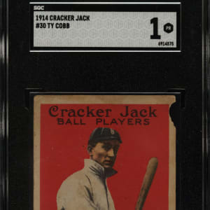 Graded POOR 1 by SGC. Very attractive, technically low-grade example of #30 Ty Cobb from the classic 1914 Cracker Jack series. The 1914 Cracker Jack Ty Cobb is one of card collecting's classics and one of Cobb's most desirable and striking cards. Cobb is featured on this card in a batting pose set against a deep red background. The card possesses outstanding color, flawless registration, and honest corner wear. Light caramel staining is present on the front and back. A chipped top-right border and evidence of album removal on the reverse contribute to the assigned grade. This is an appealing example of card #30 Ty Cobb. The classic Cracker Jack set is considered by many to be the most beautiful card set ever issued. The E145 Ty Cobb has always been, and will always be, in high demand.