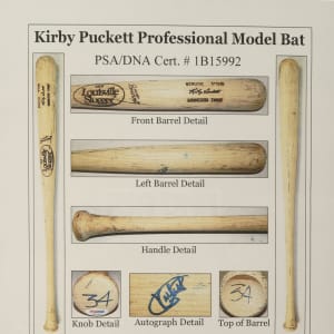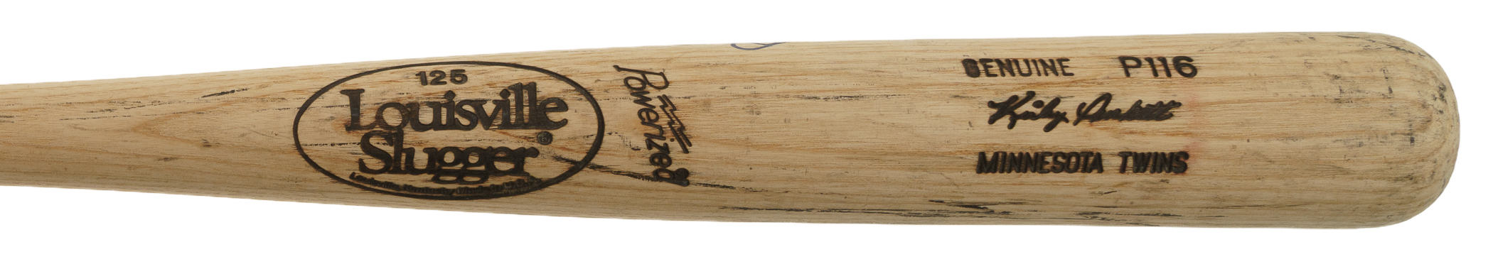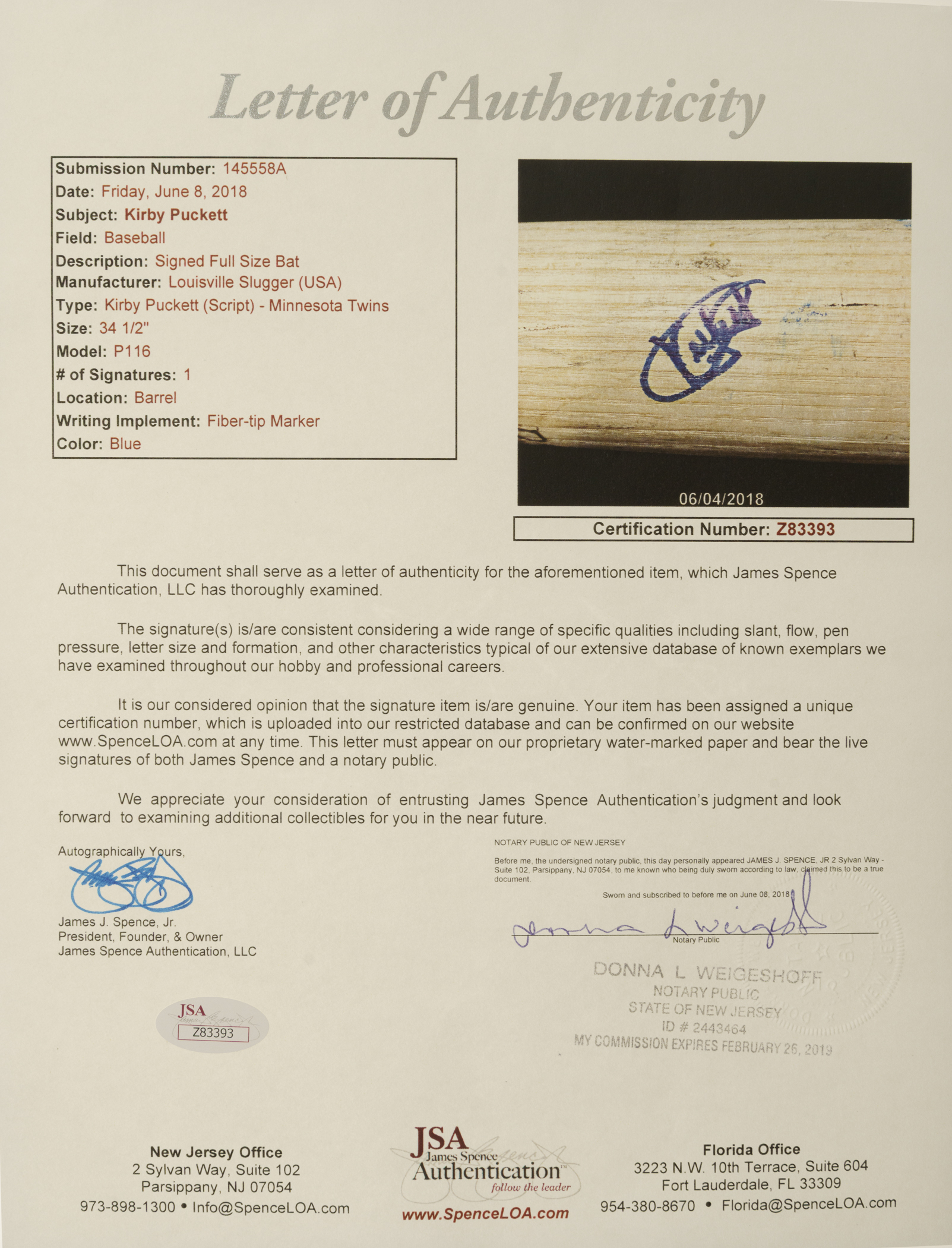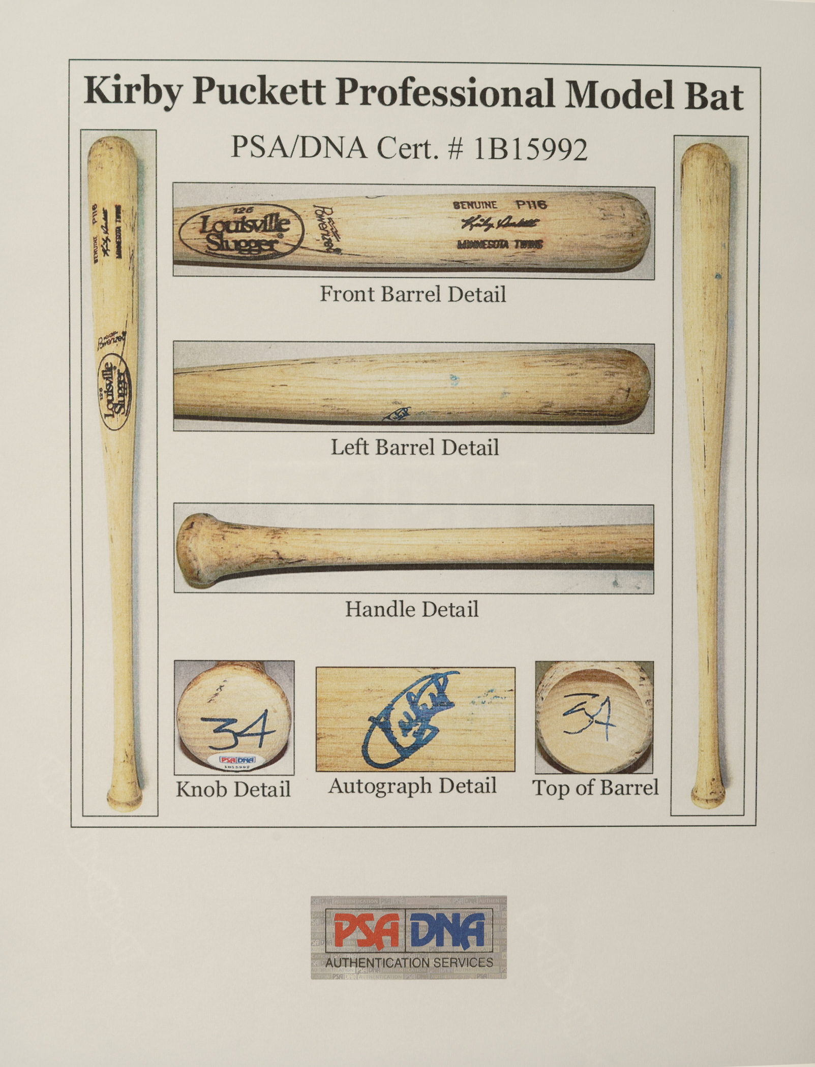 Kirby Puckett Louisville Slugger signature-model "P116" bat, dating from his 1993 season with the Minnesota Twins. Graded GU 8 by PSA/DNA. The cupped-end bat displays evidence of light-to-moderate use along its entire length, including a few ball marks (with blue ink transfers) and streaks due to contact with other bats. Puckett's number ("34") is written in blue marker on the knob and top barrel. Puckett has also signed the left barrel in blue marker. Puckett turned in another All-Star season in 1993, hitting .293 with 22 home runs and 89 RBI. Although his career was brief (1984-1995), his accomplishments were many, including one batting title, ten All-Star Game appearances, six Gold Glove Awards, and eight seasons of batting .300 or better. He also led the Twins to two World Championships over that span. He was elected to the Hall of Fame in 2001. Length: 34.75 inches. Weight: 31.5 ounces. Full LOA from John Taube of PSA/DNA (bat only). Full LOA from James Spence/JSA (signature only). The size/weight of this item requires that there will be an additional shipping charge for this lot.