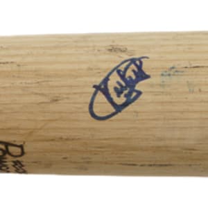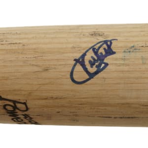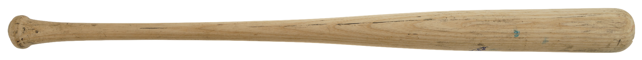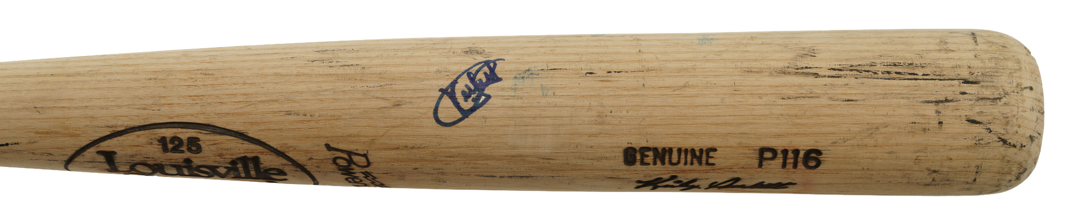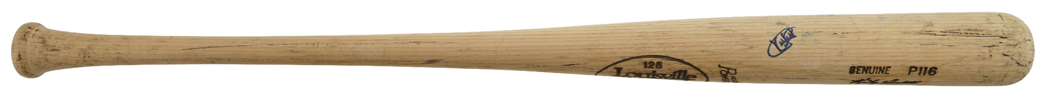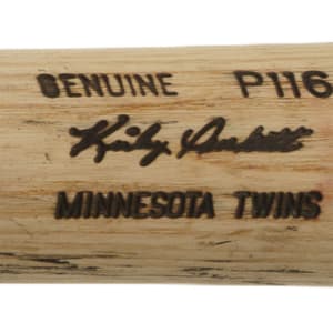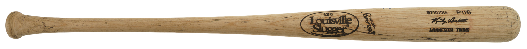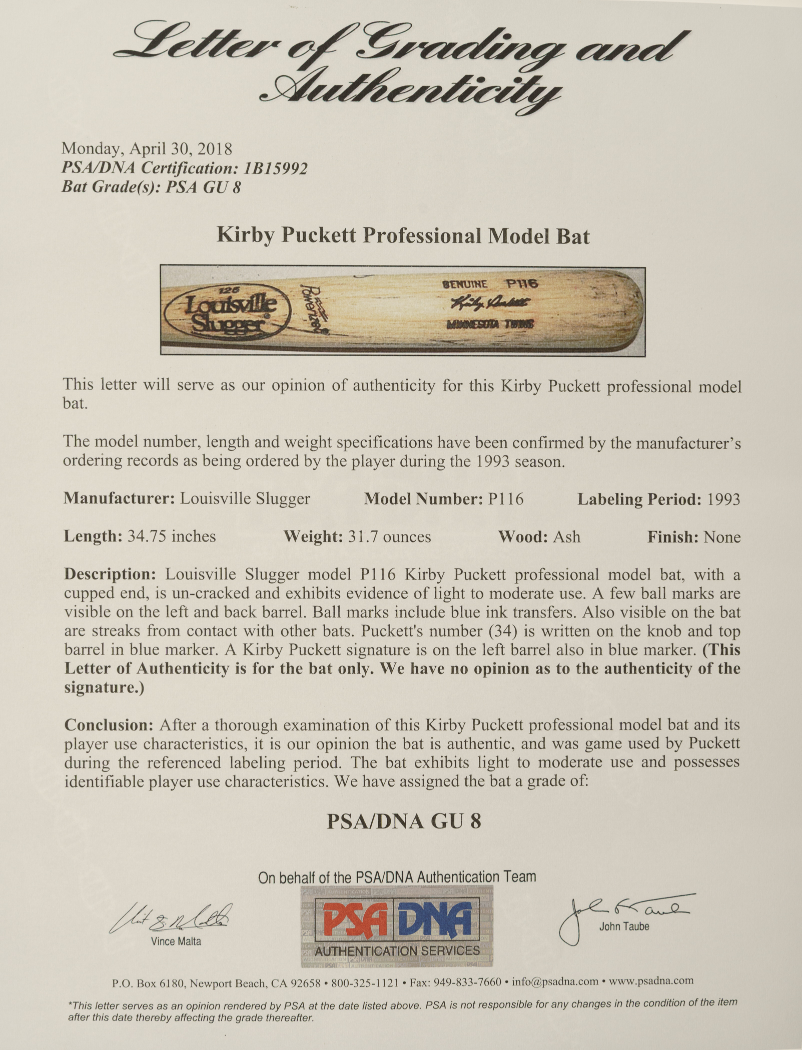 Kirby Puckett Louisville Slugger signature-model "P116" bat, dating from his 1993 season with the Minnesota Twins. Graded GU 8 by PSA/DNA. The cupped-end bat displays evidence of light-to-moderate use along its entire length, including a few ball marks (with blue ink transfers) and streaks due to contact with other bats. Puckett's number ("34") is written in blue marker on the knob and top barrel. Puckett has also signed the left barrel in blue marker. Puckett turned in another All-Star season in 1993, hitting .293 with 22 home runs and 89 RBI. Although his career was brief (1984-1995), his accomplishments were many, including one batting title, ten All-Star Game appearances, six Gold Glove Awards, and eight seasons of batting .300 or better. He also led the Twins to two World Championships over that span. He was elected to the Hall of Fame in 2001. Length: 34.75 inches. Weight: 31.5 ounces. Full LOA from John Taube of PSA/DNA (bat only). Full LOA from James Spence/JSA (signature only). The size/weight of this item requires that there will be an additional shipping charge for this lot.