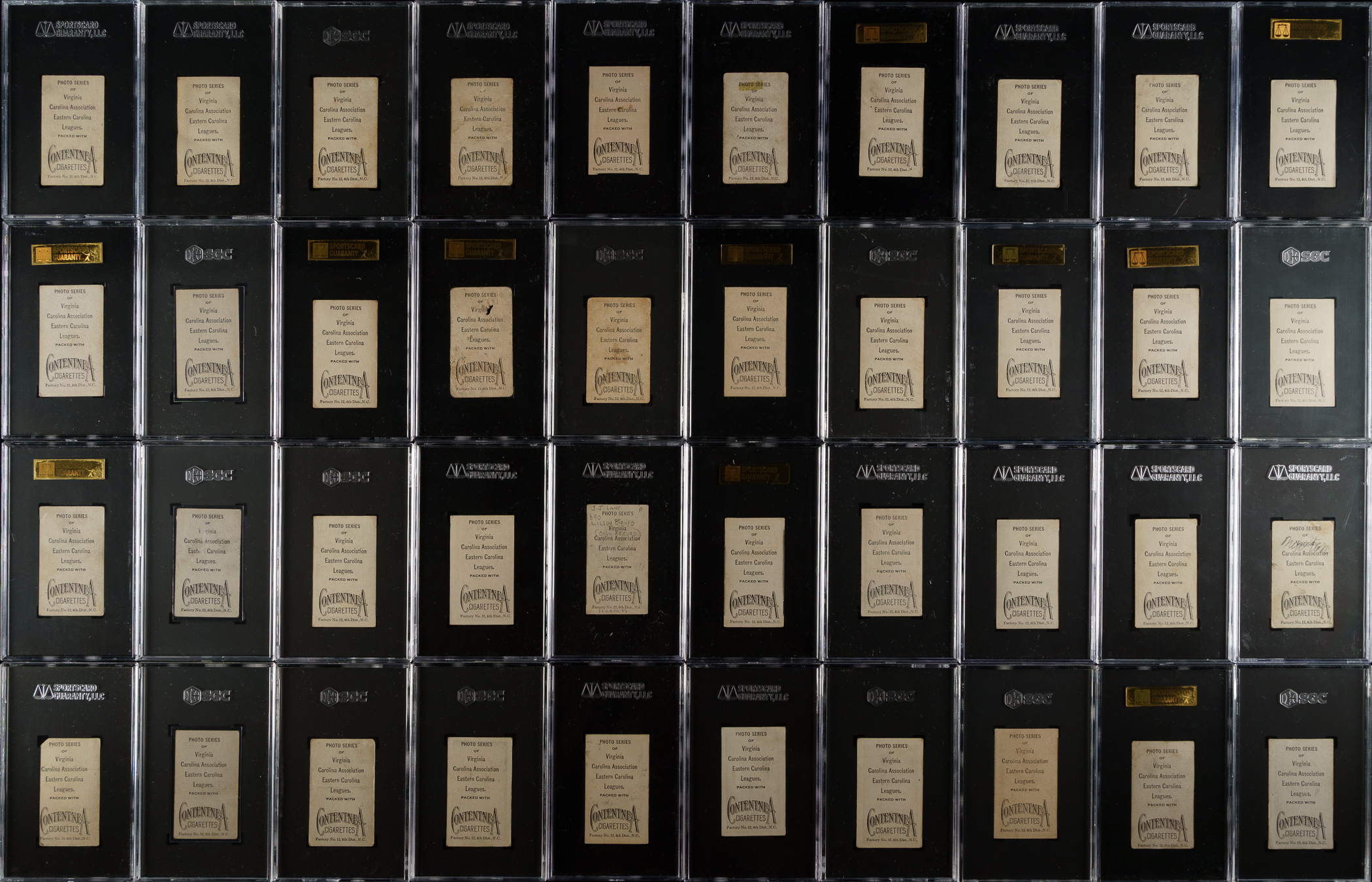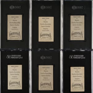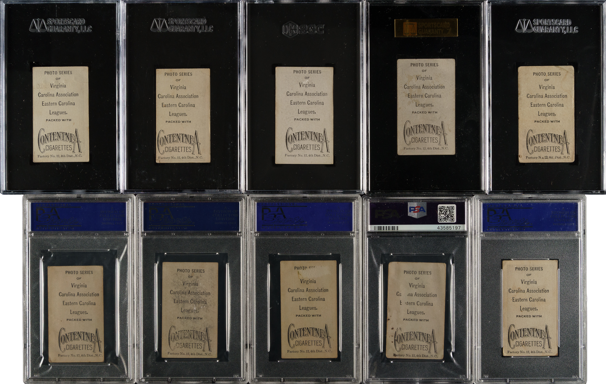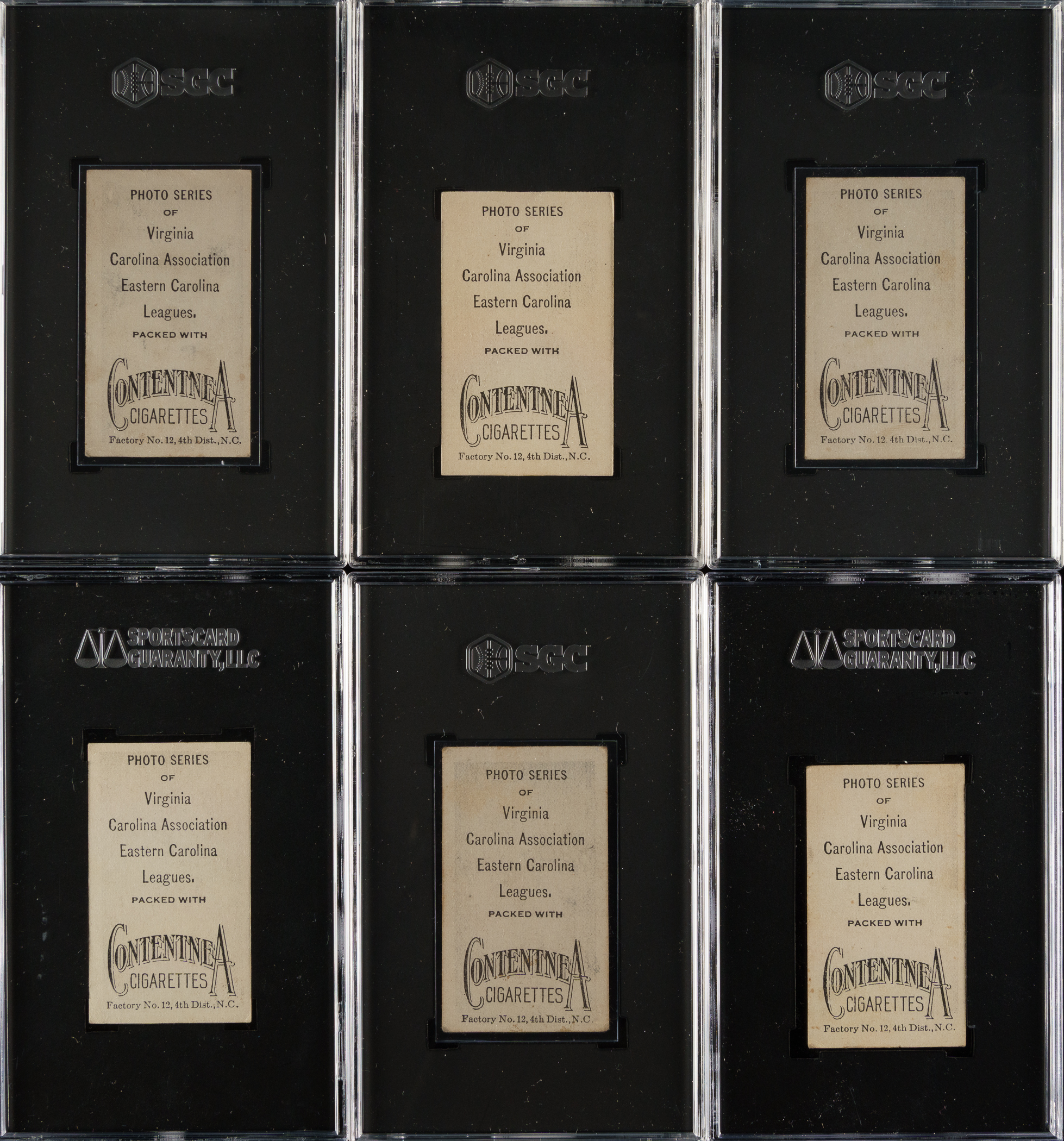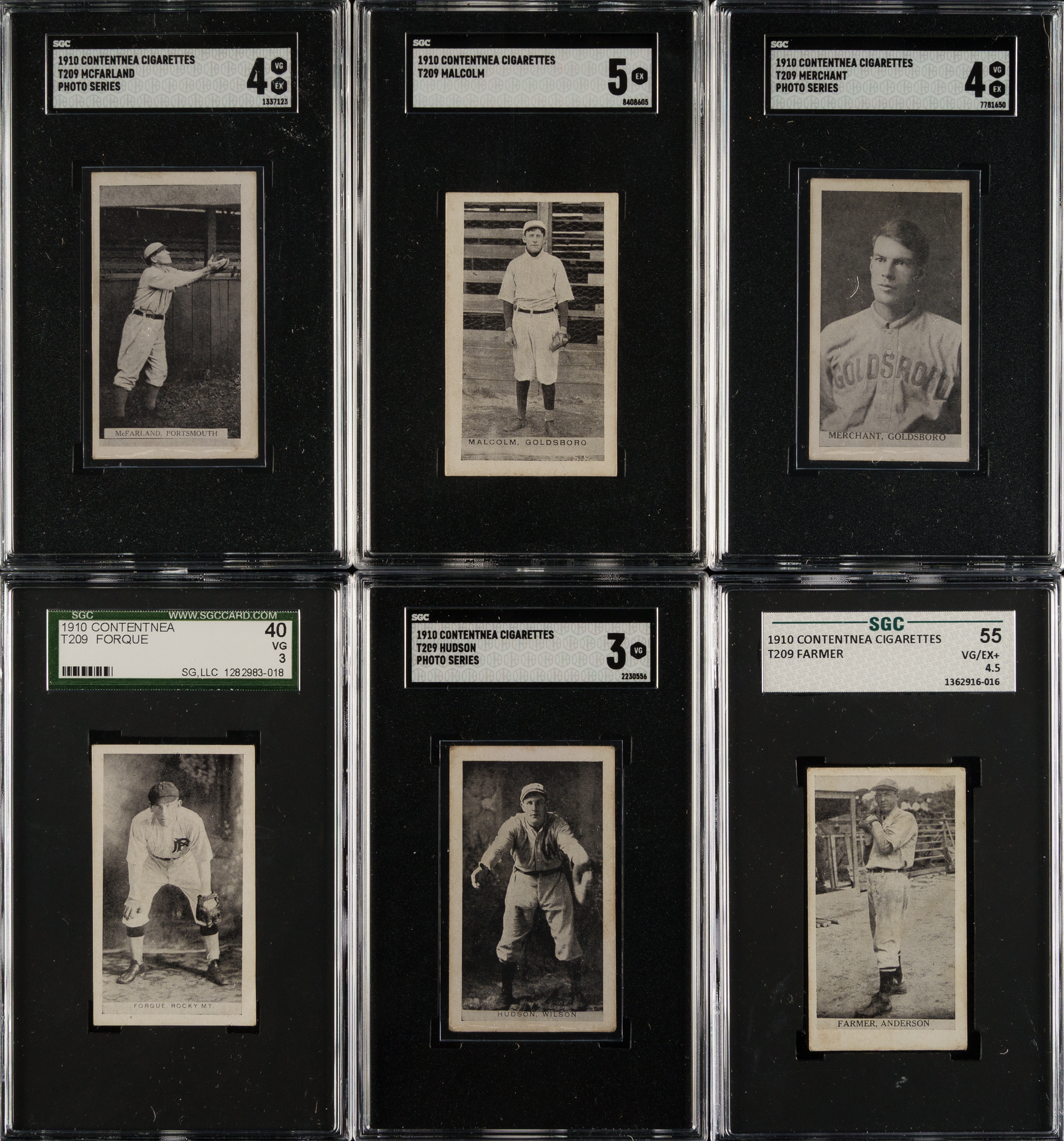 Presented is an incredible collection of 117 different 1910 T209 Contentnea "Photo Series" Tobacco cards. Ninety-six cards have been professionally graded and encapsulated by SGC (91) and PSA (5), leaving just 21 cards unencapsulated. This is an extremely noteworthy assembly as it is only the fifth time in the past 21 years that we have offered a substantial group of cards from this set. (Please note B. E. Thompson dressed as Uncle Sam, one of the most fascinating and unusual cards in all prewar card collecting, is being sold individually in this auction.) We have been privileged to offer near-complete sets on behalf of the estates of legendary collectors Joe Pelaez and Paul Pollard in past years, but typically, we will find only one card or a few cards in an old-time or type-card collection. This group of 117 different cards (representing 52% of a complete set) is extremely substantial and far more cards than normally encountered at one time! The T209 "Photo Series" set is composed of 224 different players from the Virginia League, Carolina Association, and Eastern League. T209 Contentnea "Photo Series" are one of the rarest and (in large part because of their rarity) most overlooked of all tobacco-card issues. Although there are no Hall of Famers in this set, there are numerous extreme rarities and scarcer cards, some of which are included here. T209 Contentnea "Photo Series" Tobacco cards are among a small selection of elite sets that have long captured the imagination of many of the most legendary collectors, from the earliest days of serious collecting, perhaps more so in years past than even in recent times. The reason many great early collectors prized these cards so highly is twofold: 1) These cards could not (and cannot) simply be purchased in set form. They have to be collected. They are a challenge. 2) Ultimately, cards are about the players that are featured. Many of the players in T209 "Photo Series" are featured in few or no other sets. These characteristics make the real-photo T209 Contentnea set especially significant to the game of baseball and to the world of baseball cards, and especially appealing to the most sophisticated collectors. T209 cards also have a very distinctive design with striking player poses unique to this set.