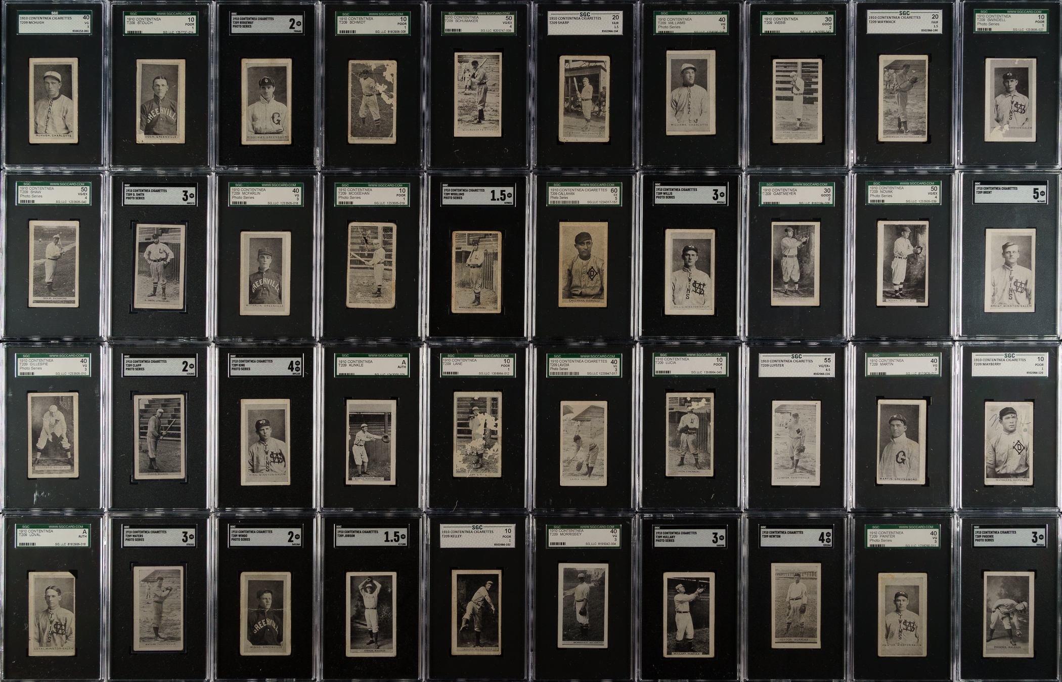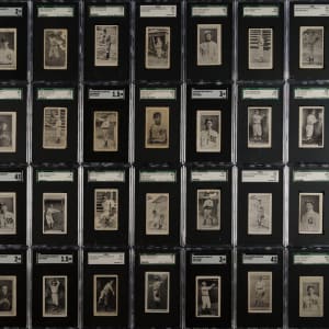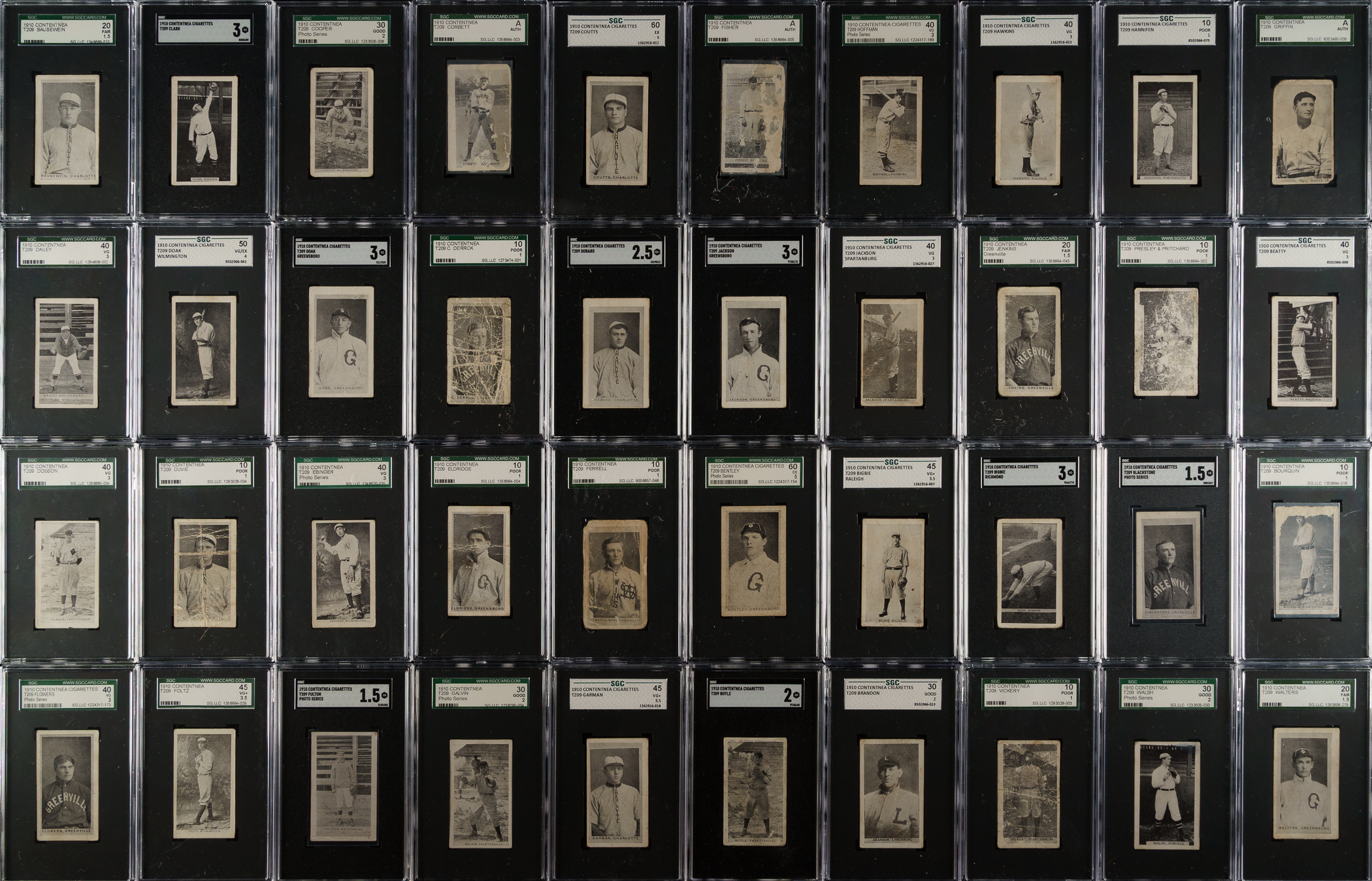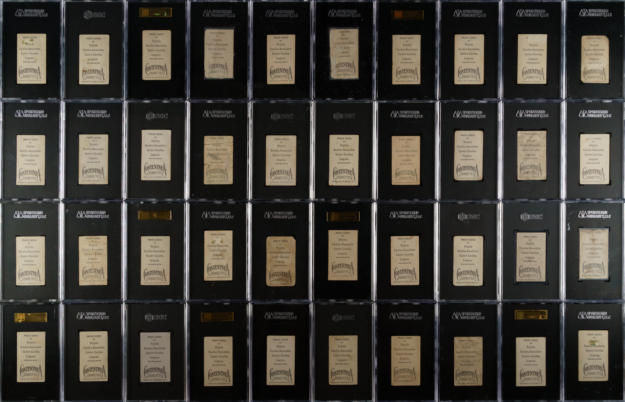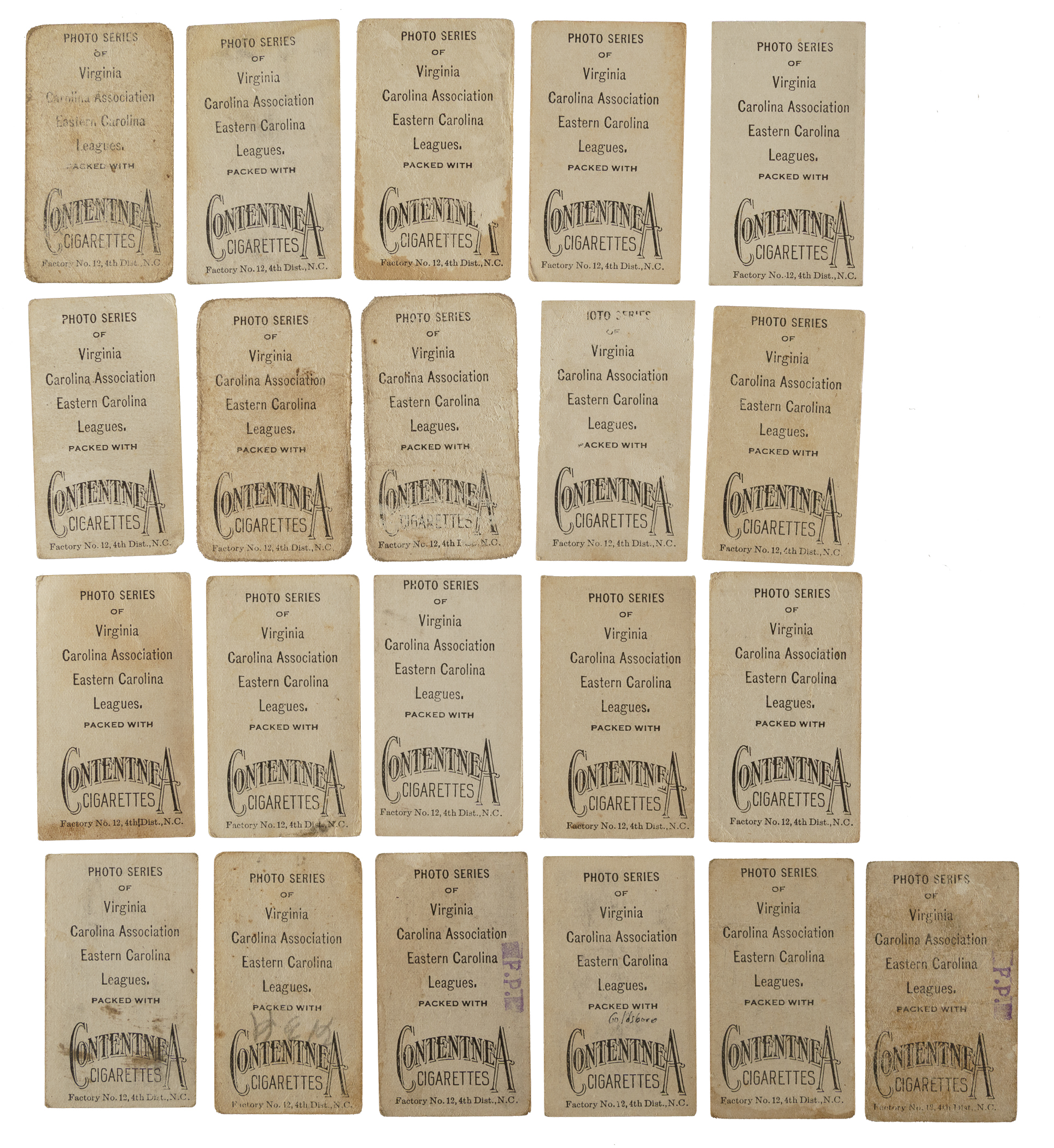Presented is an incredible collection of 117 different 1910 T209 Contentnea "Photo Series" Tobacco cards. Ninety-six cards have been professionally graded and encapsulated by SGC (91) and PSA (5), leaving just 21 cards unencapsulated. This is an extremely noteworthy assembly as it is only the fifth time in the past 21 years that we have offered a substantial group of cards from this set. (Please note B. E. Thompson dressed as Uncle Sam, one of the most fascinating and unusual cards in all prewar card collecting, is being sold individually in this auction.) We have been privileged to offer near-complete sets on behalf of the estates of legendary collectors Joe Pelaez and Paul Pollard in past years, but typically, we will find only one card or a few cards in an old-time or type-card collection. This group of 117 different cards (representing 52% of a complete set) is extremely substantial and far more cards than normally encountered at one time! The T209 "Photo Series" set is composed of 224 different players from the Virginia League, Carolina Association, and Eastern League. T209 Contentnea "Photo Series" are one of the rarest and (in large part because of their rarity) most overlooked of all tobacco-card issues. Although there are no Hall of Famers in this set, there are numerous extreme rarities and scarcer cards, some of which are included here. T209 Contentnea "Photo Series" Tobacco cards are among a small selection of elite sets that have long captured the imagination of many of the most legendary collectors, from the earliest days of serious collecting, perhaps more so in years past than even in recent times. The reason many great early collectors prized these cards so highly is twofold: 1) These cards could not (and cannot) simply be purchased in set form. They have to be collected. They are a challenge. 2) Ultimately, cards are about the players that are featured. Many of the players in T209 "Photo Series" are featured in few or no other sets. These characteristics make the real-photo T209 Contentnea set especially significant to the game of baseball and to the world of baseball cards, and especially appealing to the most sophisticated collectors. T209 cards also have a very distinctive design with striking player poses unique to this set.