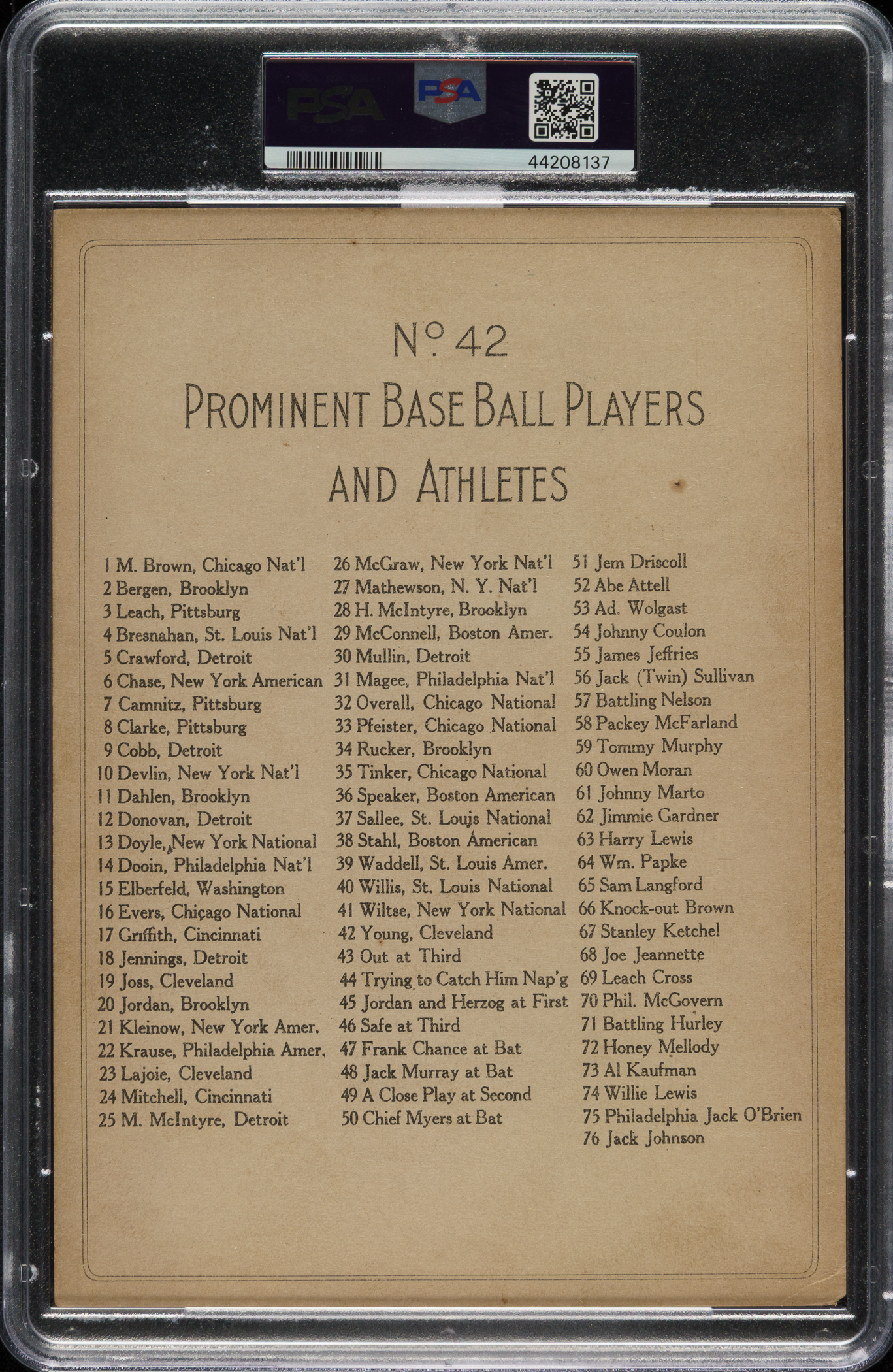Graded VG+ 3.5 by PSA. This is the ONLY example graded at this level by PSA with none higher! Superb mid-grade example of legendary Hall of Fame pitcher Cy Young, with a rarely-seen “no offer” checklist-back variation. The T3 Turkey Red is considered by many to be one of Cy Young's most important and majestic cards. This example has extremely bold and vibrant colors, flawless registration, and even wear on the corners. Downgraded due to a crease in the lower left. The fairly clean reverse of this card features a checklist of cards #1-76, but is missing the text below the checklist, which outlines the redemption offer in which coupons from Turkey Red, Old Mill, or Fez Cigarettes products could be exchanged by mail for one of the cards. These checklist (no offer) cards are particularly scarce. Turkey Reds are considered by many to be the most beautiful and well-made tobacco set ever issued. This card would make a significant addition to any high-quality Turkey Red, Hall of Fame, or Cy Young card collection. Awarded an MBA Gold Diamond by Mike Baker Authenticated for high-end eye appeal. A corresponding MBA sticker is affixed to the front of the holder.