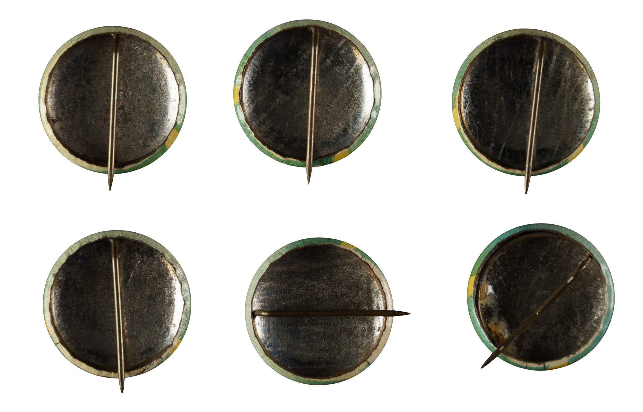 This 54-player pin set (plus three team variations for a total of 57 pins) was issued by Orbit Gum circa 1932 and is catalogued in the American Card Catalog as "PR2." This is one of the few quality pin sets of the era, and also one of the few pin sets to be issued by a gum card manufacturer. This set, of course, is closely related to the 1933 R305 Tattoo Orbit set, one of gum-card collecting's premier 1930s issues and was issued at the same time. Each pin measures 13/16 inch in diameter and features a player portrait lithograph set against a green background. The player's name and team is printed on a yellow strip beneath the portrait image. Each pin is numbered at the very bottom and the set begins to skip number after #40. The set is highlighted by Jimmie Foxx, Dizzy Dean, and many other Hall of Famers. The surface of these pins chip and wear very easily, as they are "lithos." The colorful images are printed directly on the metal pins as opposed to being printed on paper and then covered with celluloid. The complete set ranges in condition from Vg to Ex-Mt, averaging Vg-Ex/Ex. The backs of most pins are either partially or completely rusted, a common characteristic for these issues. One pin (English/without bat) is graded EX 5 by PSA. This issue is not yet on the radar of most 1930s gum card collectors, but would be a worthy accompaniment to any 1930s gum card collection. Total: 57 pins.