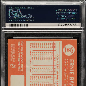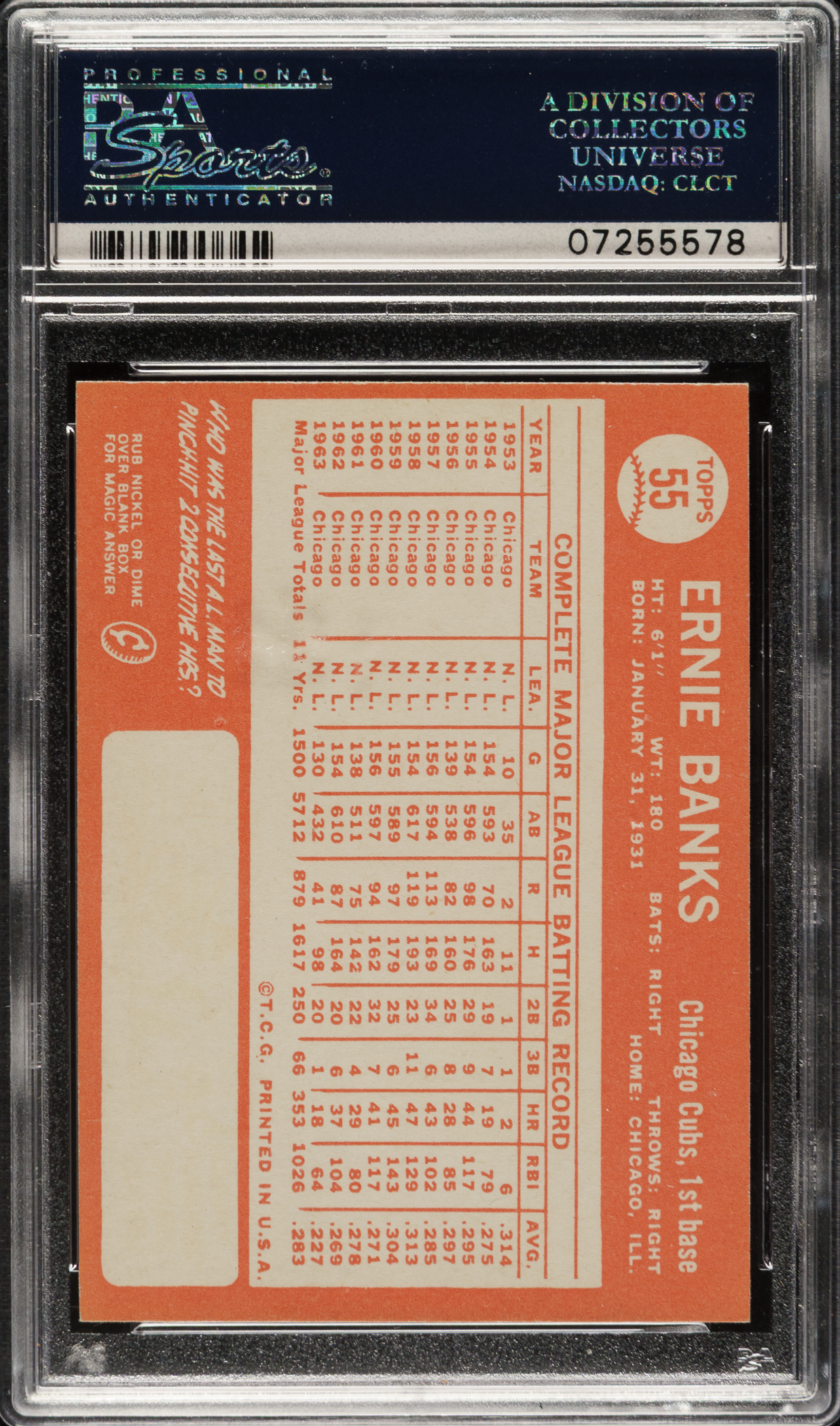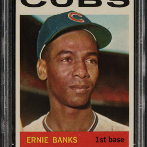 Graded MINT 9 by PSA. Pedigreed from the Mr. Cub Collection. Exceptional ultra-high-grade example of Hall of Famer Ernie Banks from the 1964 Topps set. Crisp and clean, both front and back, with bold colors, superb image quality, and four sharp corners. Clean reverse. This card would be a worthy addition to any world-class Ernie Banks, Chicago Cubs, or Hall of Fame card collection.