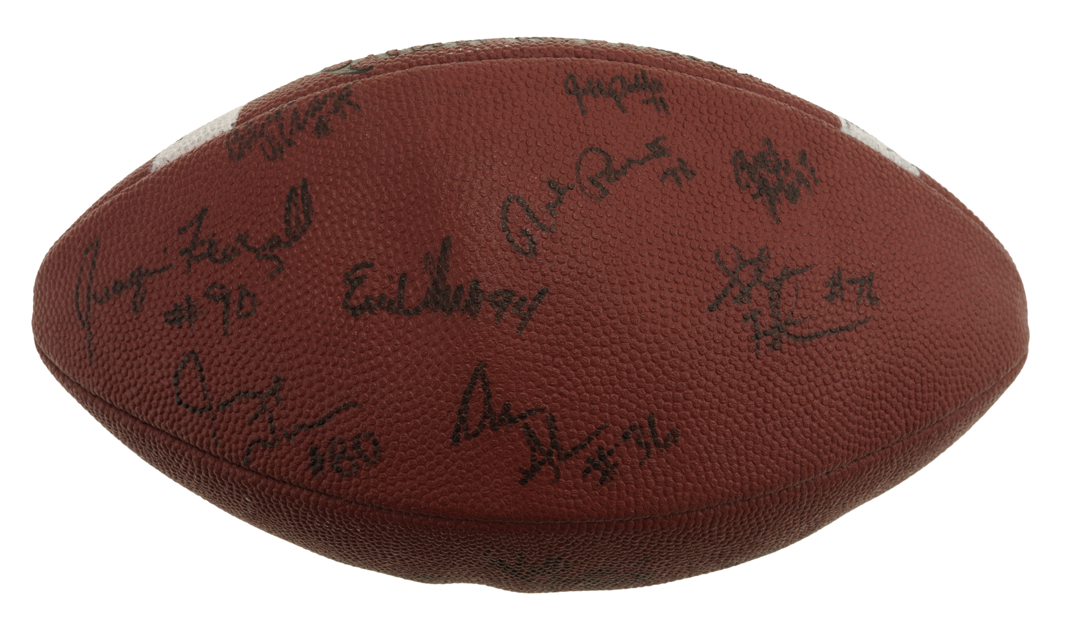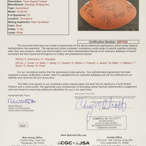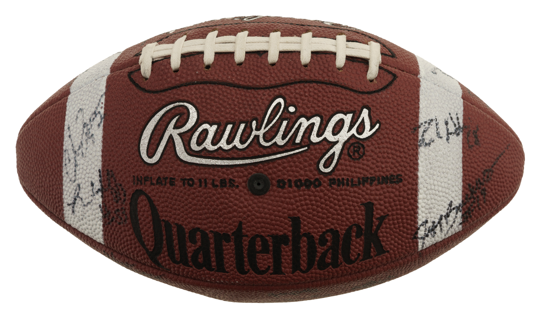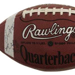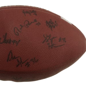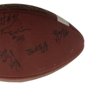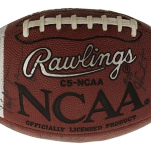 Official Rawlings C5 NCAA College Quarterback Football signed in black marker by 25 members of the 1997 Michigan Wolverines National Champion team. Notable signatures include Charles Woodson, Tom Brady, Jermane Tuman, Chris Howard, Steve Hutchinson, Aaron Shea, Juaquin Feazell, Jon Jansen, Nate Miller, Josh Williams, Terrence Quinn, Rob Renes, and Ryan Parini. The ball is partially deflated but is otherwise in Excellent condition overall. Full LOA from James Spence/JSA. The size/weight of this item requires that there will be an additional shipping charge for this lot.
