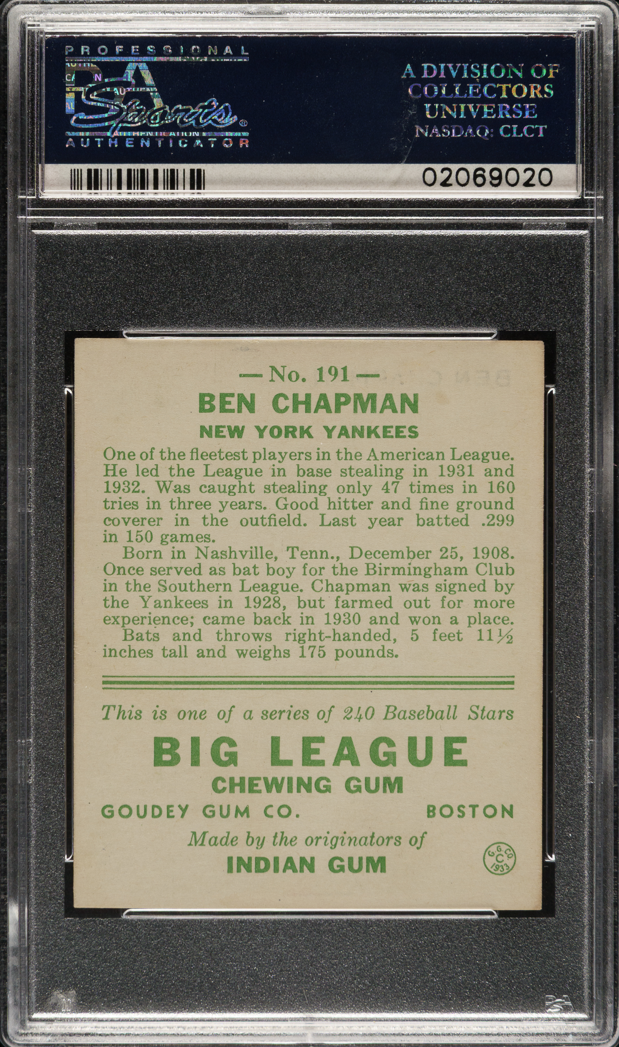 Graded NM-MT 8 by PSA. Outfielder Ben Chapman of the New York Yankees. Only one example has been graded higher out of the 392 examples graded by PSA to date.