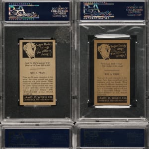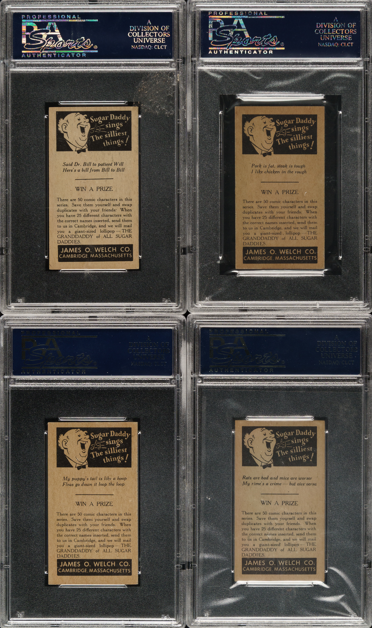 Complete 50-card set of Circa 1950s James Welch Sugar Daddy "Famous Comic Characters" trading cards. These cards were released in two different types, coupon and fill-in (with the coupon type being much rarer). This set includes both types of three cards (#14, 36, and 46) and consists of eight additional coupon types (#6, 12, 29, 32, 33, 35, 37, and 38); for a total of eleven. Condition is 8% Nr/Mt, 43% Ex to Ex-Mt, and 49% Vg to Vg-Ex (including 15% lesser). Ten cards have been professionally graded and encapsulated by PSA. Ten PSA-graded cards: #9 (EX-MT 6), 10 (EX-MT 6), 17 (EX-MT 6), 18 (EX 5), 20 (NM 7), 23 (EX-MT 6), 27 (NM 7), 42 (EX-MT+ 6.5), 47 (EX-MT 6), and 49 (EX-MT 6). Total: 53 cards. The size/weight of this item requires that there will be an additional shipping charge for this lot.