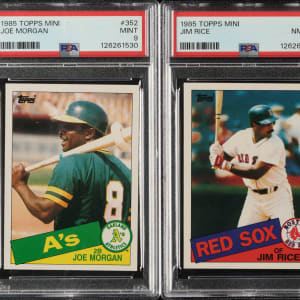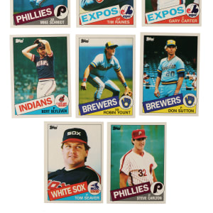 Presented is an extraordinary ultra high-grade near-complete set (130 of 132) of 1985 Topps Mini baseball cards, one of the most unusual sets of the 1980s. Missing only #700 Murray and 760 Ryan for completion. The 1985 Mini cards are 10% smaller than the standard Topps cards and were test marketed in Canada. Aside from their smaller size and brighter card stock, they are otherwise identical to the standard 1985 Topps cards. Condition is 88% Nr/Mt-Mt to Mint (mostly Nr/Mt-Mt) and 12% Nr/Mt (including a couple slightly lesser). We have selected three cards for grading and encapsulation by PSA. Keys: #150 Rice (NM-MT 8), 230 Carter (Nr/Mt-Mt+), 340 Yount (Nr/Mt-Mt), 352 Morgan (MINT 9), 355 Blyleven (Nr/Mt-Mt), 360 Carlton (Nr/Mt), 500 Schmidt (Nr/Mt-Mt), 610 Morris (MINT 9), 630 Raines (Nr/Mt-Mt+), 670 Seaver (Nr/Mt), and 729 Sutton (Nr/Mt-Mt). This is a very attractive ultra high-grade near-complete set (minus two) loaded with Hall of Famers and stars from the 1980s. Total: 130 cards.