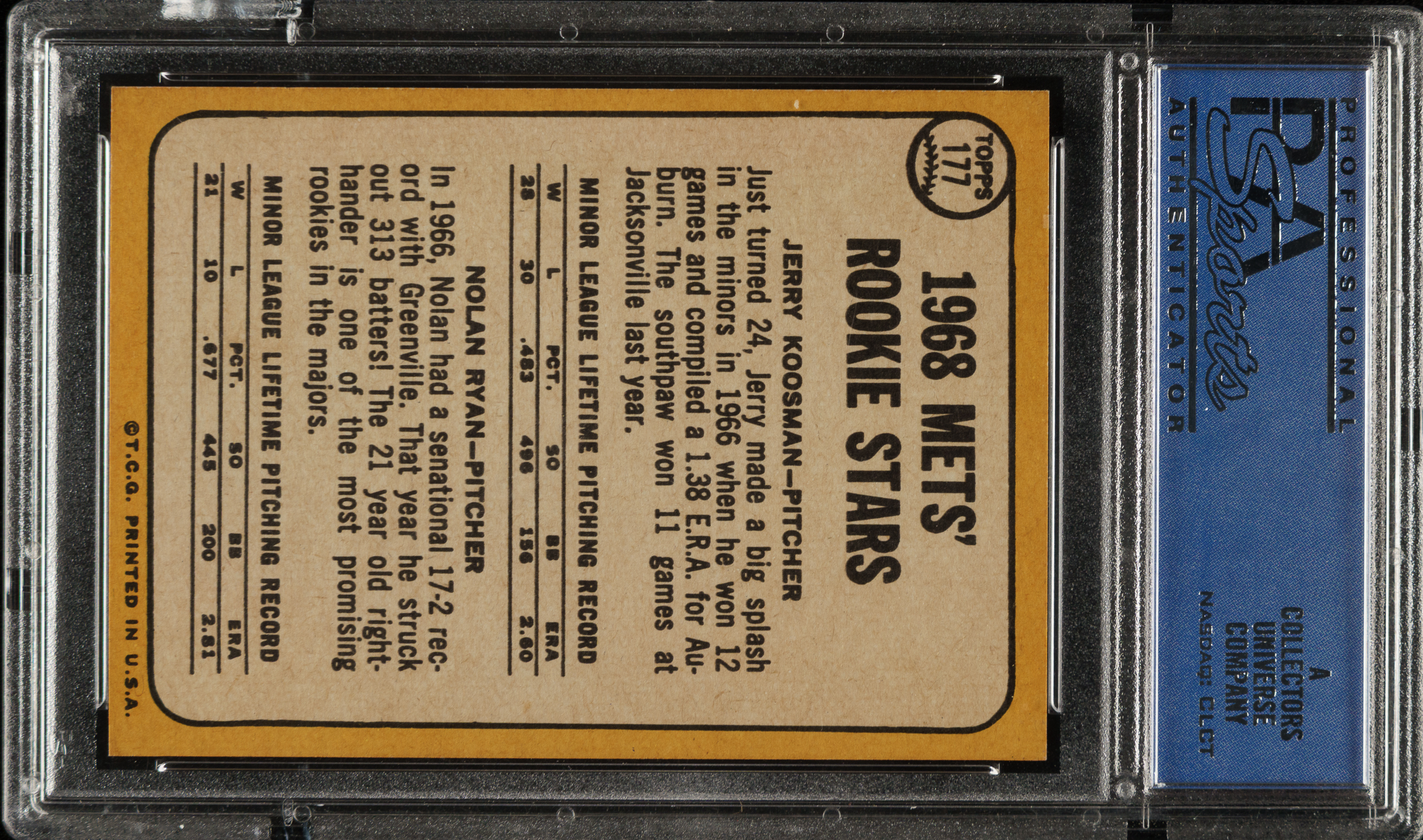 Graded MINT 9 (OC) by PSA. High-grade rookie example of New York Mets Hall of Fame pitcher Nolan Ryan, one of the keys to the 1968 Topps set and one of the most famous of all Topps cards. This example has bold colors, superb image quality, sharp corners, and centering toward the extreme left (hence the qualifier). The reverse is clean and boldly printed. A very attractive example of one of modern card collecting's classics.