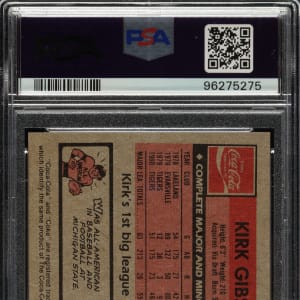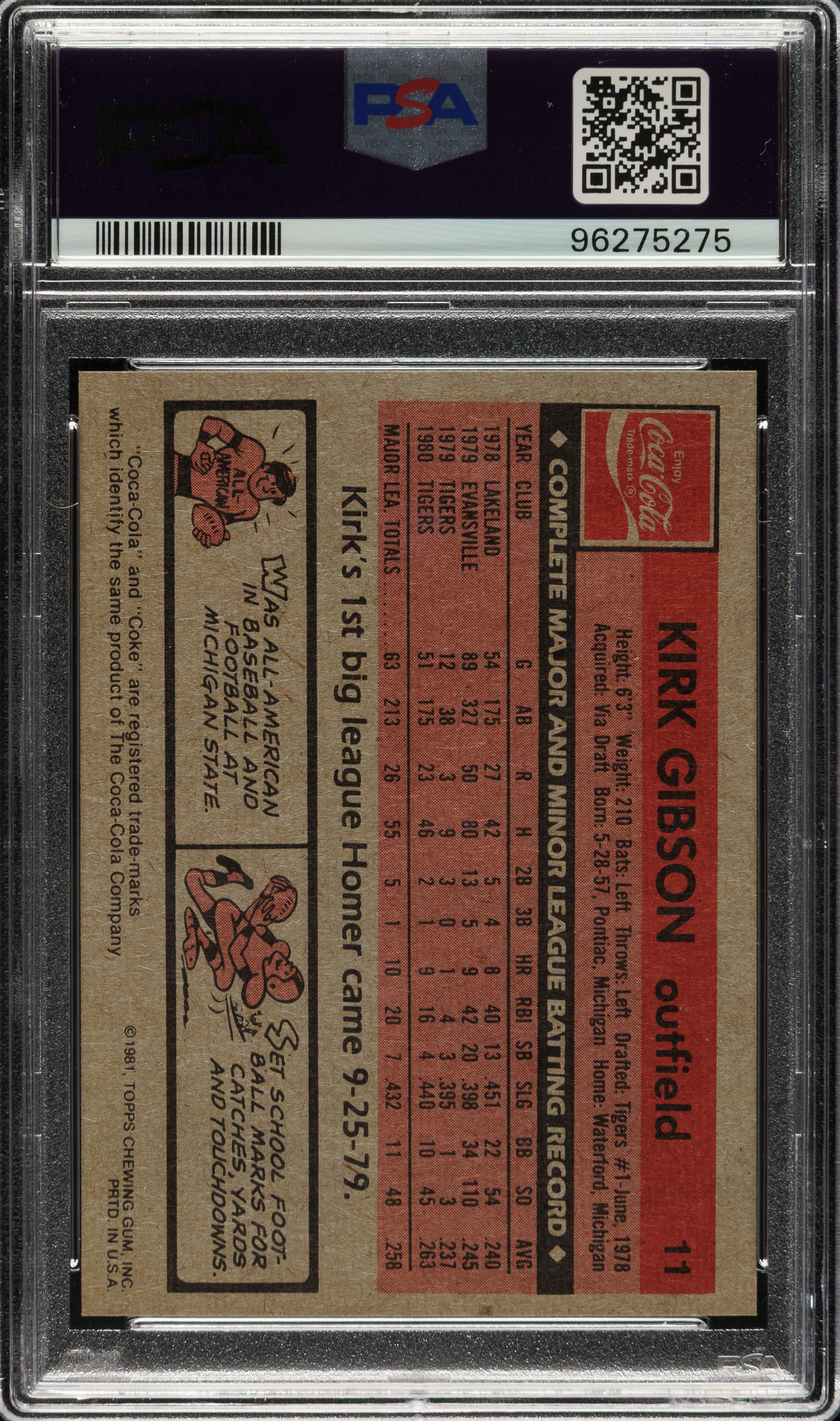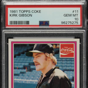 Graded GEM MINT 10 by PSA. Stunning example of Kirk Gibson (Detroit Tigers) from the 1981 Topps Coca-Cola set. This set is composed of eleven 12-card team sets distributed regionally by Topps. Along with the Tigers, other teams to appear in the series include the Cubs, Mets, and Red Sox. With the exception of the Coca-Cola logo in the top-right corner, the design is the same as the 1981 Topps set. The offered card is bright, crisp, and clean with sharp corners and excellent centering. A tremendous example from this scarce regional issue.
