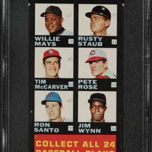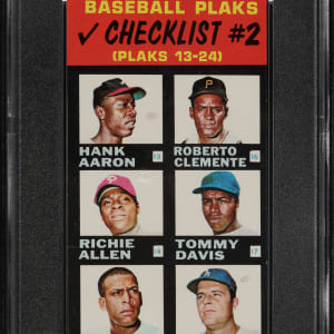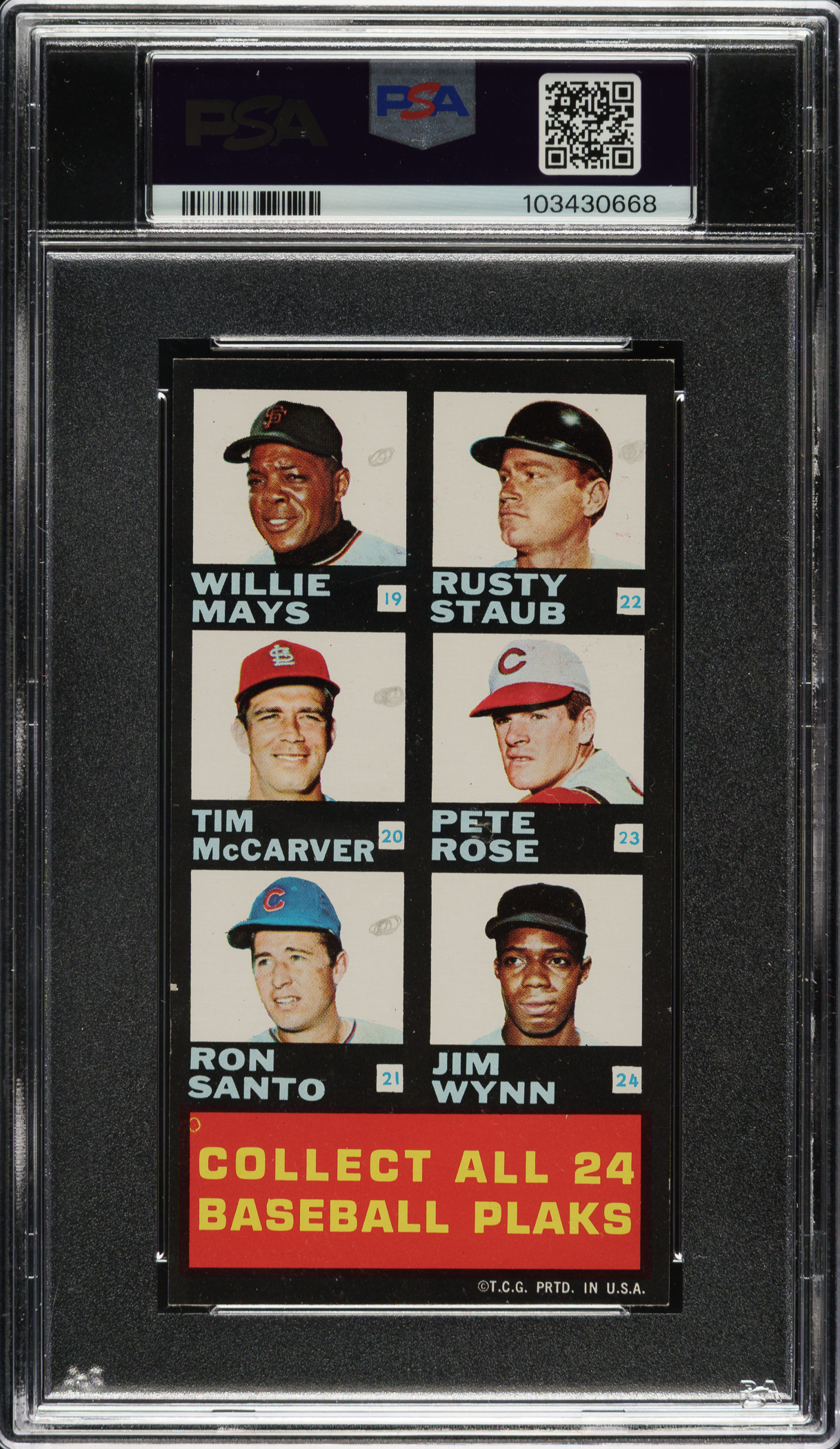 Graded GOOD 2 by PSA. Presented is an absolutely stunning, numerically graded example of card #2 Checklist National League from the extraordinarily rare 1968 Topps Plaks test set. The card features color portraits of each of the 12 National League players in the set, including Hank Aaron, Roberto Clemente, Don Drysdale, Willie Mays, and Pete Rose. This is one of rarest sets of all 1960s Topps test issues. This is one of the few Topps sets from the 1960s that make 1968 Topps 3-Ds look common! This set was never actually issued to the public, and fewer than 100 examples are known to exist. The offered card has been assigned a numerical grade, which is rarely seen from this issue, as most examples seen in the collecting community are hand-cut from a sheet and remain encapsulated in "Authentic" holders. This is only the fourth numerically graded "National League" example we have offered in the past 21 years! This example is bright, crisp, and clean, with four strong corners, bold colors, and perfect player images. Downgraded due to light creasing, pencil marks, and a couple surface indentations. This is one of the most interesting, attractive, and high quality of all Topps test issues. Ironically, this contrasts drastically with the quirky plastic Plaks themselves, which are being checklisted by these beautiful cards and which have a completely different charm to Topps test issue collectors. The checklist cards have been largely overlooked in the marketplace in part due to their rarity but are a favorite of advanced star collectors who are aware of the set. This is a very attractive and numerically graded example from this rare and substantial Topps test issue, with a far better appearance than its technical grade might suggest.