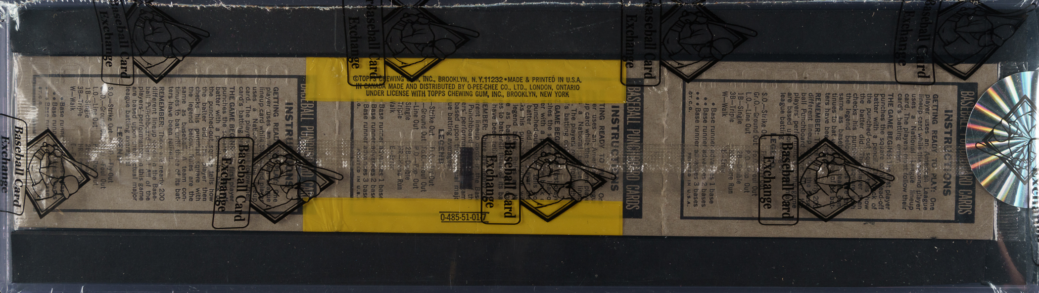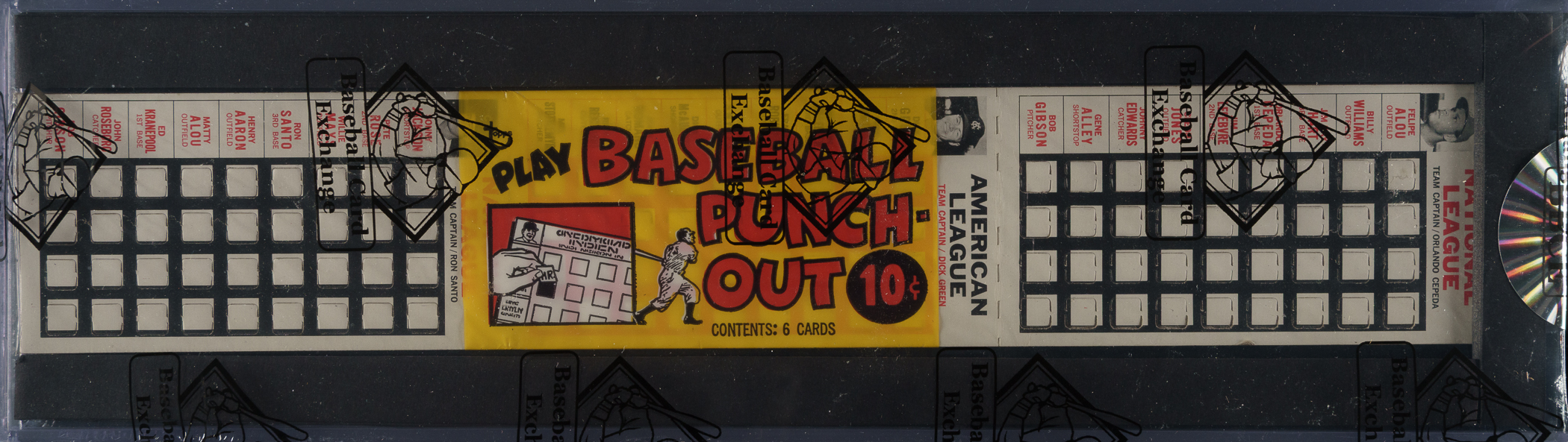 Original unopened 10-cent cello pack from the 1967 Topps "Punch-Outs" series, housing two three-card panels for a total of six cards. Aside from its extreme rarity, this cello pack is even more noteworthy as it features Hall of Famers Orlando Cepeda and Ron Santo on top of the pack. The pack comes shrink-wrapped by Baseball Card Exchange (owned by Steve Hart, the foremost expert on unopened material). This is one of the rarest sets of all 1960s Topps test issues. This set was distributed in just a few regions in the Maryland area. They were issued in cello packs (as offered here) containing two three-card panels (six cards per pack), with cards perforated so that they may be separated from one another. Each of these uncut panels (approx. 2-1/2 x 14-1/8 inches) features three game cards with their respective "Team Captain" pictured on the top. The reverse of the cards features instructions on how to play a baseball game by punching out the small squares. Single cards from this extremely rare test issue pop up from time to time, but uncut panels as originally issued are almost never seen. This is an extraordinary cello pack from this extremely rare 1960s Topps test issue.