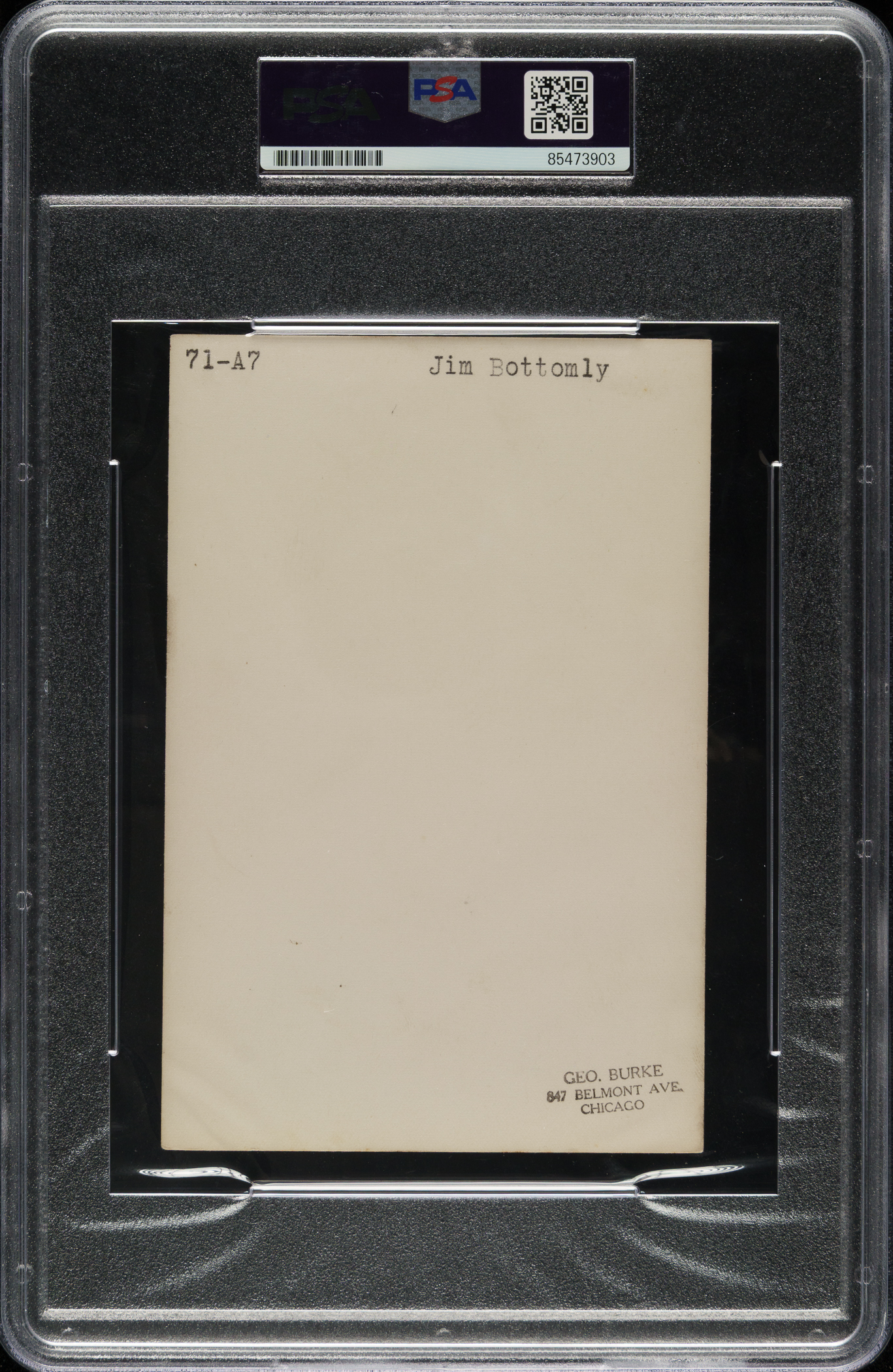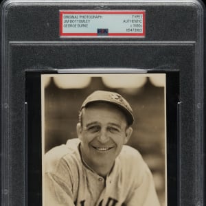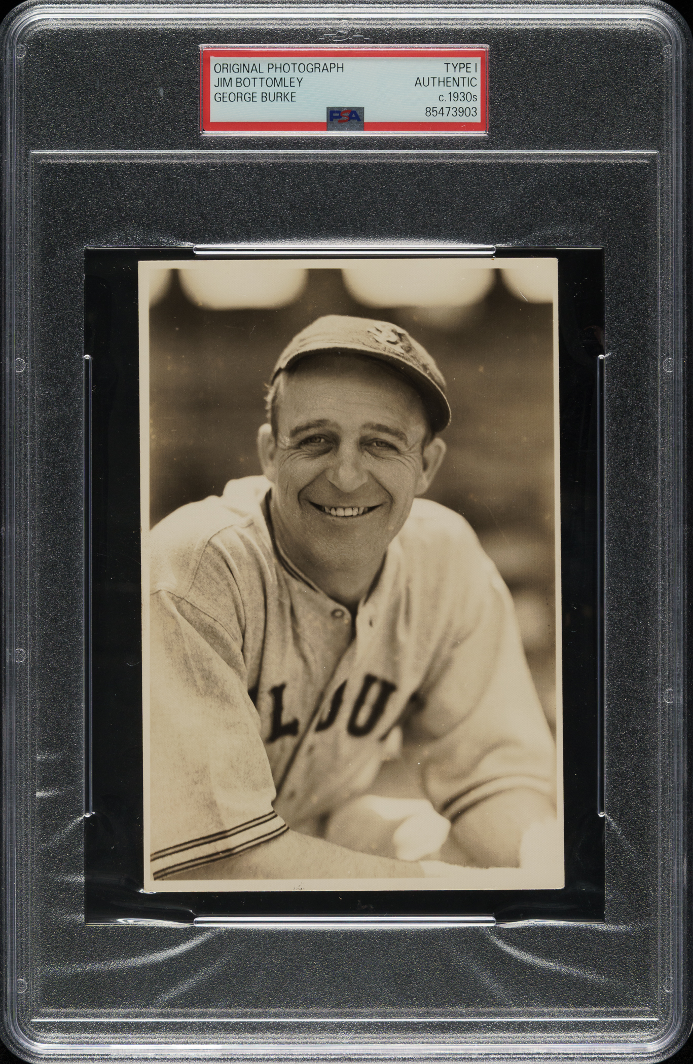 Original photo, taken by noted Chicago baseball photographer George Burke, capturing Hall of Fame first baseman Jim Bottomley, circa 1930s. Encapsulated and certified as an original Type I photograph by PSA/DNA. The close-up image captures Bottomley smiling. Burke's credit stamp appears on the reverse along with Bottomley's name (misspelled Bottomly) and a production number. The photo (4 x 6 inches) is in Excellent condition overall.