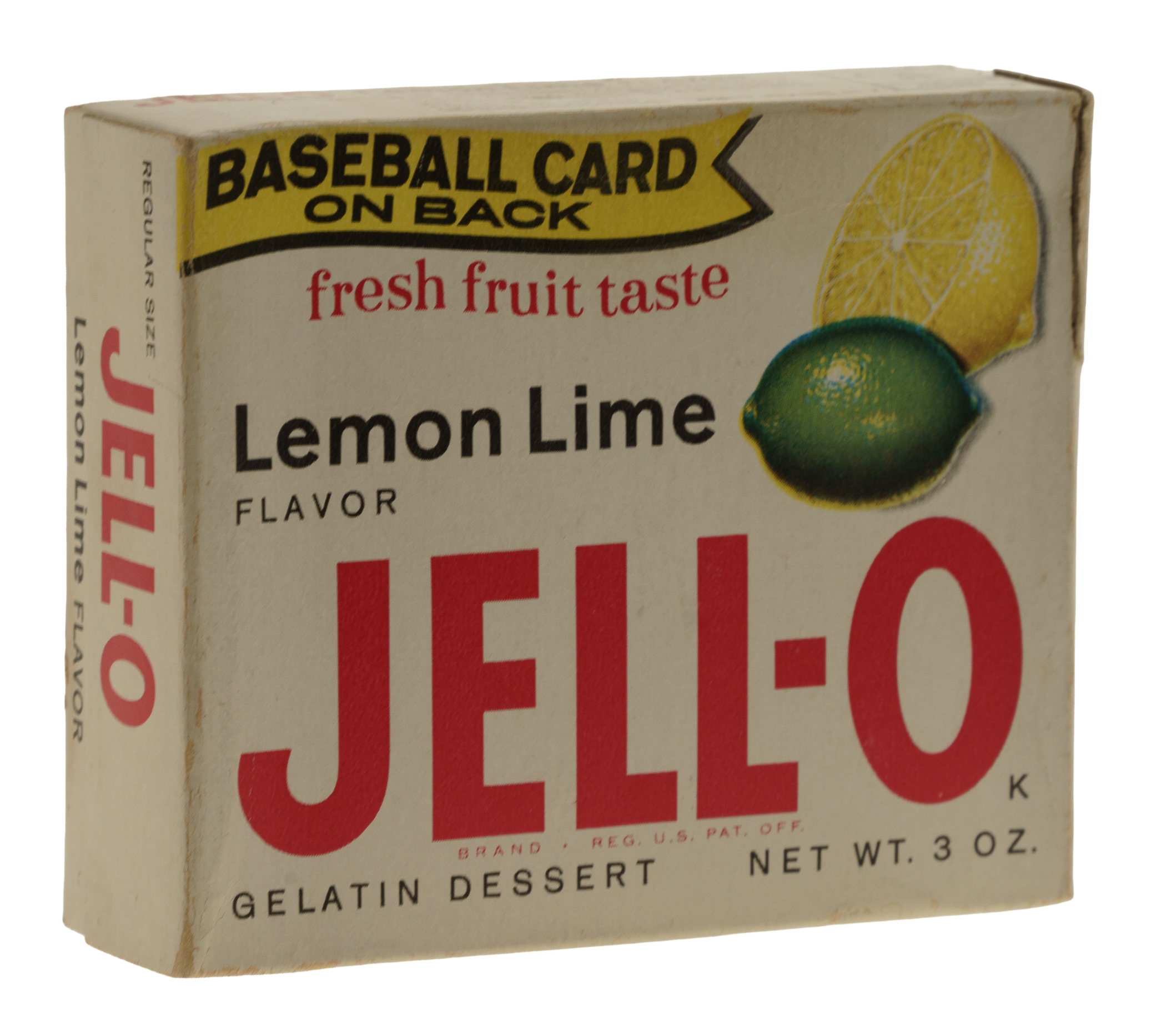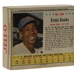 In 1963, if you were walking down the supermarket aisle, you would have seen unopened boxes of Jell-O stacked along the shelves, with the bold company logo on the front along with the promise of a baseball trading card on the reverse. Eager children would have undoubtedly scoured the available boxes for their favorite player and implored their parents to buy that very box so they could cut out the card and add it to their collection. One of the more popular players at that time would have been Ernie Banks who, in 1958 and 1959, won back-to-back National League MVP awards. One dedicated collector had the foresight to realize what a remarkable collectible an intact full box would someday be and kept his prized Banks box carefully guarded for all these years! Presented here is an exceptional complete 3 oz. unopened box of Lemon Lime Jell-O featuring an example of #169 Ernie Banks, also known as "Mr. Cub", on the reverse. The preservation of this box is most improbable. We have seen only a handful of complete boxes offered for sale at public auction in the last decade, many of which have been flattened or suffer from severe condition issues. (Amazingly, we have eight examples in this current auction.) The box (3.5 x 2.875 x 1 inches) is in overall Very Good condition with light shelf wear, including a small tear on the actual card area (lower-right corner). Jell-O boxes are rarely seen in their original form, let alone with one of the key Hall of Famer cards to the series prominently displayed on the back. This is an extremely impressive collectible that would be at home in any world-class Ernie Banks or food-issue collection.