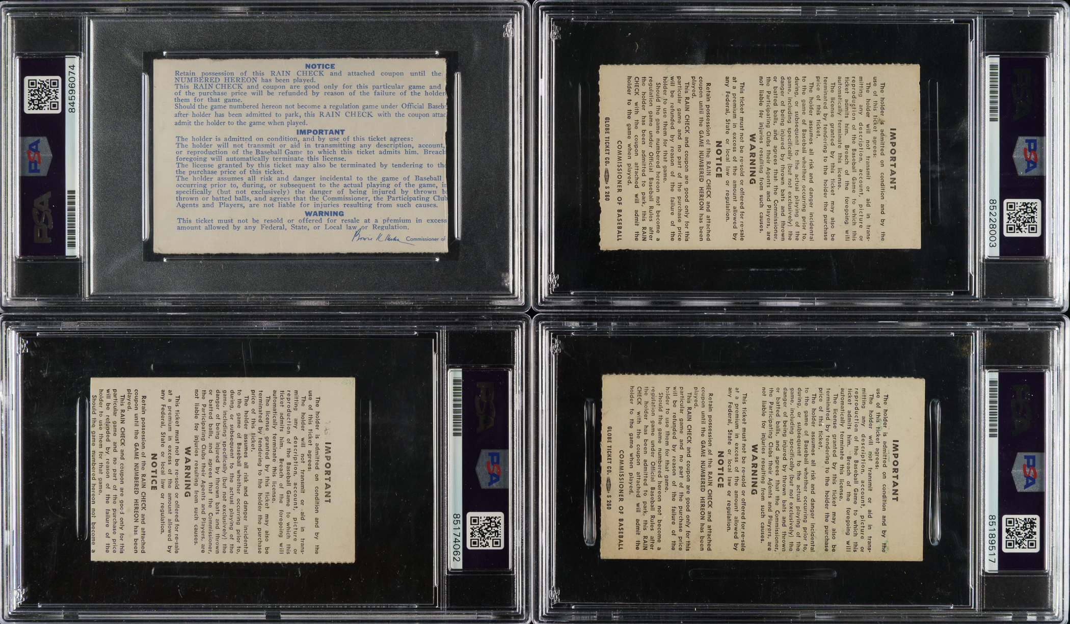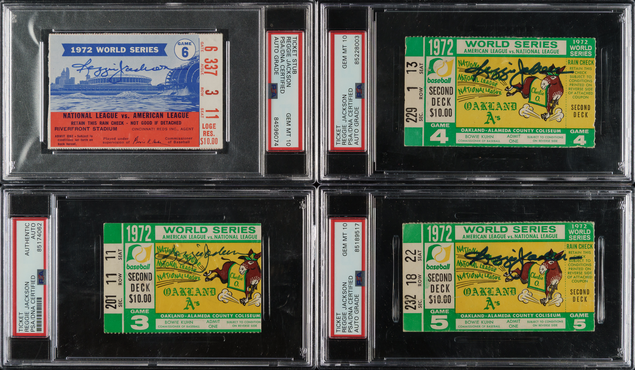 Collection of four World Series ticket stubs from the 1972 World Series between the Oakland Athletics and Cincinnati Reds, each signed by Hall of Fame outfielder Reggie Jackson. Despite Jackson not playing in the series due to injury, his Athletics defeated the Reds in seven games. PSA/DNA has encapsulated each ticket in the collection. This collection consists of the following: 1) Game 3. PSA/DNA has certified both the ticket stub and signature as "Authentic." 2) Game 4. PSA/DNA has graded the signature GEM MINT 10 and certified the ticket stub as "Authentic." 3) Game 5. PSA/DNA has graded the signature GEM MINT 10 and certified the ticket stub as "Authentic." 4) Game 6. PSA/DNA has graded the signature GEM MINT 10 and certified the ticket stub as "Authentic. Total: 4 signed ticket stubs.
