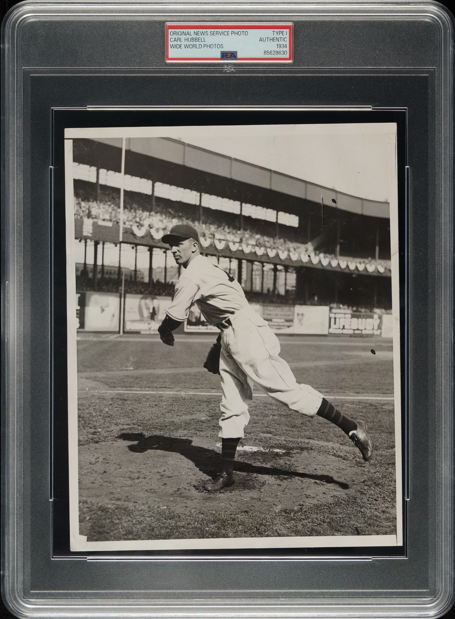 Original news photo of Carl Hubbell as a member of the New York Giants in 1934. Encapsulated and certified as an original Type I photograph by PSA/DNA. Hubbell is captured warming up on the sidelines. A "Wide World Photos" credit stamp appears on the reverse, as does an "Oct 11 1934" date stamp and a few editorial notations. The photo, which has been trimmed to its current dimensions of 7 x 9 inches, displays a crease in the upper right and a strip of excess paper on the reverse. Very Good condition overall.