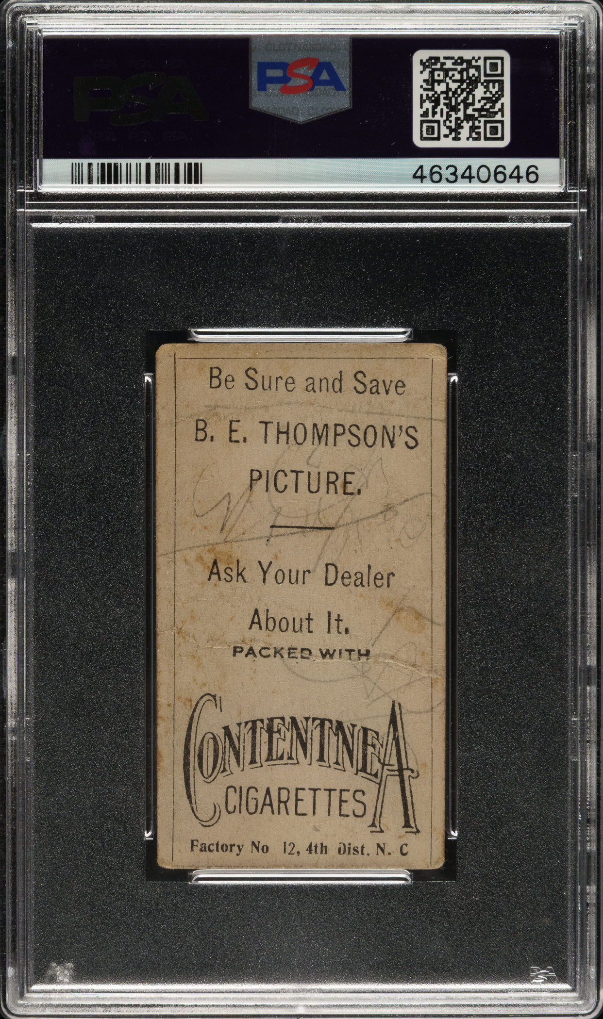 Rarely offered example of one of the most fascinating and unusual cards in all prewar card collecting: the 1910 T209 Contentnea Cigarettes "Photo Series" card featuring B. E. Thompson. This card has long intrigued collectors and even casual observers as it is unlike any other baseball card ever produced, featuring Thompson, a nonplayer who is believe to have grown tobacco in the area, dressed as Uncle Sam. Printed on the reverse of each Thompson card is text that reads “Be Sure and Save B. E. Thompson’s Picture. Ask Your Dealer About It.” The text implies that Thompson's card should be of special importance to collectors who discover it inside a pack of Contentnea Cigarettes, but the exact reason as to why was not clear until recent years. An article in Old Cardboard (issue #28) by collectors Michael Peich and Tim Newcomb, both true card scholars and avid researchers of this set and others, establishes that Thompson's card was used in conjunction with a redemption offer by the manufacturer, Erwin-Nadal. The premium for which his card was to be exchanged was a souvenir album. The card displays a bold image and the reverse is boldly printed. Graded POOR 1 (MK) by PSA. There is heavy creasing and pencil writing front and back, which is responsible for the card receiving such a modest grade. The T209 "Photo Series" set is composed of 224 different players from the Virginia League, Carolina Association, and Eastern League. T209 Contentnea "Photo Series" is one of the rarest and (in large part because of its rarity) most overlooked of all tobacco-card issues. This is a presentable example of the most desirable card from the series, which would be an exceptional addition to any T209 set or type-card collection.