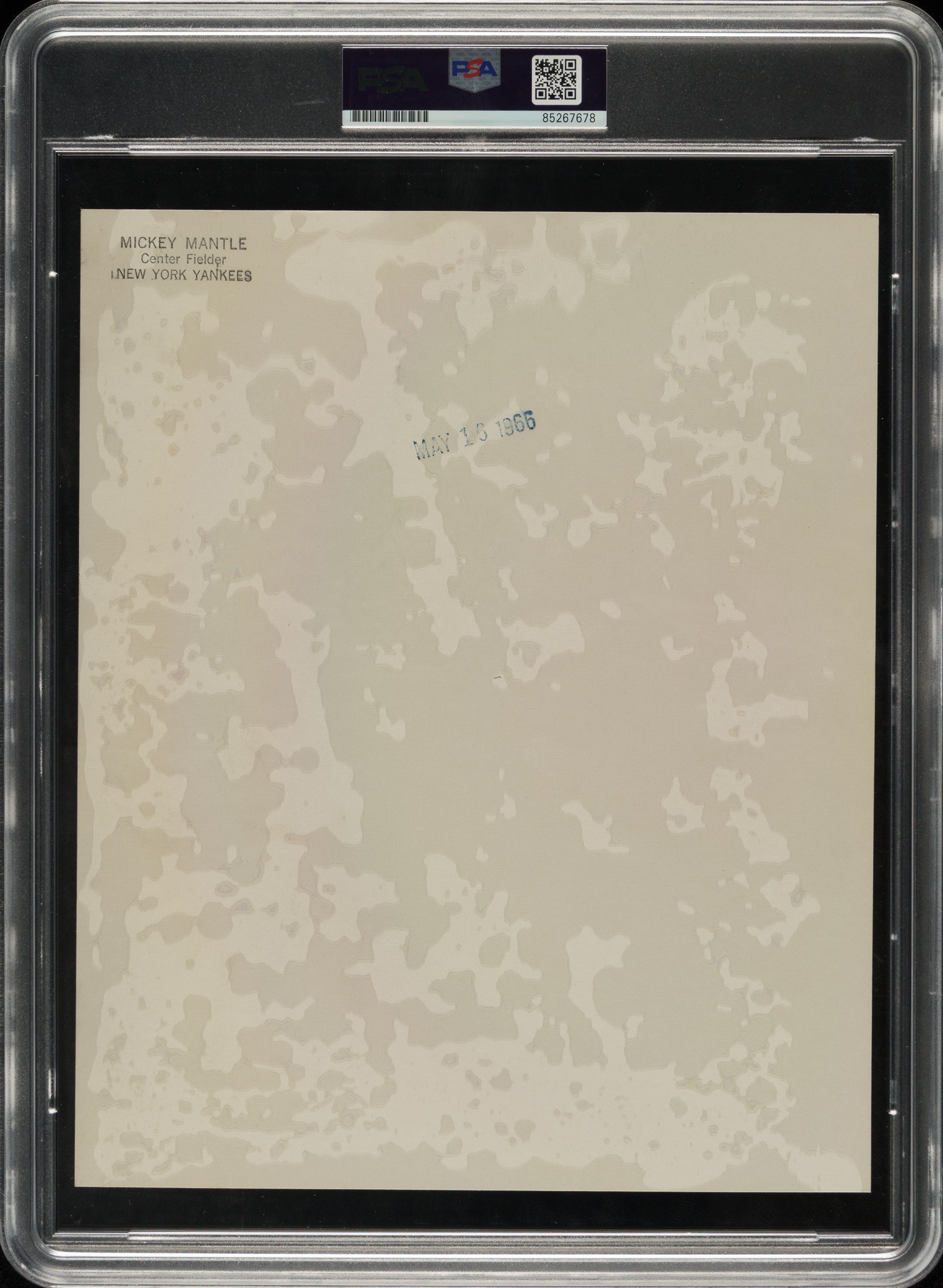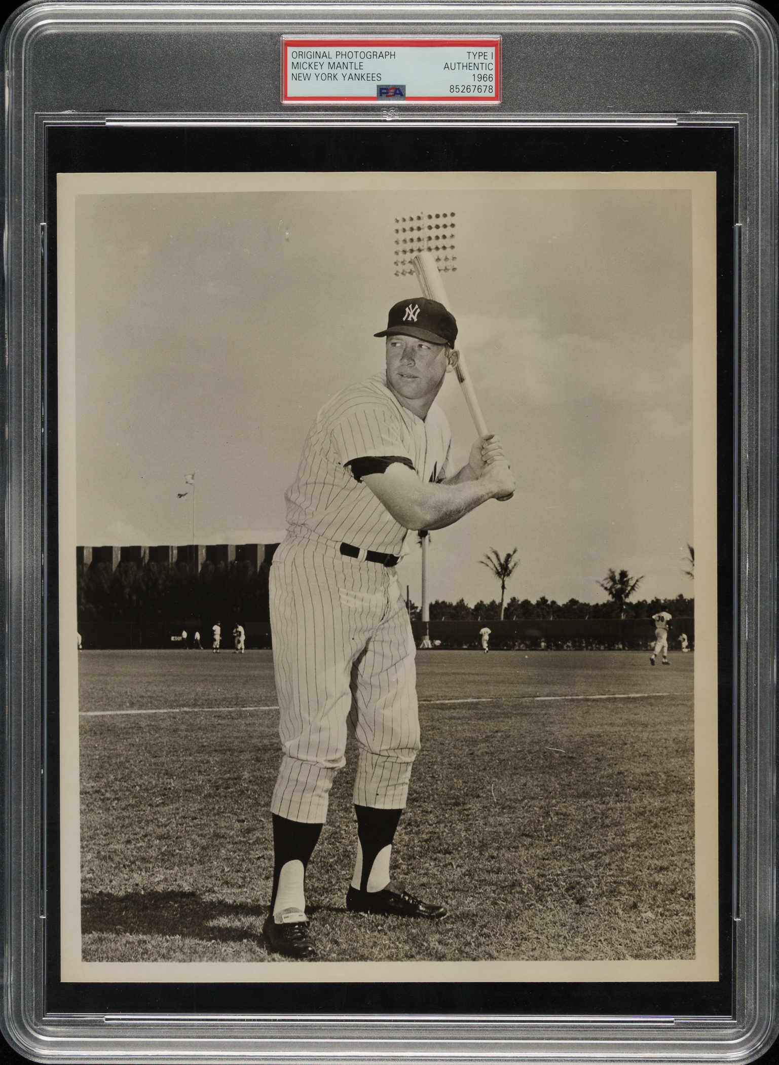 Original New York Yankees photo of Mickey Mantle during the 1966 season. Encapsulated and certified as an original Type I photograph by PSA/DNA. Mantle is captured striking a batting pose on the sidelines during spring training. The reverse displays a "May 16, 1966" date stamp and an additional stamp featuring Mantle's name, position, and team. The photo (8-1/8 x 10 inches) is in Excellent to Near Mint condition overall.