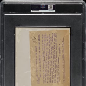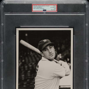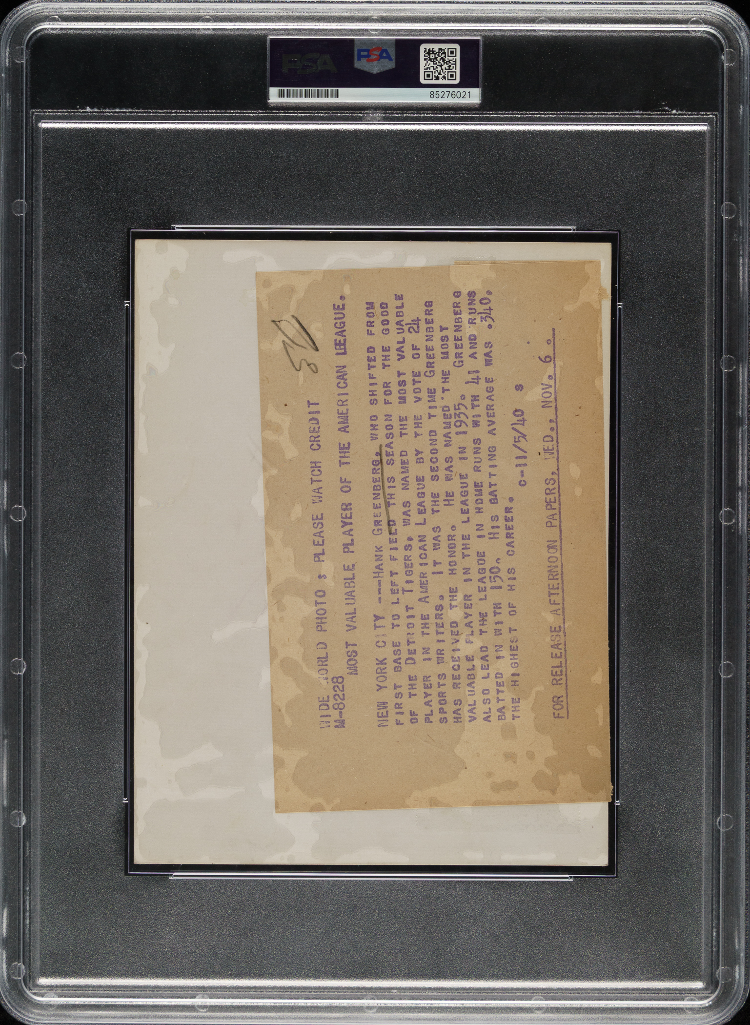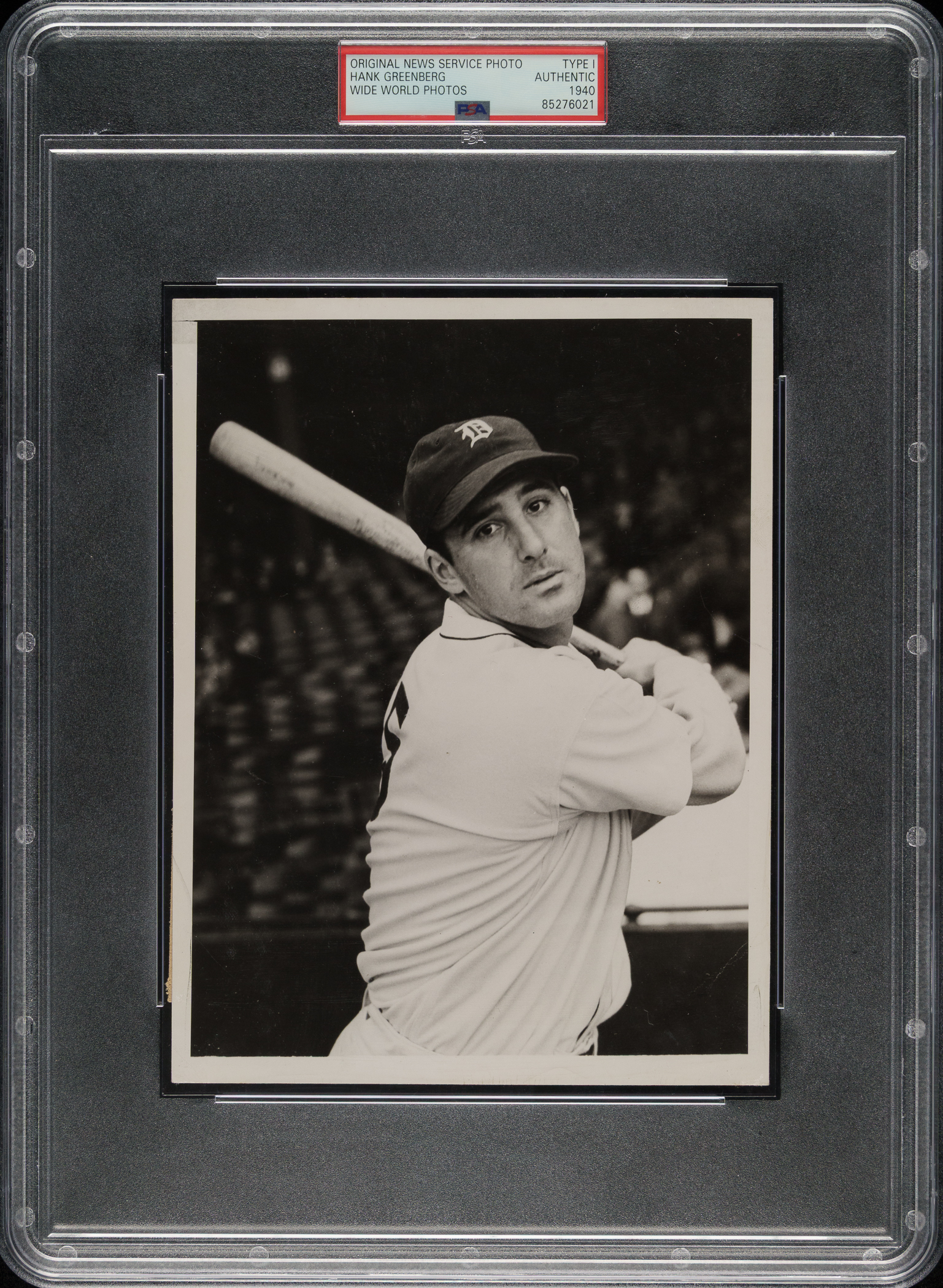Original news photo of Hall of Fame first baseman Hank Greenberg in 1940 as a member of the Detroit Tigers. Encapsulated and certified as an original Type I photograph by PSA/DNA. The photo captures Greenberg close-up in a swing-through pose. The original "Wide World Photos" news caption dated "11/5/40" appears on the reverse. The photo (6-1/8 x 8 inches) has a few light creases. Very Good to Excellent condition overall.