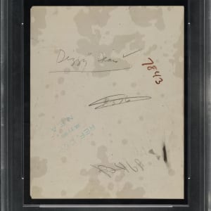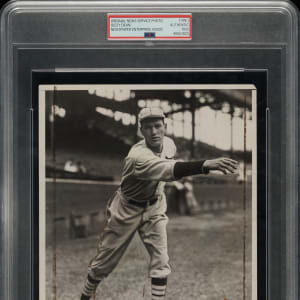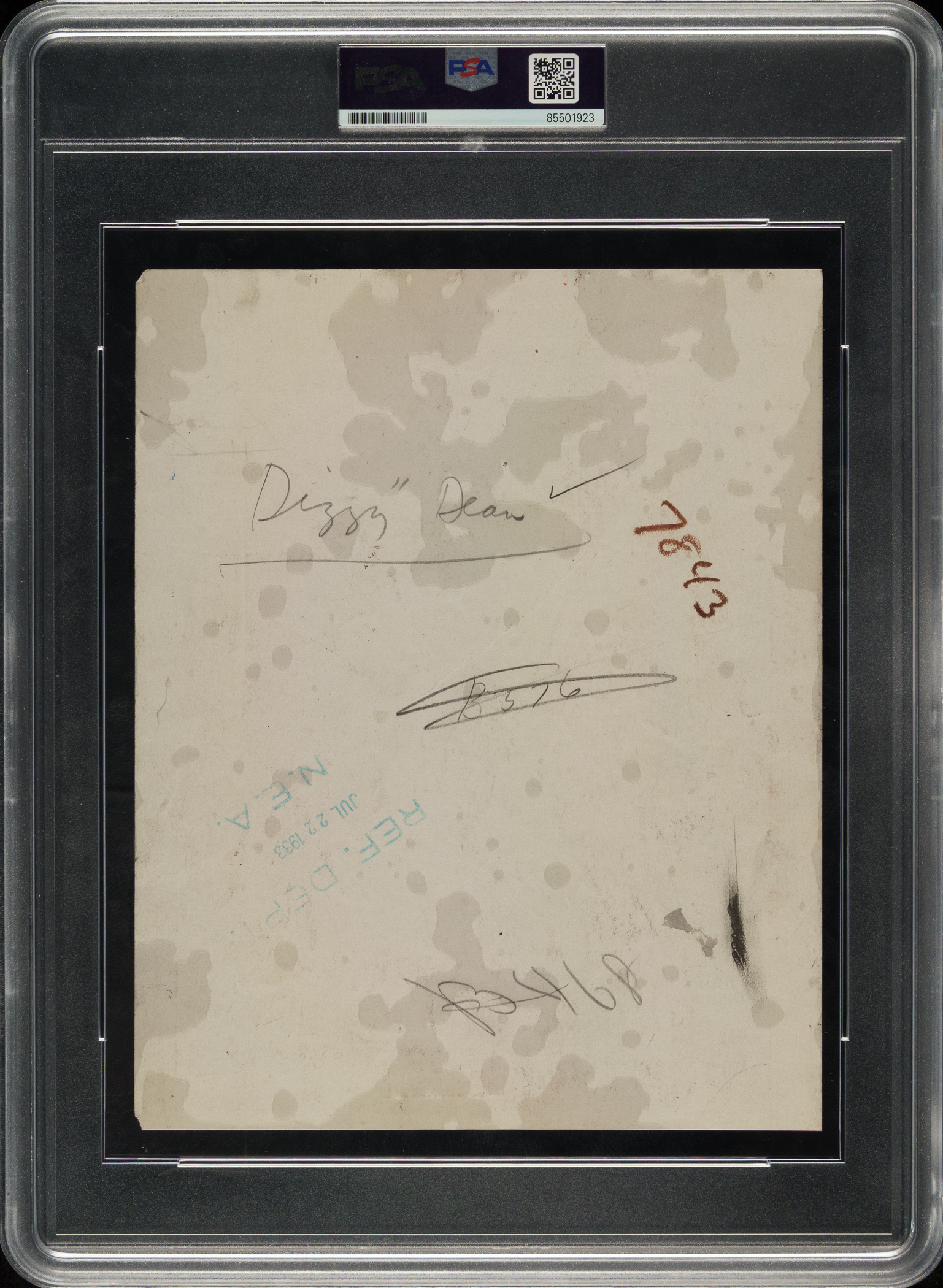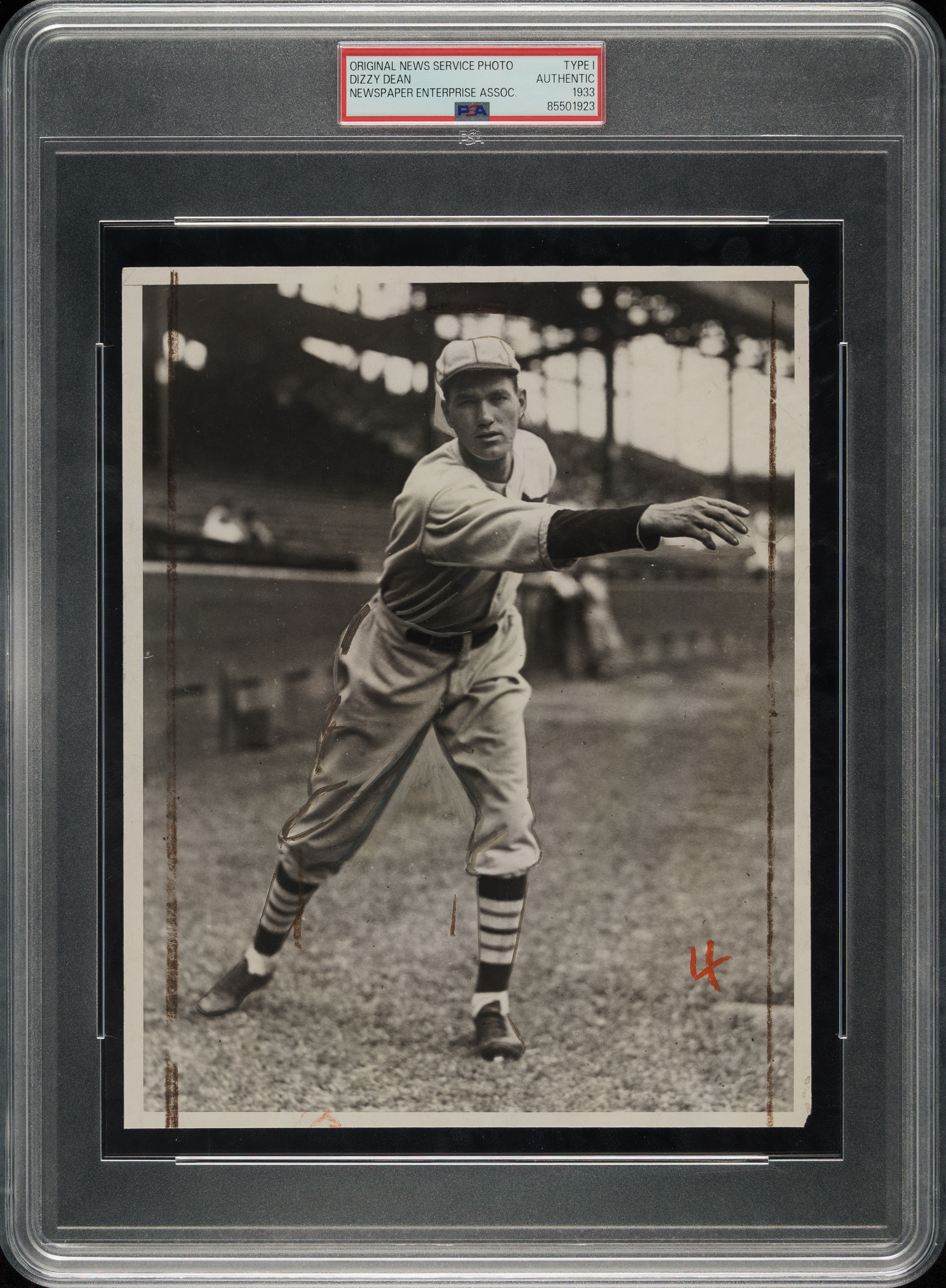 Original news photo of Hall of Fame pitcher Dizzy Dean in 1933 as a member of the St. Louis Cardinals. Encapsulated and certified as an original Type I photograph by PSA/DNA. The photo captures Dean close-up in a follow-through pose. A "Newspaper Enterprise Association" credit stamp appears on the reverse, as do several editorial markings. The photo (7 x 8.75 inches) displays two chipped corners and light creasing. Editorial crop lines and the handwritten number "4" appear on the front. Good to very Good condition overall.