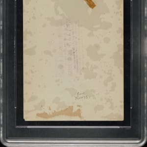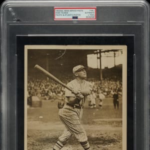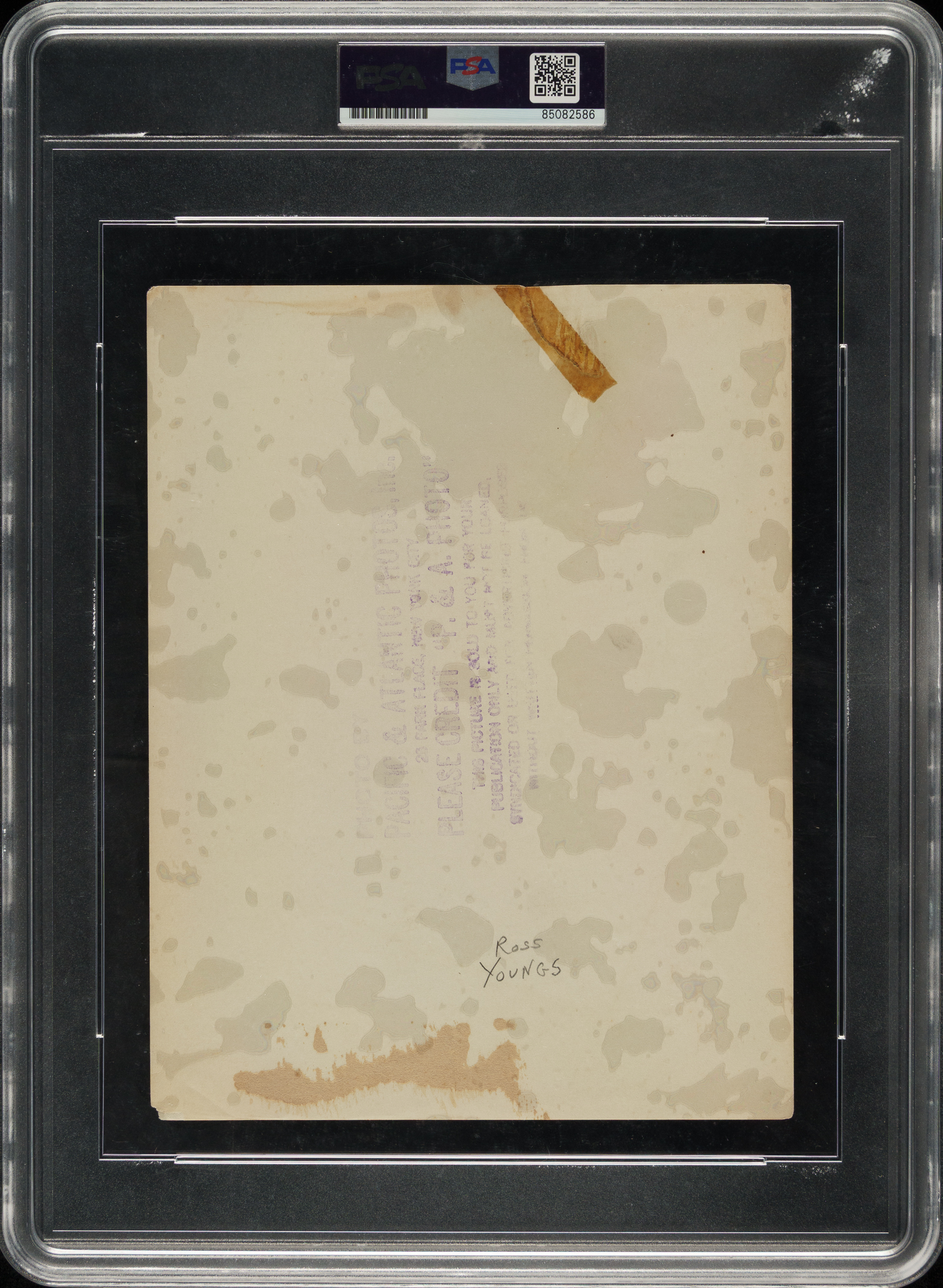 Original news photo of Hall of Fame outfielder Ross Youngs as a member of the New York Giants, circa 1920s. Encapsulated and certified as an original Type I photograph by PSA/DNA. The photo captures Youngs close-up in a swing-through pose. A "Pacific & Atlantic Photo" credit stamp appears on the reverse, along with Youngs' handwritten name and a bit of paper residue. The photo (6.5 x 8.5 inches) exhibits a tear along the top edge (repaired by clear tape on the back) and a chipped bottom-right corner. Good condition overall.
