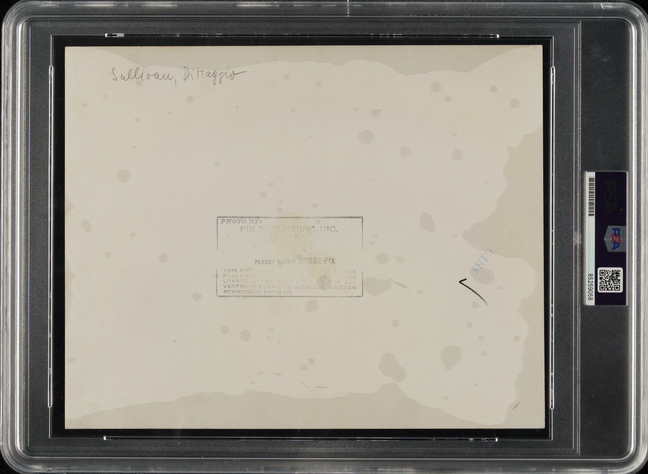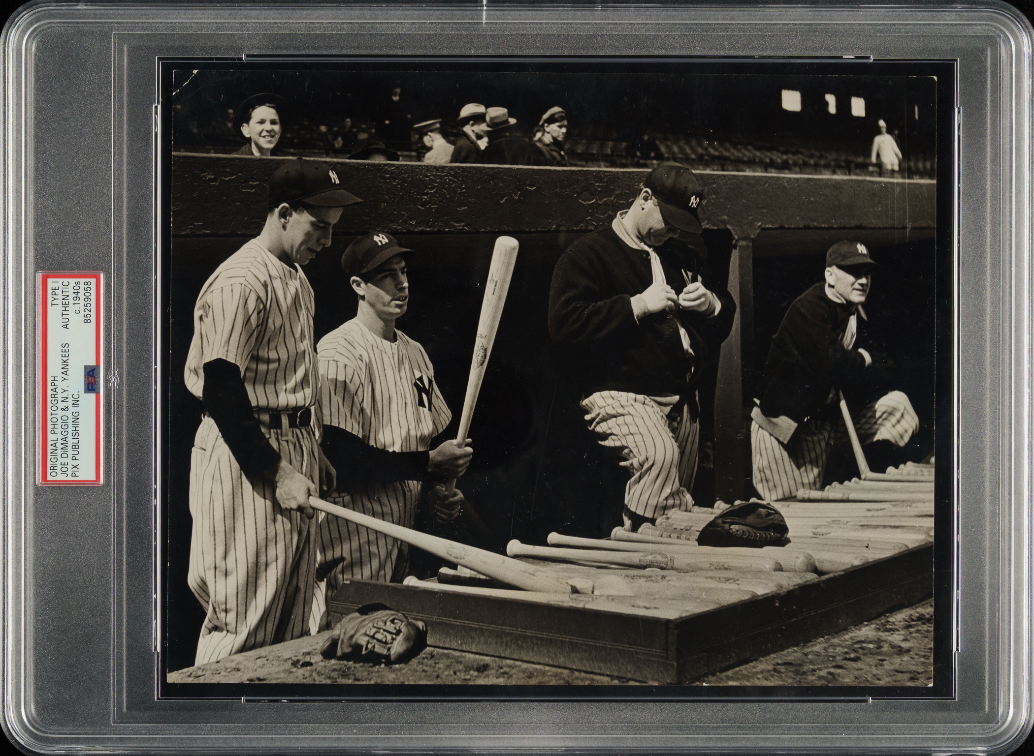 Original news photo of Hall of Fame outfielder Joe DiMaggio as a member of the New York Yankees, circa 1940s. Encapsulated and certified as an original Type I photograph by PSA/DNA. The photo captures DiMaggio selecting a bat from the dugout bat rack. A "Pix Publishing Inc." credit stamp and the handwritten names of "Sullivan" and "DiMaggio" appear on the reverse. The photo (9.75 x 7.75 inches) has a few small creases. Very Good to Excellent condition overall.