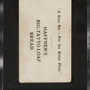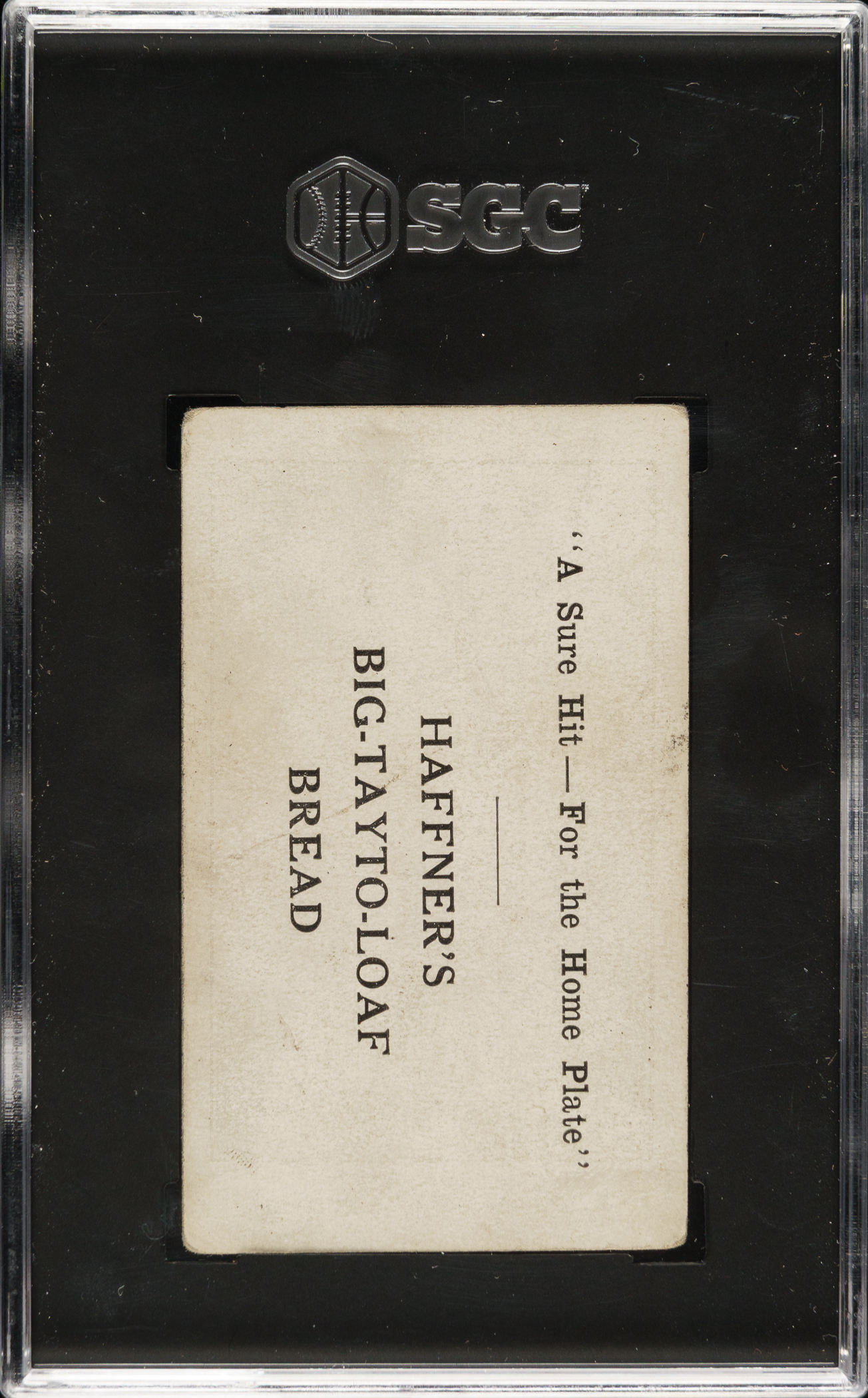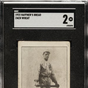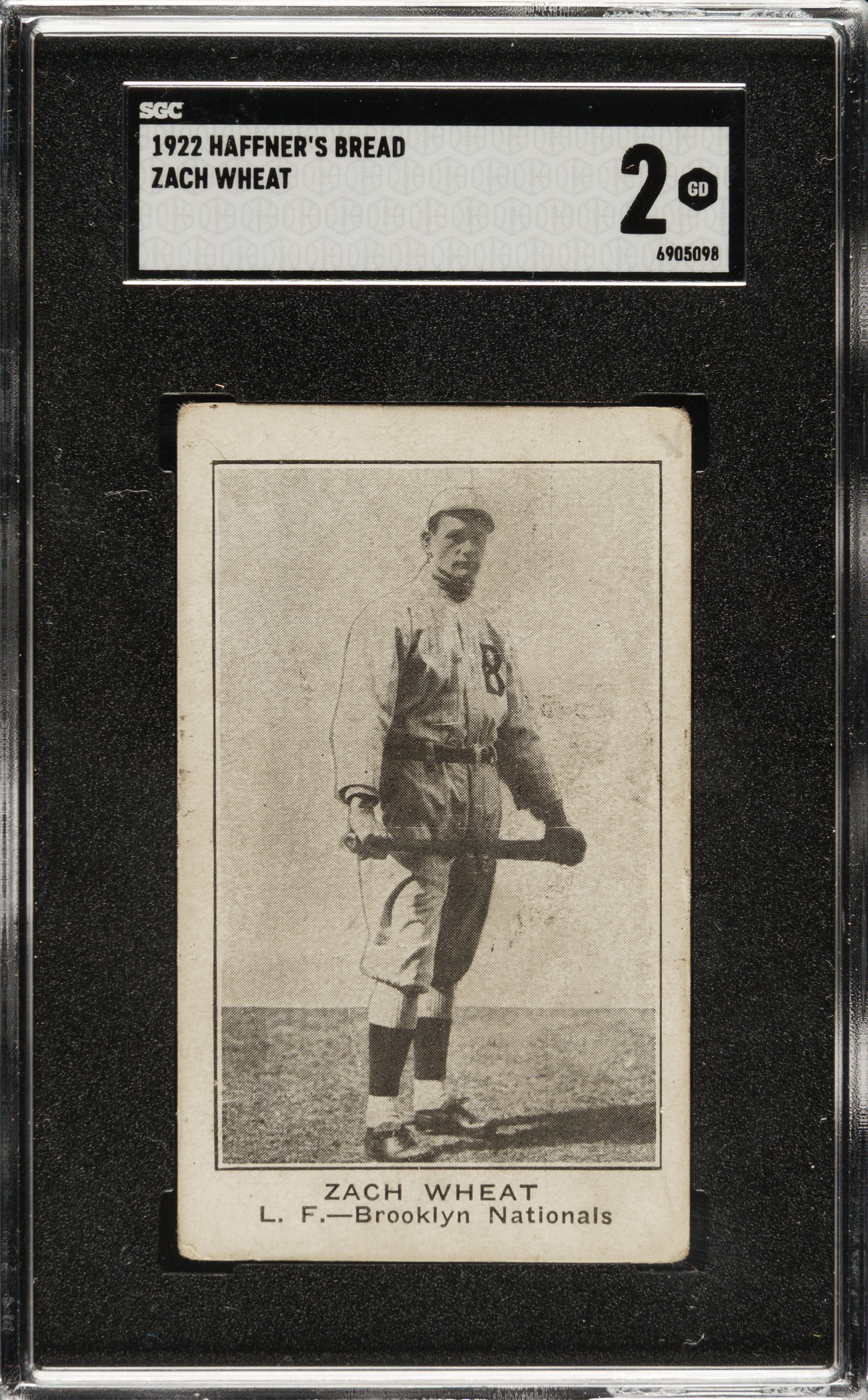 Graded GOOD 2 by SGC. Extremely scarce card of Hall of Famer Zach Wheat (Brooklyn Robins) from the 1922 Haffner’s Bread set. Haffner's Bread cards share the same fronts with W575-1 strip cards, which are blank-backed. Several bakeries used W575-1s as promotional vehicles, including Gassler, Clark, and Haffner, each of which is particularly rare. The W575-1 set is very similar in nature to the American Caramel Company E121 issue as both sets feature the same design and likenesses for many of the players included. This is a remarkable sample, only the fifth of its kind that we can recall ever offering. The card displays a strong image and even wear to the corners. The Haffner’s Bread advertising reverse is boldly printed, which is the ideal for a rare advertising back. A rarely seen Haffner’s Bread example that would be an outstanding addition to any Hall of Fame-card or Brooklyn Robins (Dodgers) collection.