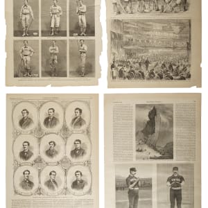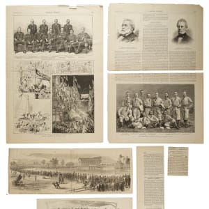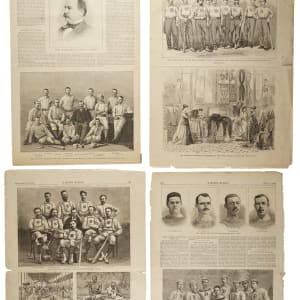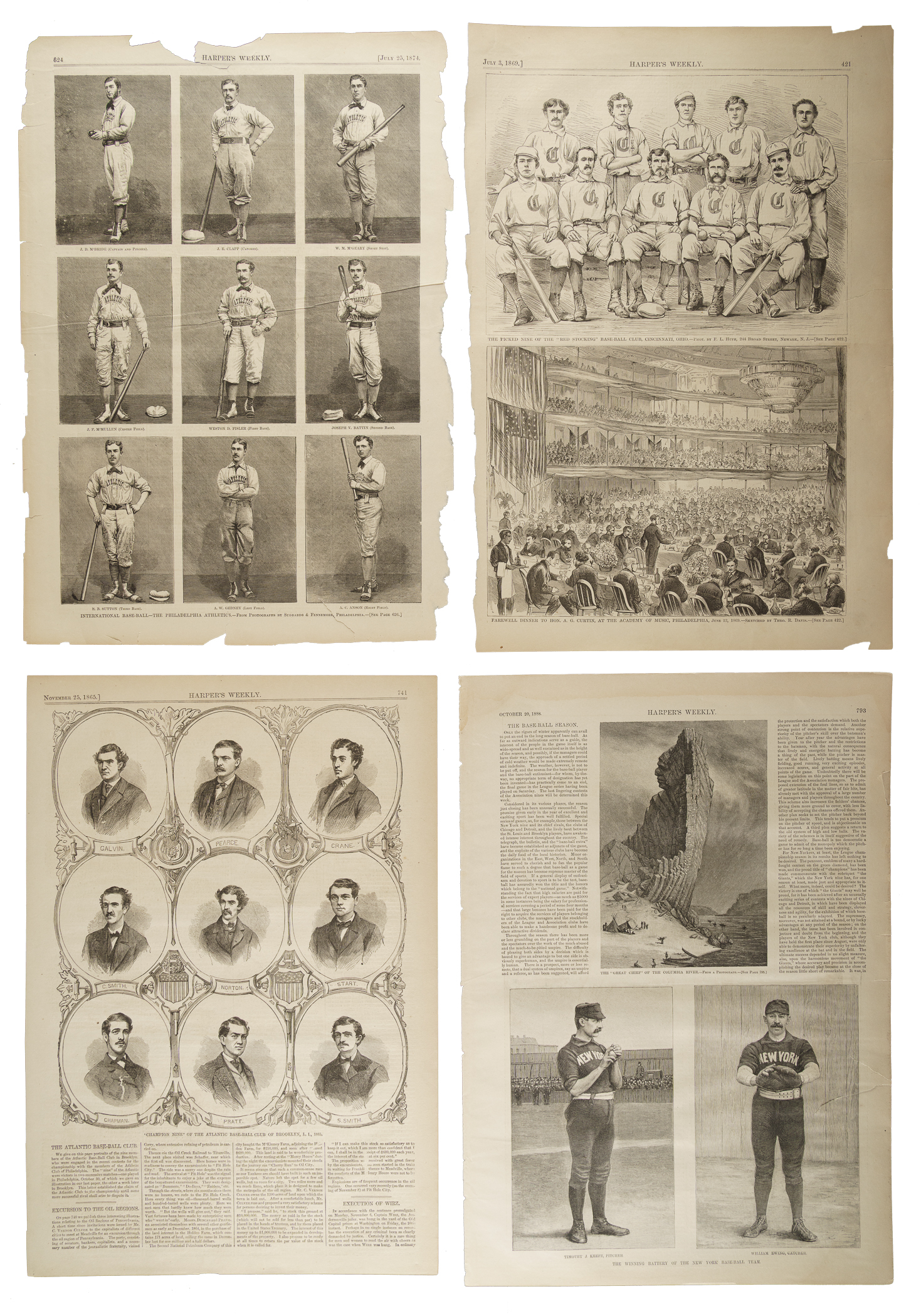During the 19th century, most baseball fans were acquainted with the game's top stars and clubs by the wonderful woodcut illustrations appearing in various illustrated newspapers of the day, one of the most prominent of which was Harper's Weekly. Today, those illustrations are highly prized by collectors, both for their aesthetic appeal, and for the fact that they are much more affordable than actual photographs from the period. As such, woodcut illustrations have always represented perhaps the finest value of all 19th century baseball items. Offered is a sizable collection of 12 different Harper's Weekly baseball woodcuts spanning the years 1865 to 1888. This collection consists of the following: 1) 11/18/65 (match game between the Philadelphia Athletics and Brooklyn Atlantics); 2) 11/25/65 (portrait images of the Brooklyn Atlantics including Dicky Pearce); 3) 10/26/67 (illustration of the Union Base Ball Club of Morrisania, N.Y.); 4) 7/3/69 (illustration of the 1869 Red Stockings, baseball's first all-professional team); 5) 7/24/69 (presentation of a champion bat to the Red Stockings); 6) 7/25/74 (individual images of the Philadelphia Athletics); 7) 9/12/74 (illustration of the Maple Leaf Base Ball Club of Canada); 8) 5/14/81 (illustration of the Princeton College Base Ball Nine); 9) 8/5/82 (illustration of the Metropolitan Nine); 10) 9/30/82 (illustration of the Providence Base Ball Club); 11) 10/13/83 (illustration of the Boston Base Ball Club); and 12) 10/20/88 (illustrations of Tim Keefe and Buck Ewing). The woodcut illustrations display normal wear commensurate with their age and fragile nature, including minor edge tears/chipping. A few have also been slightly trimmed. They range in grade from Pr to Good, averaging Fair. Pages average 11 x 15.5 inches. Total: 12 woodcuts. The size/weight of this item requires that there will be an additional shipping charge for this lot.