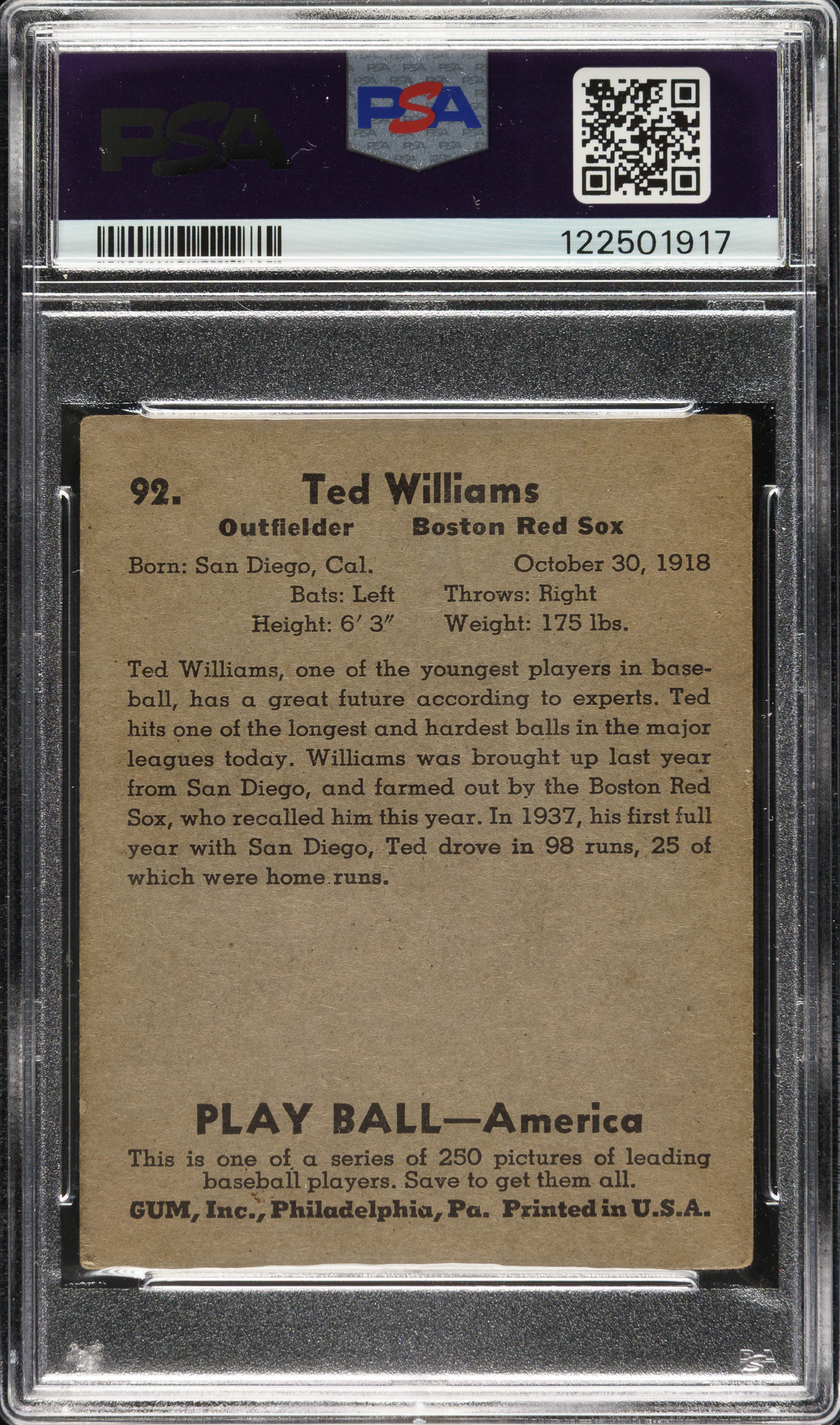 Graded GOOD+ 2.5 by PSA. Very attractive mid-grade example of Boston Red Sox Hall of Famer Ted Williams' rookie card from the popular 1939 Play Ball set. The 1939 Play Ball Ted Williams rookie is one of vintage-card collecting's classics. This card has superb image quality and honest corner wear. Clean reverse with bold black text.