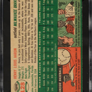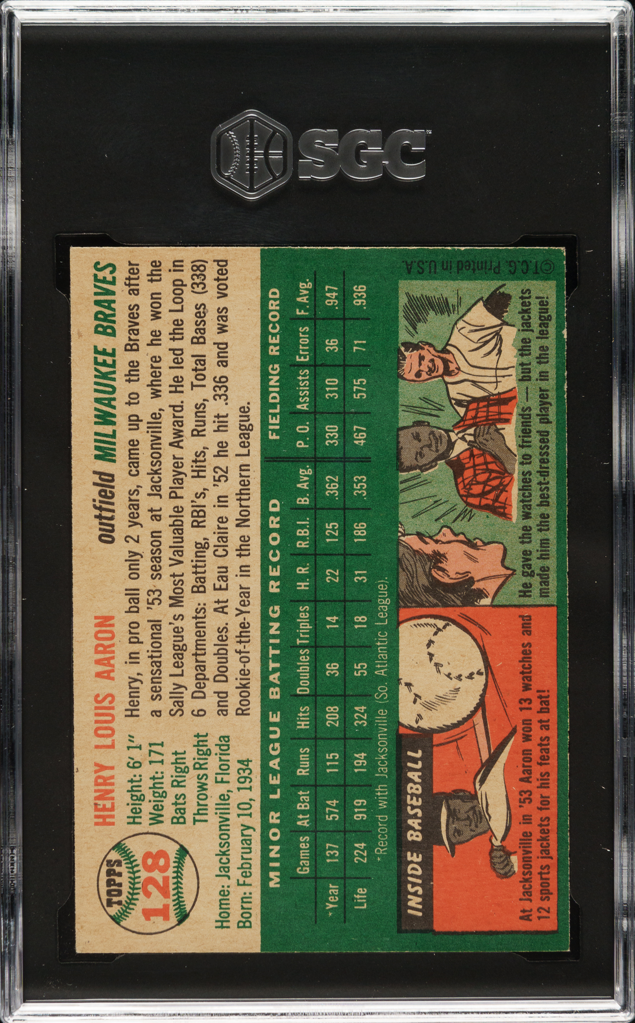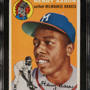 Graded EX 5 by SGC. Attractive mid-grade example of Milwaukee Braves Hall of Famer Hank Aaron's rookie card. One of card collecting's classics, Aaron's rookie card is the key to the 1954 Topps set and one of the most popular of all postwar baseball cards. The card has vibrant colors, outstanding registration, and strong corners with light touches of wear. Clean reverse.