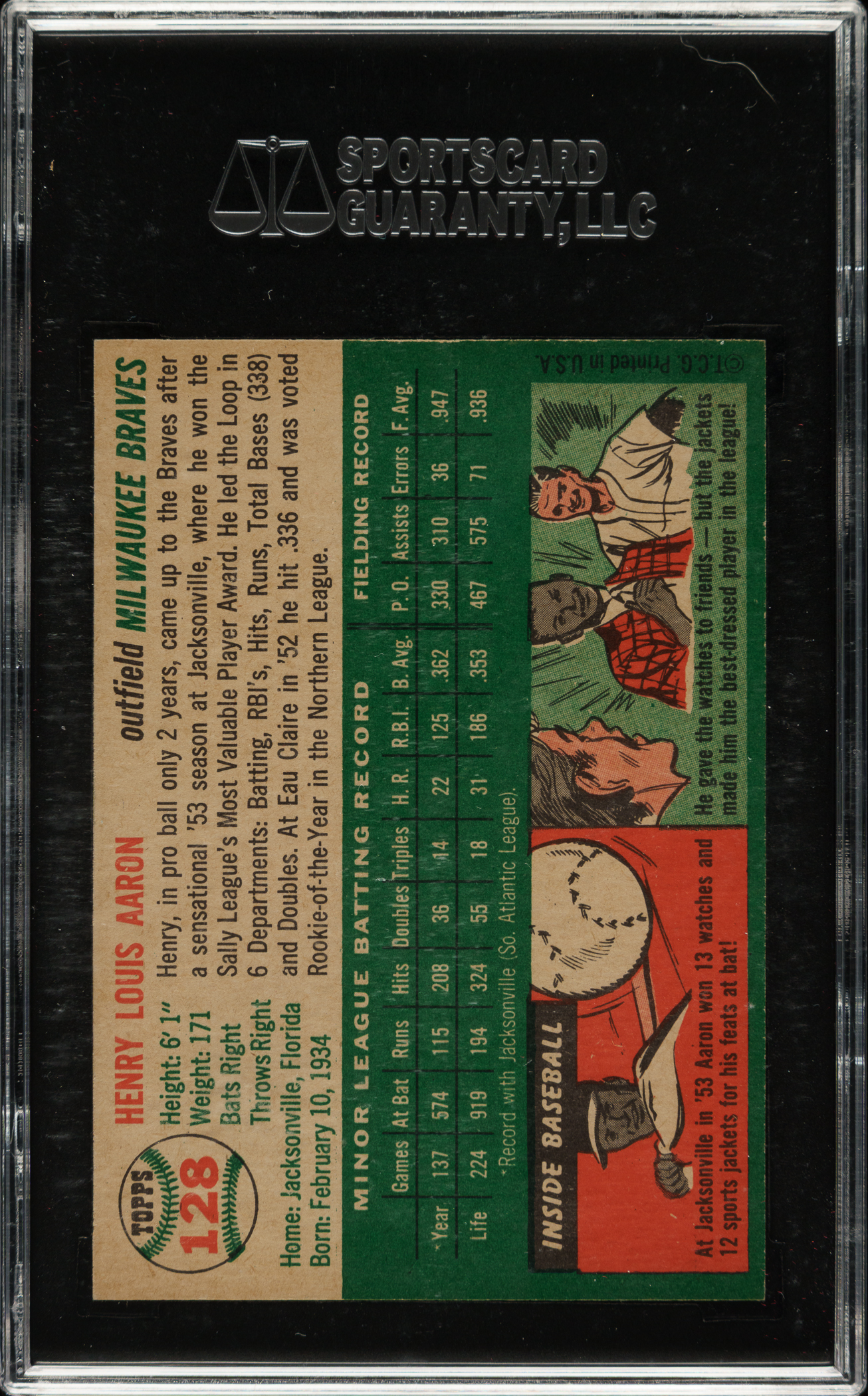 Graded MINT 9 by SGC. One of only five examples graded at this level with none higher out of 2,717 cards evaluated by SGC to date. Stunning ultra-high-grade rookie card of Hall of Famer Hank Aaron from the classic 1954 Topps series. Hank Aaron's rookie card is one of the most famous and iconic cards in all of collecting and is naturally a favorite of many collectors. But it is rarely found in this superb high-grade. This is one of the finest examples of this classic card that we have ever seen or offered! The card exhibits four sharp corners, perfect gloss, crisp flawless registration, a bright and clean front and back, no printing defects, and extraordinarily vibrant colors. Clean and boldly printed reverse with a crisp green border free of any chipping. Aaron is one of the key cards to the 1954 Topps set and is one of four Hall of Fame rookies making their Topps debut that year (Banks, Kaline, and Lasorda are the other three). The market for ultra-high-grade 1954 Topps #128 Aaron rookies has soared to new levels, with a recent sale of $384,000 reported for a MINT 9 example. This is a gorgeous example of Hank Aaron's rookie card, which would be a significant addition to any world-class 1954 Topps set or Hall of Fame rookie-card collection.